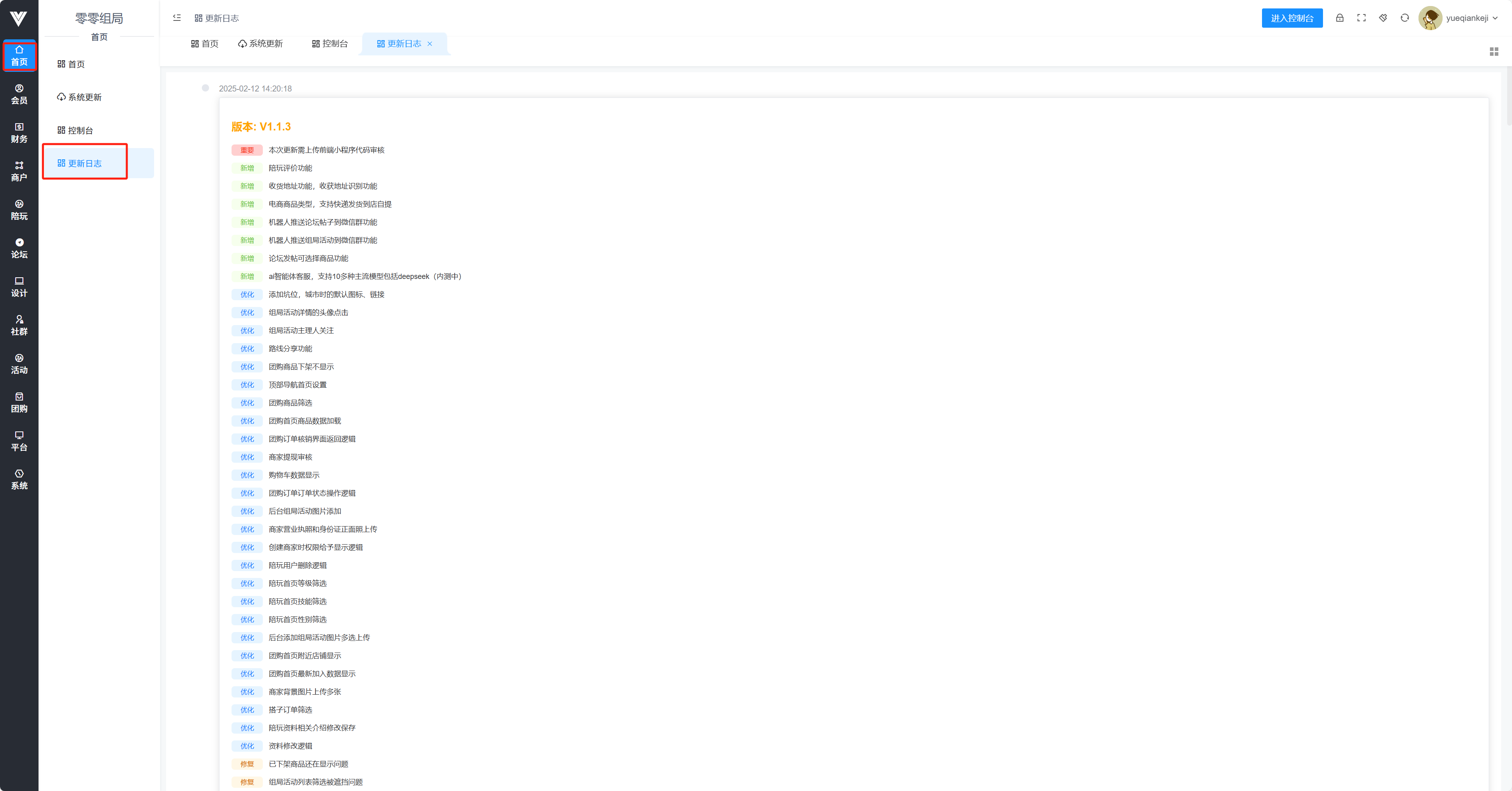 首页这里可以查看一些基础数据统计,还有更新功能一以及更新的日志,基础的数据统计如下图所示,包括销量,组局和旅游两个模式的销量和订单,还有小程序的活跃用户量,余额排行是对用户余额进行排列的表单,趋势一栏会显示10天内的用户新增数  系统更新一栏下面可以进行组局系统的更新,只需要顺序点击下载更新包,解压更新包,更新数据库三步即可完成更新,在点击每一步之后需要等一段时间等待指令执行完毕,会有对应提示  控制台这里可以设置高德地图key和腾讯地图key,还有备案号等信息  更新日志一栏就显示了每一次更新的具体内容日志,会按照版本进行排列