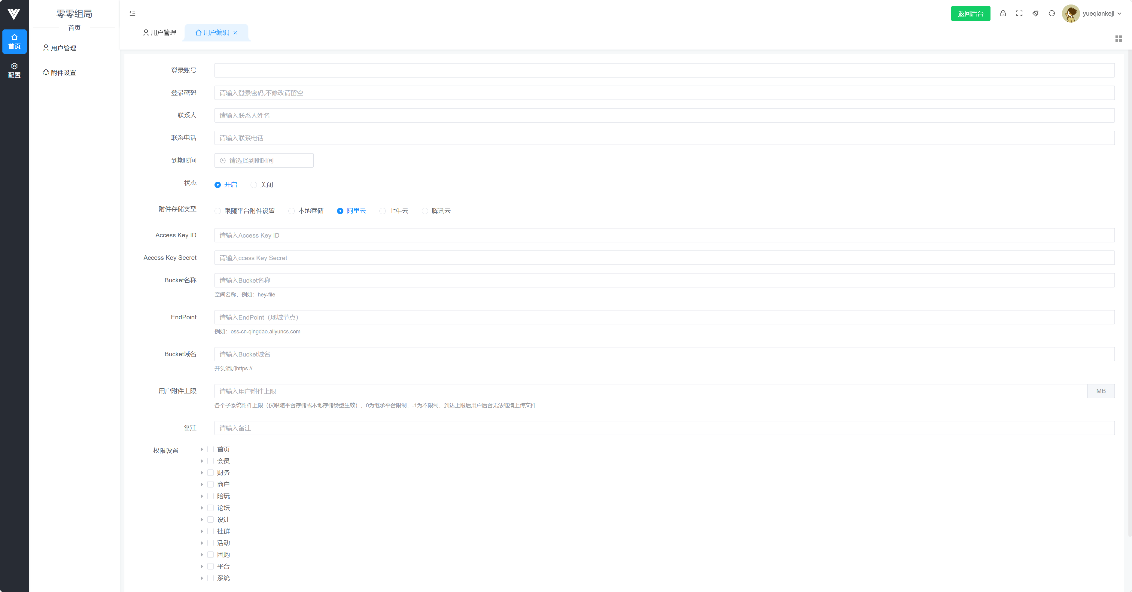 这里可以创建坑位  点击添加之后,创建时候的设置项如下,包括坑位的账号密码,附件存储,还有权限等  附件存储所需的信息请参考教程 对象存储配置,如果选择跟随平台附件设置的话,平台的附件设置在左边附件设置处进行设置,本地存储则是直接存储到服务器上
