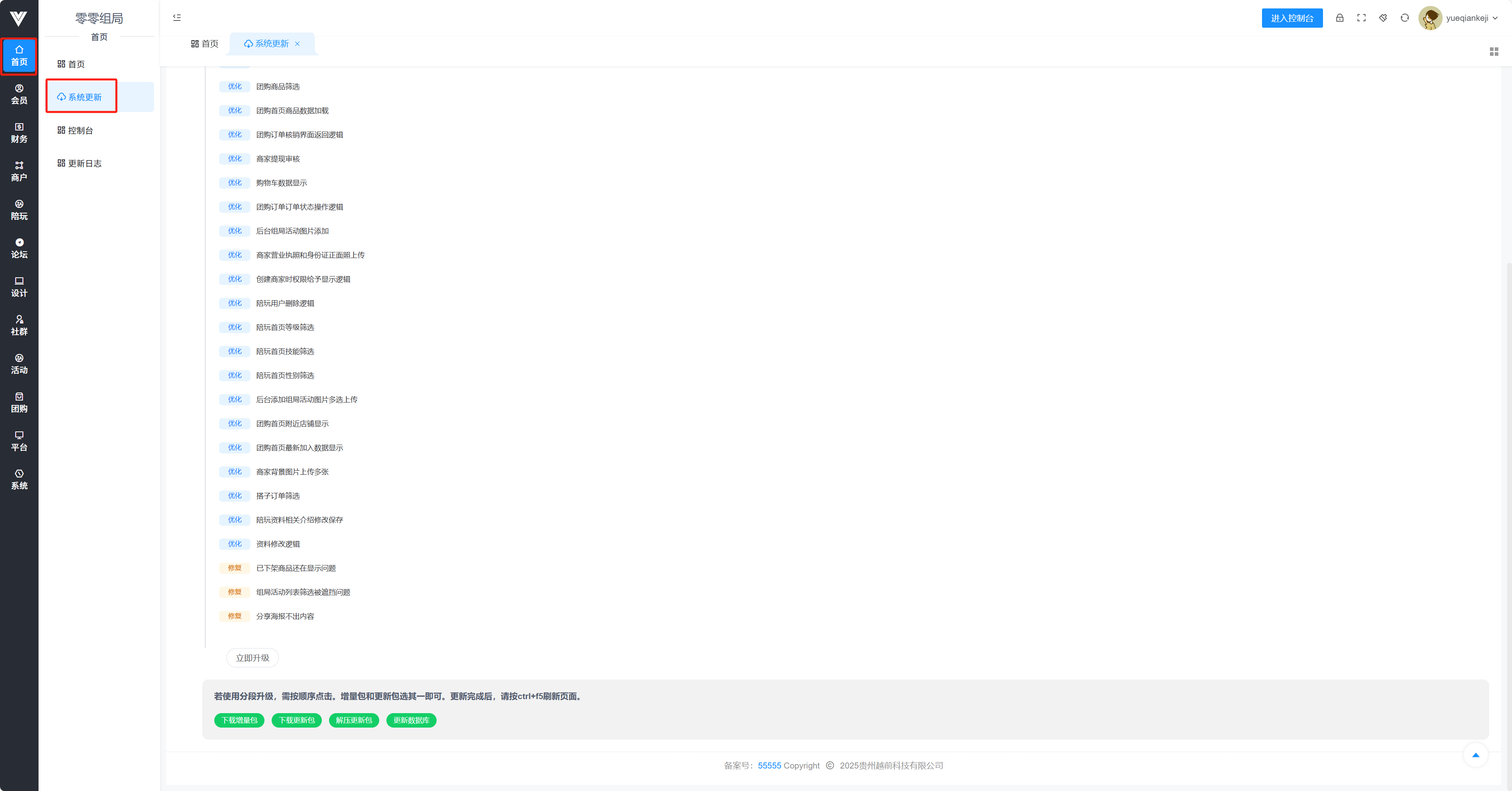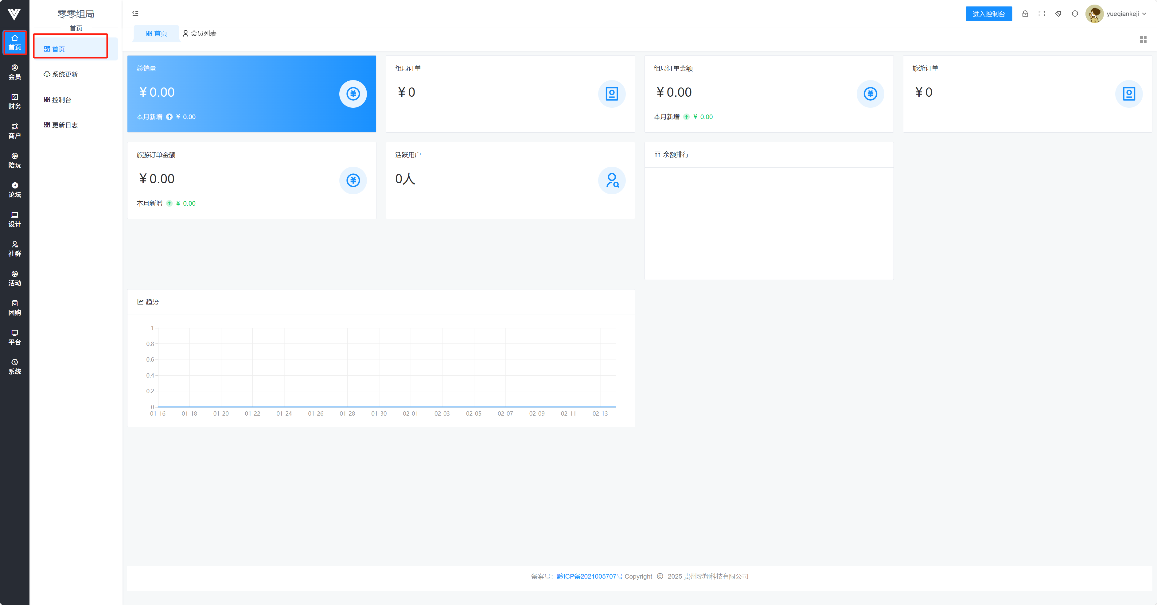首页这里可以查看一些基础数据统计,还有更新功能一以及更新的日志,基础的数据统计如下图所示,包括销量,组局和旅游两个模式的销量和订单,还有小程序的活跃用户量,余额排行是对用户余额进行排列的表单,趋势一栏会显示10天内的用户新增数  系统更新一栏下面可以进行组局系统的更新,只需要顺序点击下载更新包,解压更新包,更新数据库三步即可完成更新,在点击每一步之后需要等一段时间等待指令执行完毕,会有对应提示  控制台这里可以设置高德地图key和腾讯地图key,还有备案号等信息  更新日志一栏就显示了每一次更新的具体内容日志,会按照版本进行排列