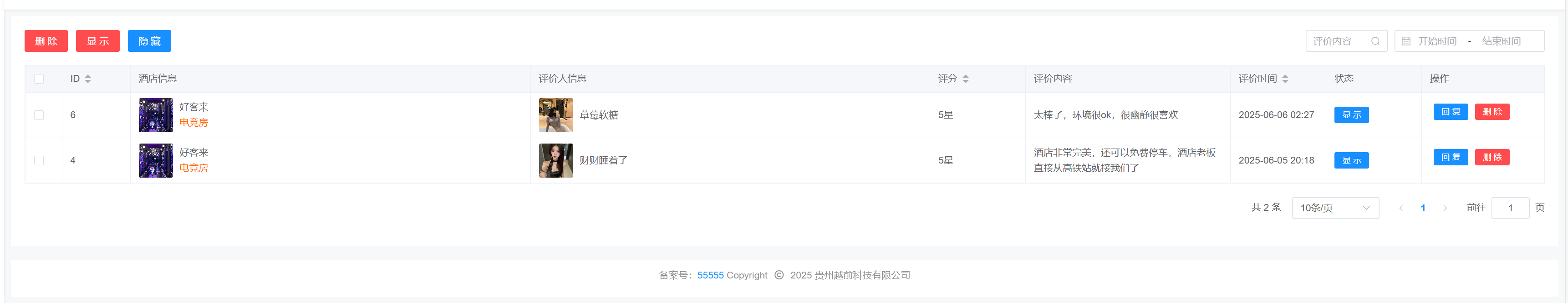 可查看用户关于订单的所有评价,如下图所示,可删除订单,可显示隐藏评价