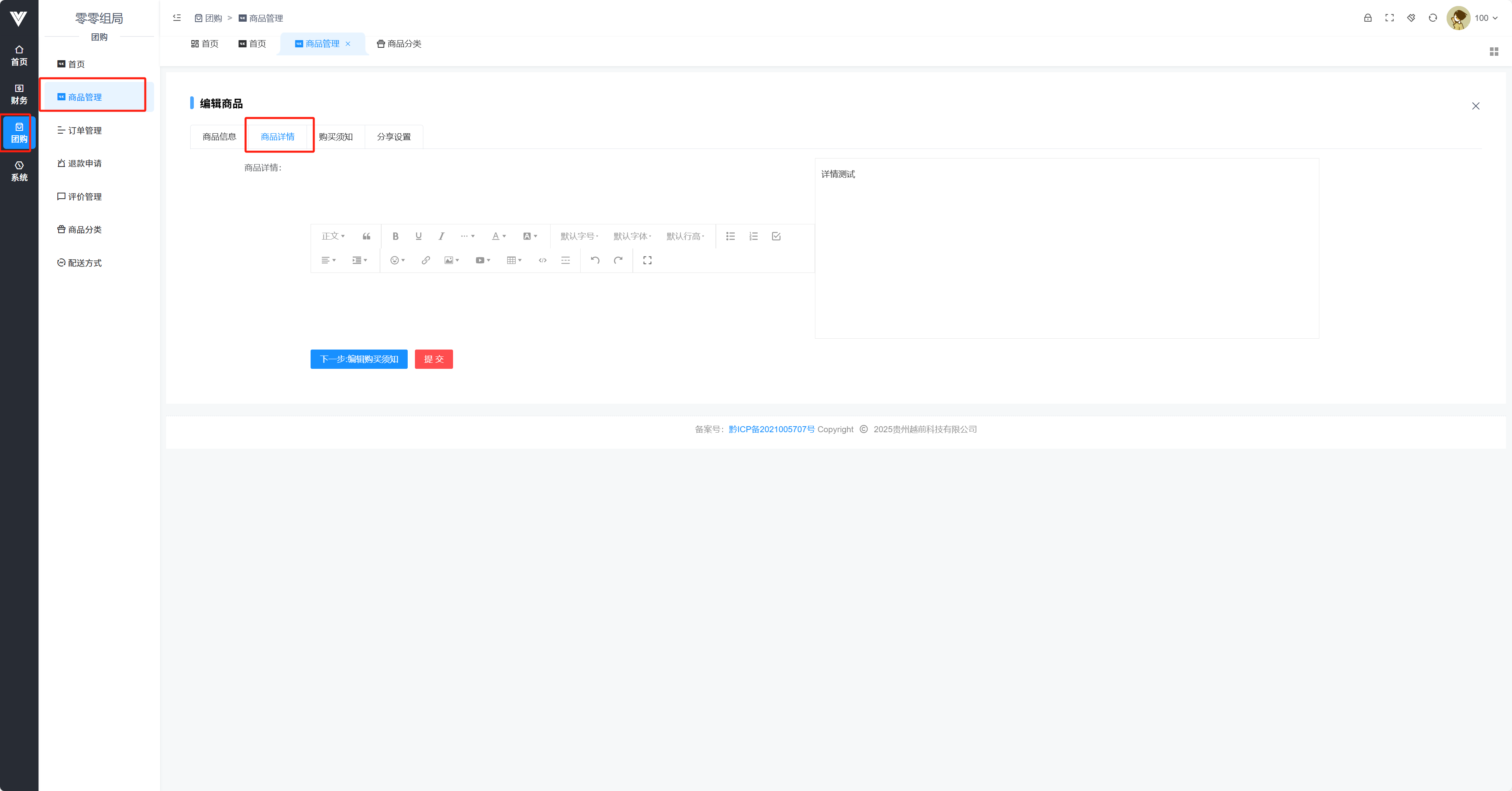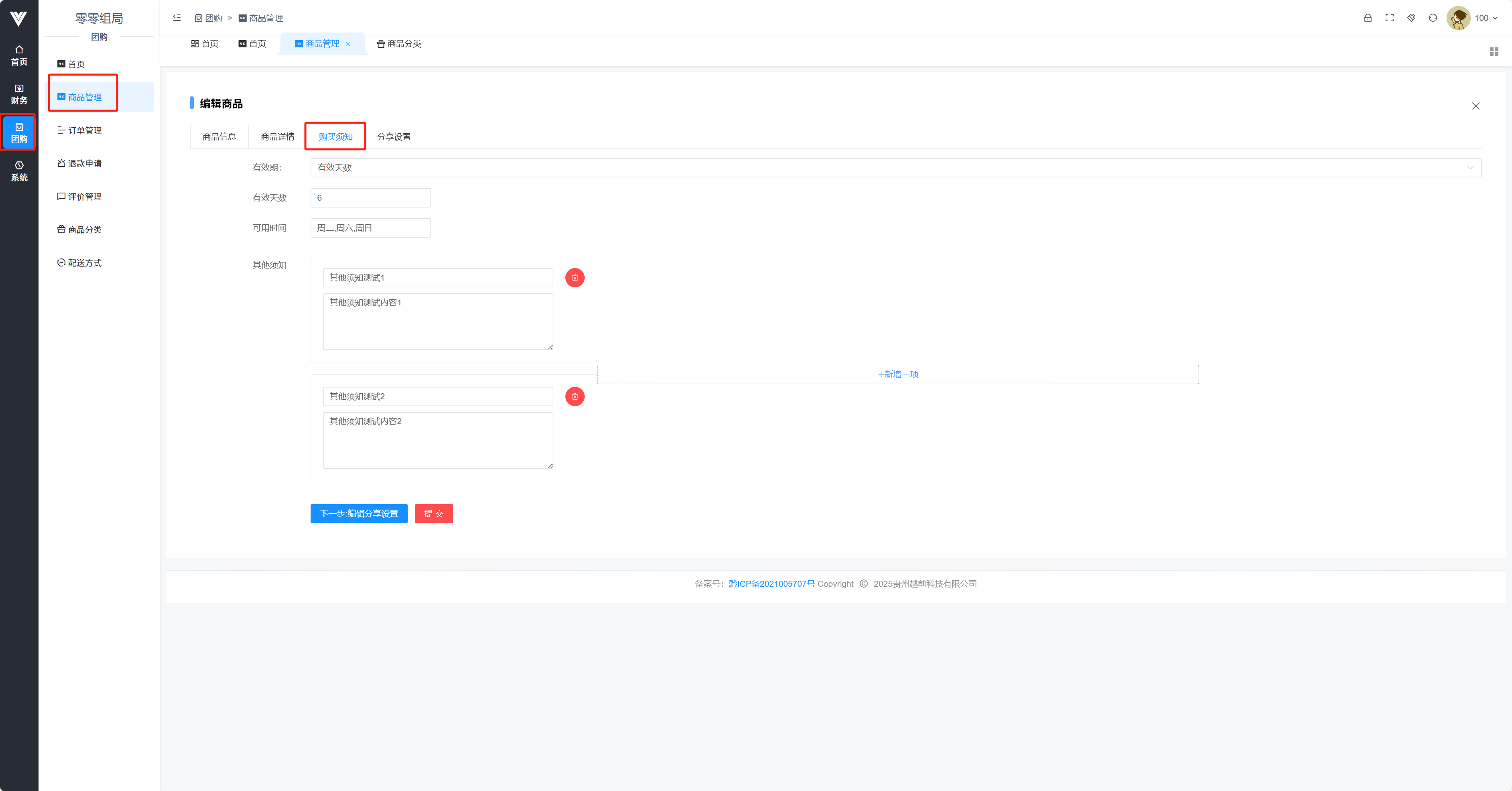 此处显示商家的商品,注意如果是商家后台,那么只会显示本商家的商品,如果是城市或者平台后台,那么会显示旗下的所有商家的商品  点击添加时候的设置项如下图所示  在商品信息内设置商品的基础信息,包括名称,商品组图,商品视频,商品分类(需要在左边商品分类内设置之后才可选择),商品卖点(可显示在小程序商品名字下),商品及标签(会显示在商品logo旁),销量,库存,起售数量,限购,还有上架状态 在团购套餐内可以设置套餐内容  普通模式可以设置商品规格  商品类型(有两种,普通和团购,团购类型到店核销,普通可以选择快递方式) 商品详情如下图所示,可以设置富文本和图并对其进行一定编辑  购买须知如下图所示,可以设置有效天数,核销码可用日期以及其他须知
