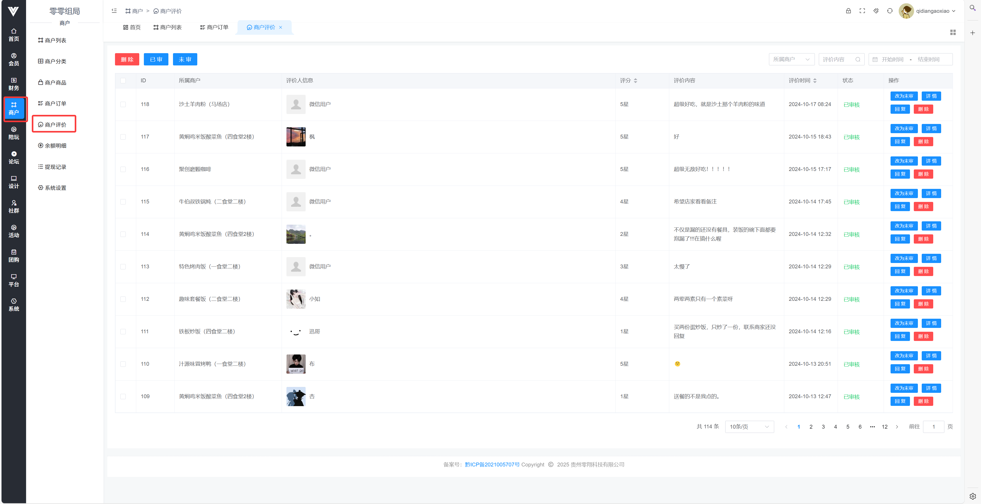 在此处显示的是订单完成之后用户对商品进行的评价列表,可以对评价进行审核,回复,删除,查看等操作,注意评论不可被编辑