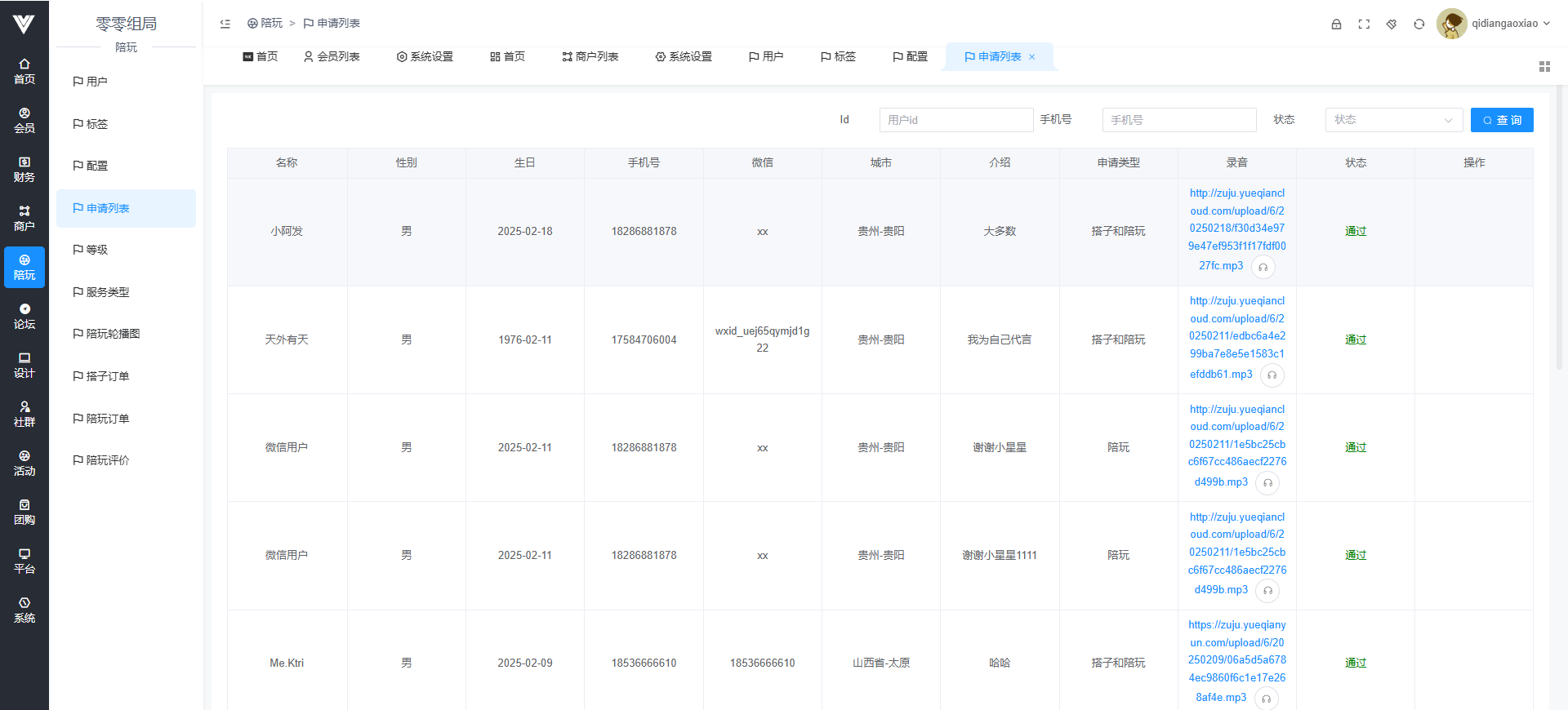 申请列表可以查看用户申请成为陪玩和搭子的申请请求,并进行审核,可以查看的有用户名字,性别,生日,手机号,微信,所在城市,申请的自我介绍,申请想成为的类型,以及上传的录音,审核的状态以及审核操作