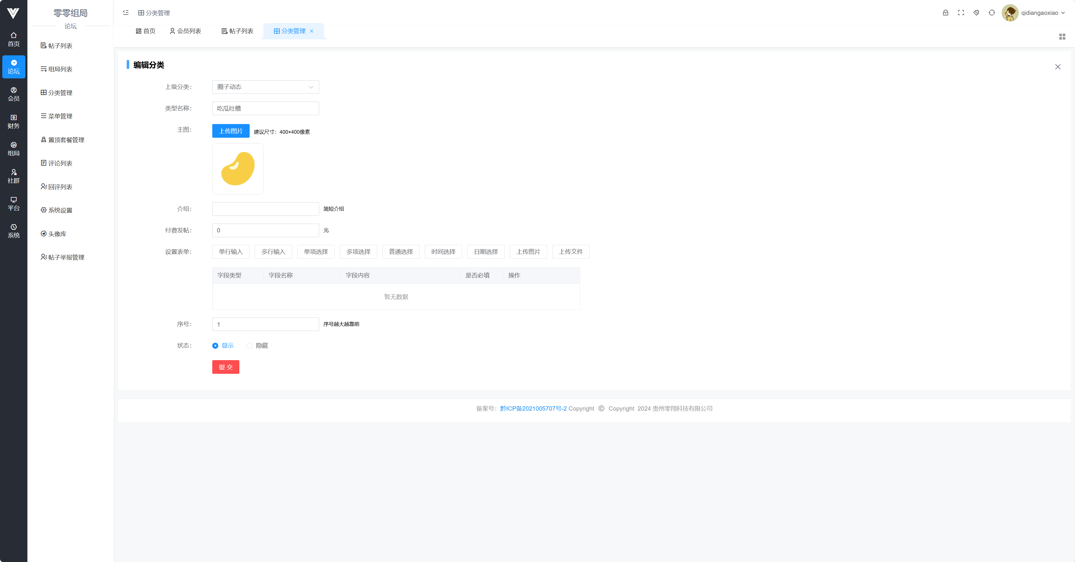 分类管理是管理论坛的各个帖子分类,可以进行添加,编辑,删除,以及顶级分类和子分类管理,每个分类对应的图标,在付费发帖处设置费用之后,需要付费结束之后才可以发帖,自定义表单可以让用户在发帖时输入对应的信息,这个信息会在帖子详情内进行显示