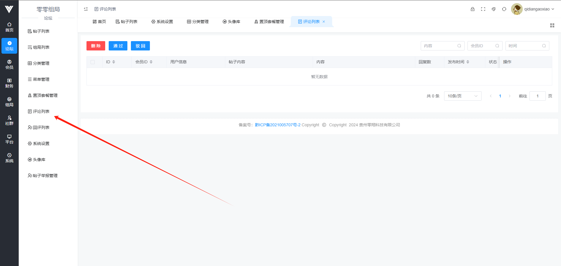 评论列表 在此处查看用户给帖子的评论,如果开启评论审核也是在此处审核,可以对评论进行删除,驳回等操作