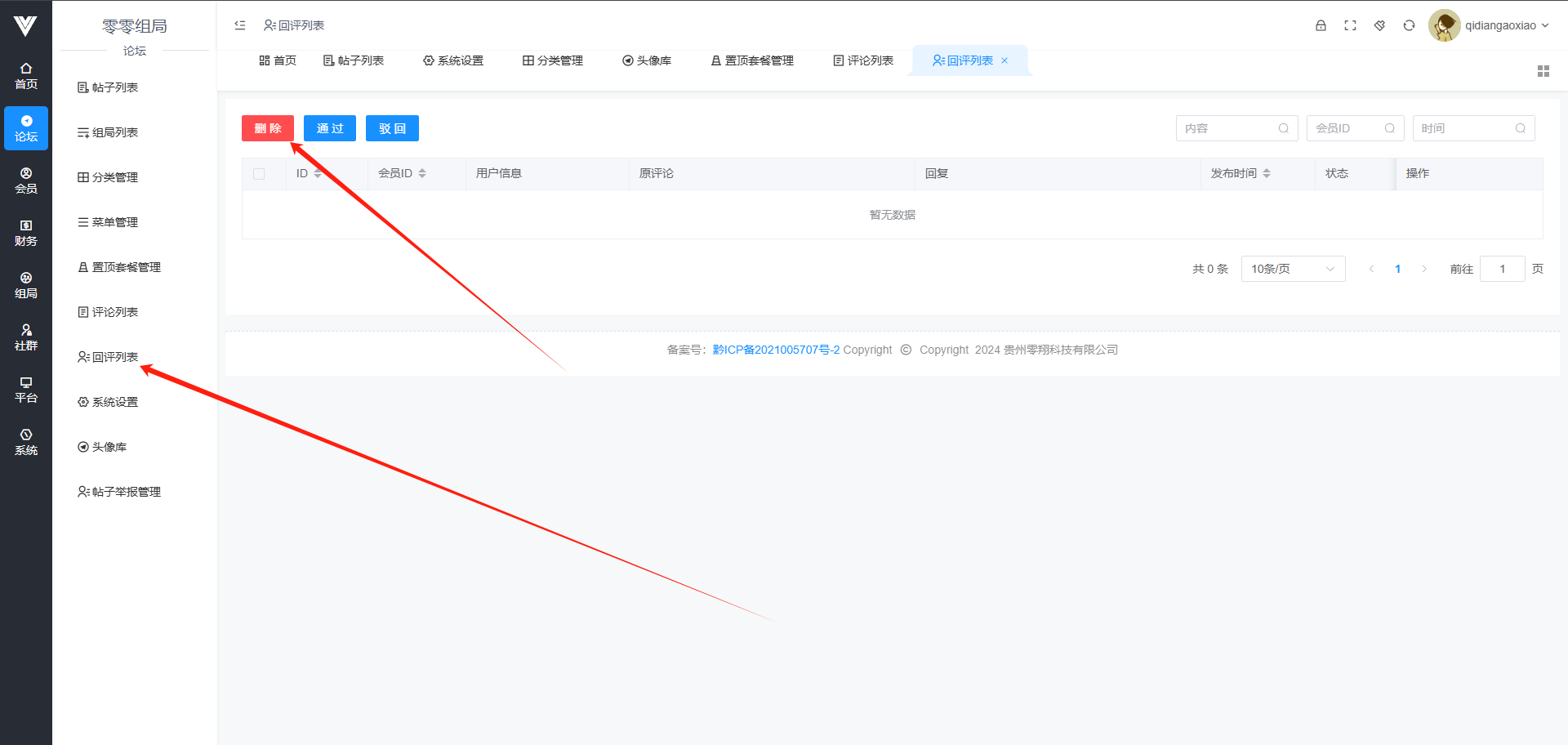 回评列表 查看帖主对其他用户的评价消息以及审核,点击用户头像可以进行禁言操作