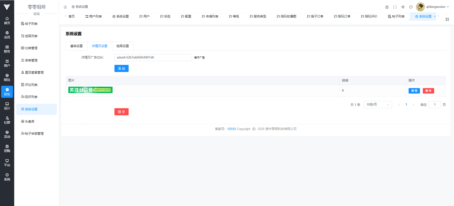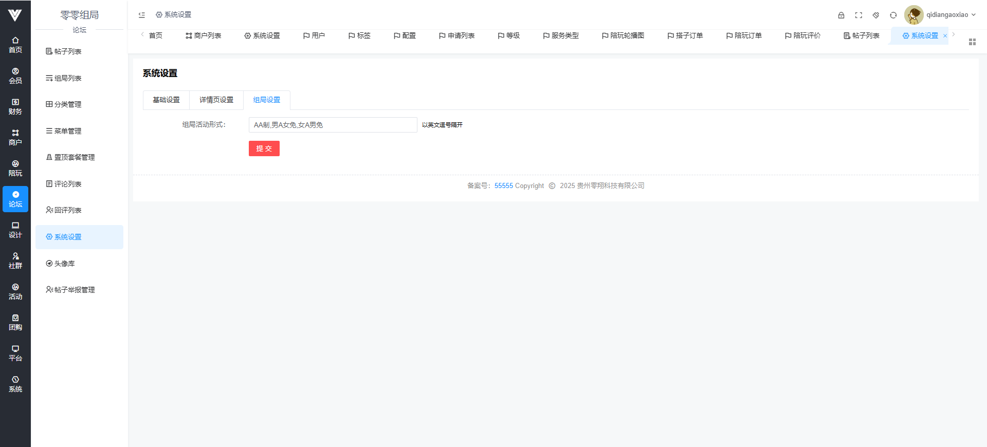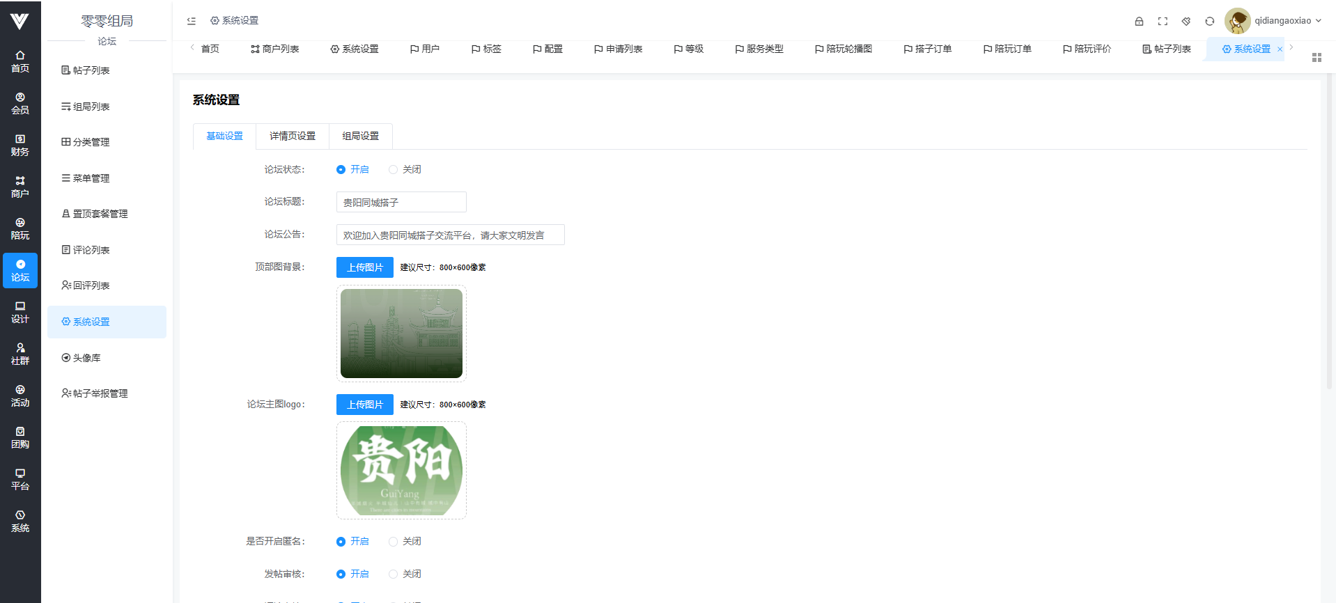 论坛系统设置相关选项在此处进行 首先是基础设置,基础设置内容包括论坛开启状态,论坛标题,论坛公告,论坛顶部背景,论坛的主图logo,论坛是否可以匿名,发帖是否需要审核,评论是否需要审核,置顶套餐是否开启,百度文本审核是否开启,以及百度审核的相关信息填写,还有帖子浏览量显示,发帖的用户等级,需要注意的是,只有把百度审核的相关api信息填写之后,才可以在用户端使用智能识别地址功能  其次是论坛的详情页设置,论坛帖子点击进入之后就是详情页,可以设置广告和图片   最后是论坛的组局设置,在论坛里面还有一个微组局功能,主要是发帖,类型可以在这里设置,如下图所示