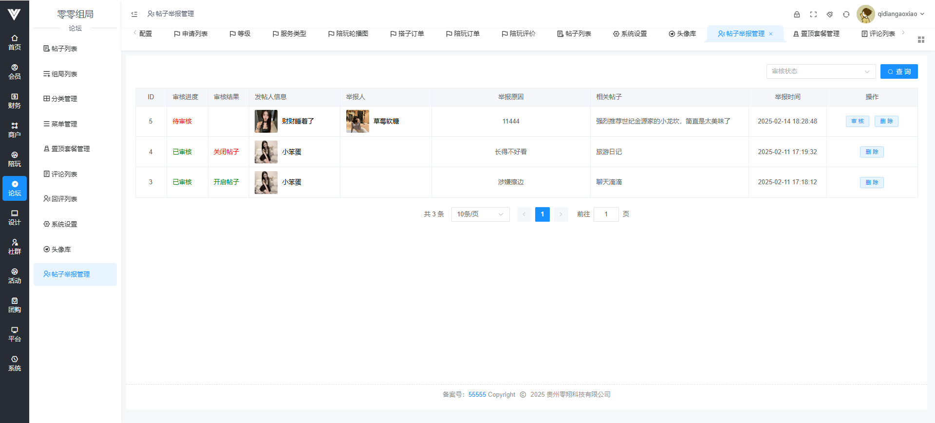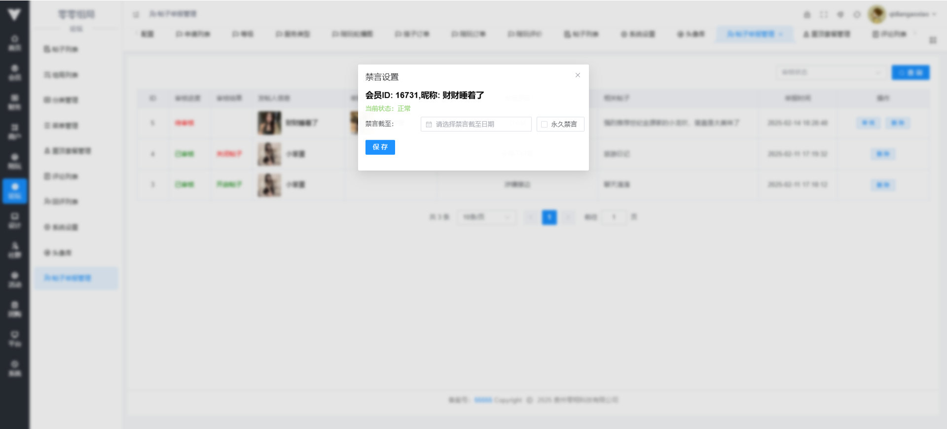 帖子举报管理可以对用户举报的帖子进行管理  点击发帖人可以直接进行禁言。禁言时间可以自定义,也可以审核用户的举报操作