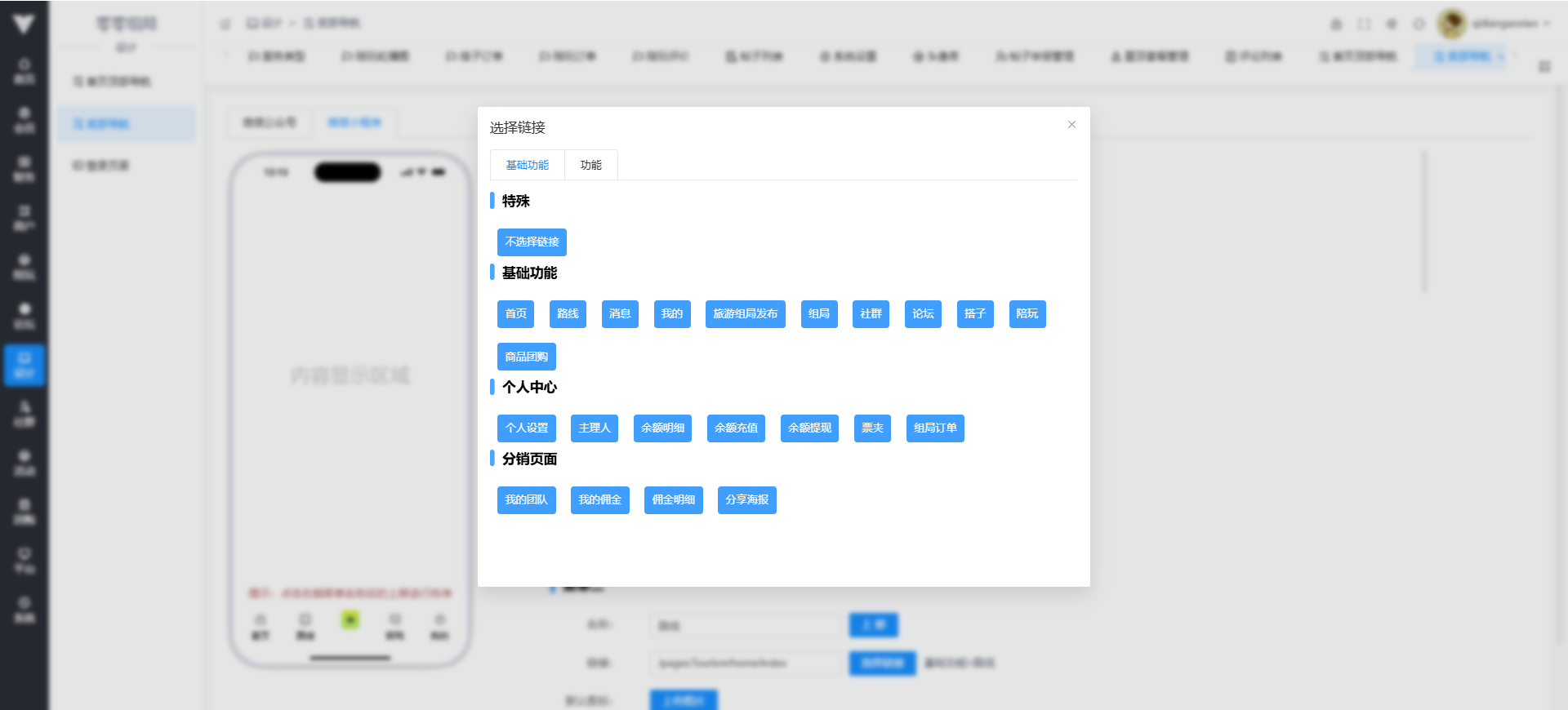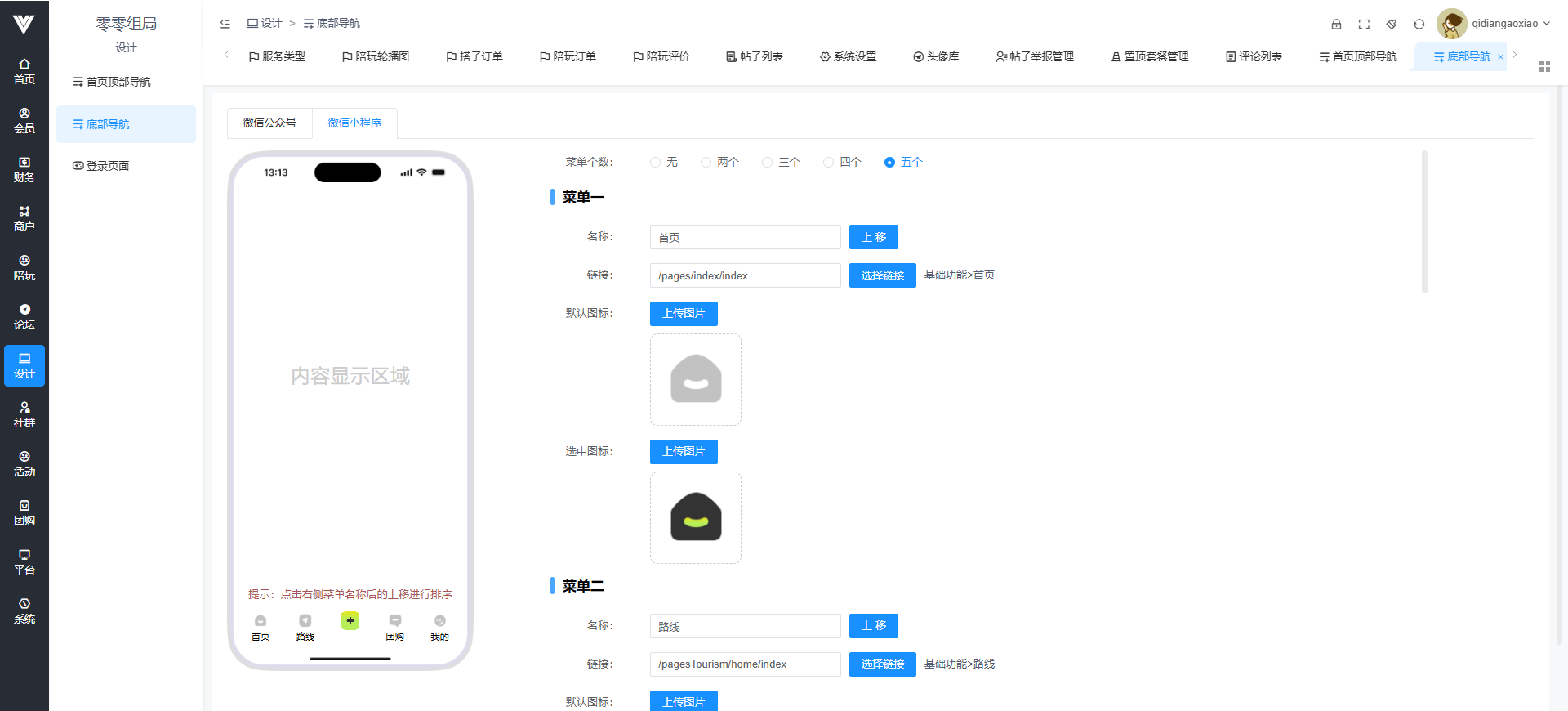 此处可以对小程序的底部导航栏进行设置,设置展示的个数,名字,图标和对应的跳转链接,同样也是点击后面选择链接,选择对应的页面进行设置即可