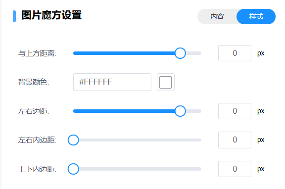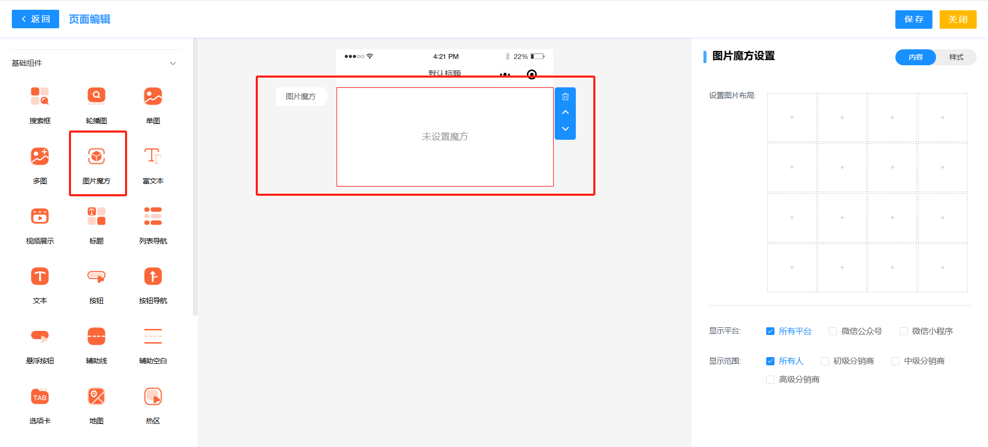 图片魔方组件是可以让图片显示可以不规则显示的组件  组件分为16个部分,可以任意把链接在一起的几个部分放一张图片并设置跳转链接 显示平台和展示人群就是是否展示在对应平台 展示人群就是设置哪些等级的人可以查看该组件  图片魔方组件样式如上图所示 与上方距离就是设置这个组件和上一个组件的距离 圆角度可以设置轮播图的原角度 背景颜色可以设置组件的背景颜色 左右外边距的意思就是组件距离页面左右边缘的距离设置 左右内边距就是组件距离边框左右边缘的距离 上下内边距则是组件距离边框上下边缘的距离