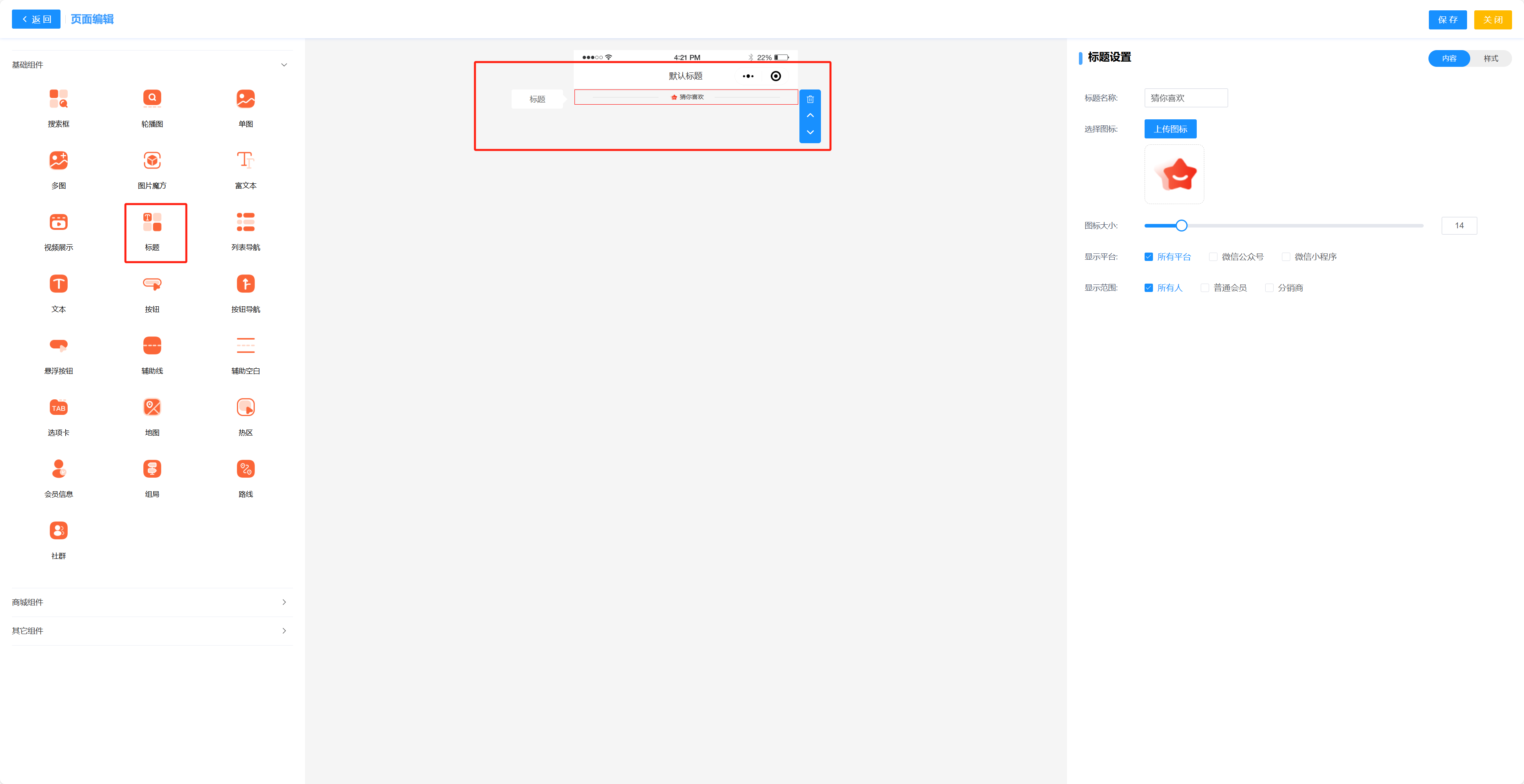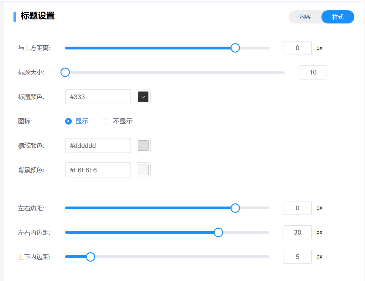 标题组件可以设置一个标题,并对其文字和图标进行设置,同时可以设置图标大小 显示平台和展示人群就是是否展示在对应平台 展示人群就是设置哪些等级的人可以查看该组件  标题组件样式如上图所示 标题大小可以设置组件标题的大小 标题颜色可以设置标题的颜色 图标可以设置组件内图标是否显示 横线颜色可以设置标题左右两边的横线颜色 背景颜色可以设置组件的背景颜色 与上方距离就是设置这个组件和上一个组件的距离 左右外边距的意思就是组件距离页面左右边缘的距离设置 左右内边距就是组件距离边框左右边缘的距离 上下内边距则是组件距离边框上下边缘的距离