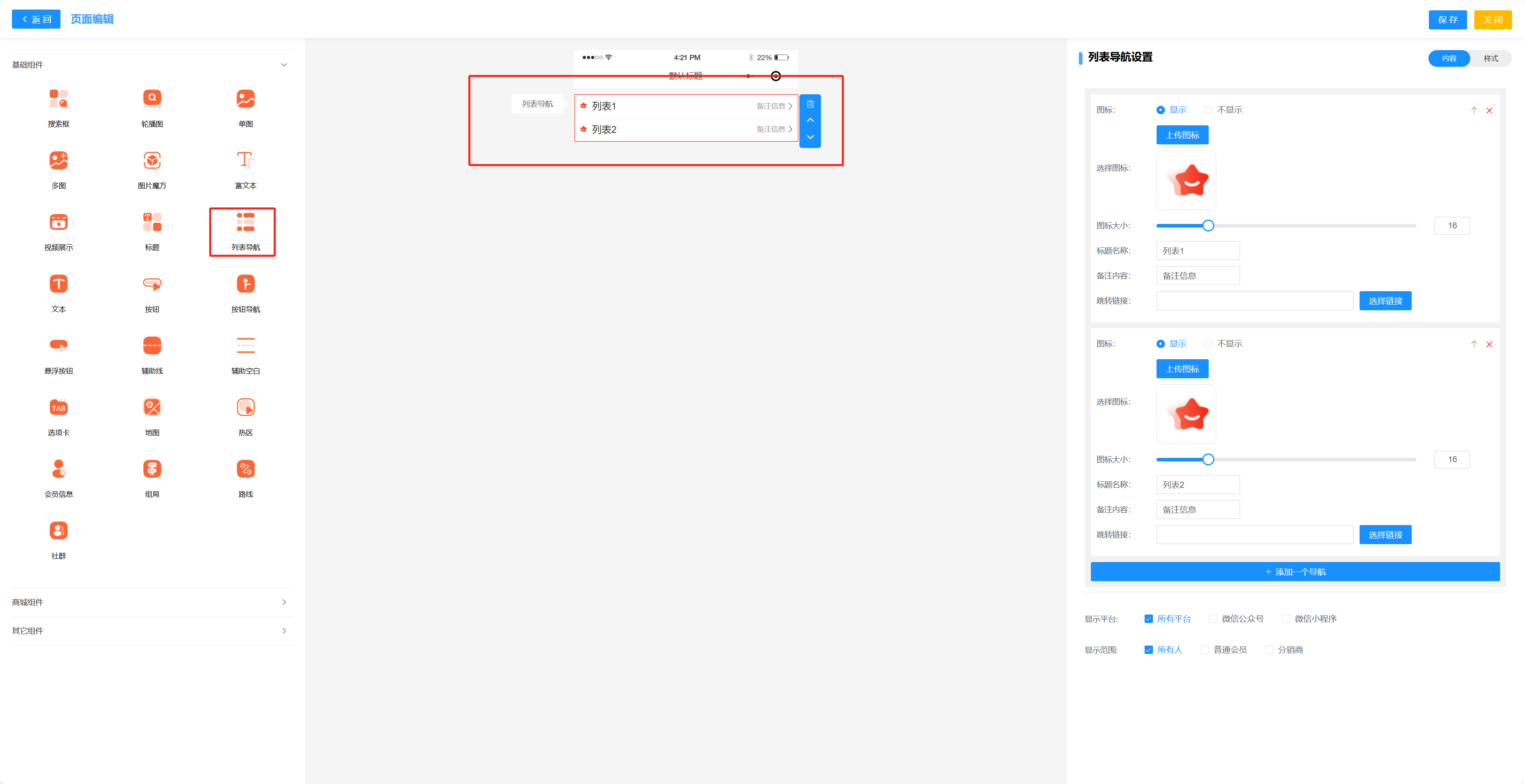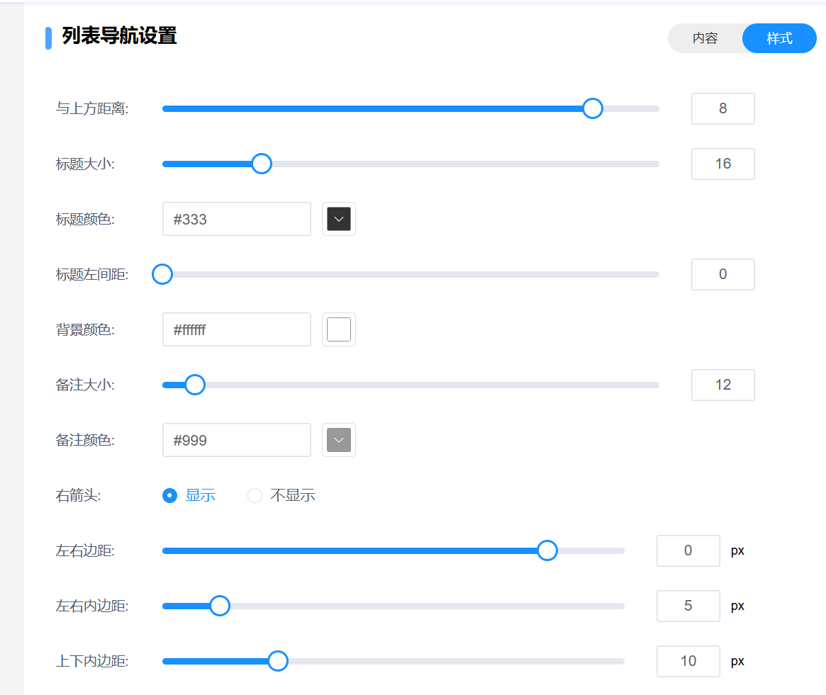 列表导航组件可以设置一个列表,每个列表都可以设置不同的图标和跳转链接以及标题 备注信息是在列表右边进行显示对文字信息,图标大小可以设置图标的大小 显示平台和展示人群就是是否展示在对应平台 展示人群就是设置哪些等级的人可以查看该组件  列表导航组件样式如上图所示 标题大小可以设置组件标题的大小 标题颜色可以设置标题的颜色 标题左间距可以设置标题文字距离图标的间距大小 备注大小可以设置备注信息的字体大小 备注颜色可以设置备注信息的字体颜色 右箭头可以设置列表的右箭头是否显示 背景颜色可以设置组件的背景颜色 与上方距离就是设置这个组件和上一个组件的距离 左右外边距的意思就是组件距离页面左右边缘的距离设置 左右内边距就是组件距离边框左右边缘的距离 上下内边距则是组件距离边框上下边缘的距离