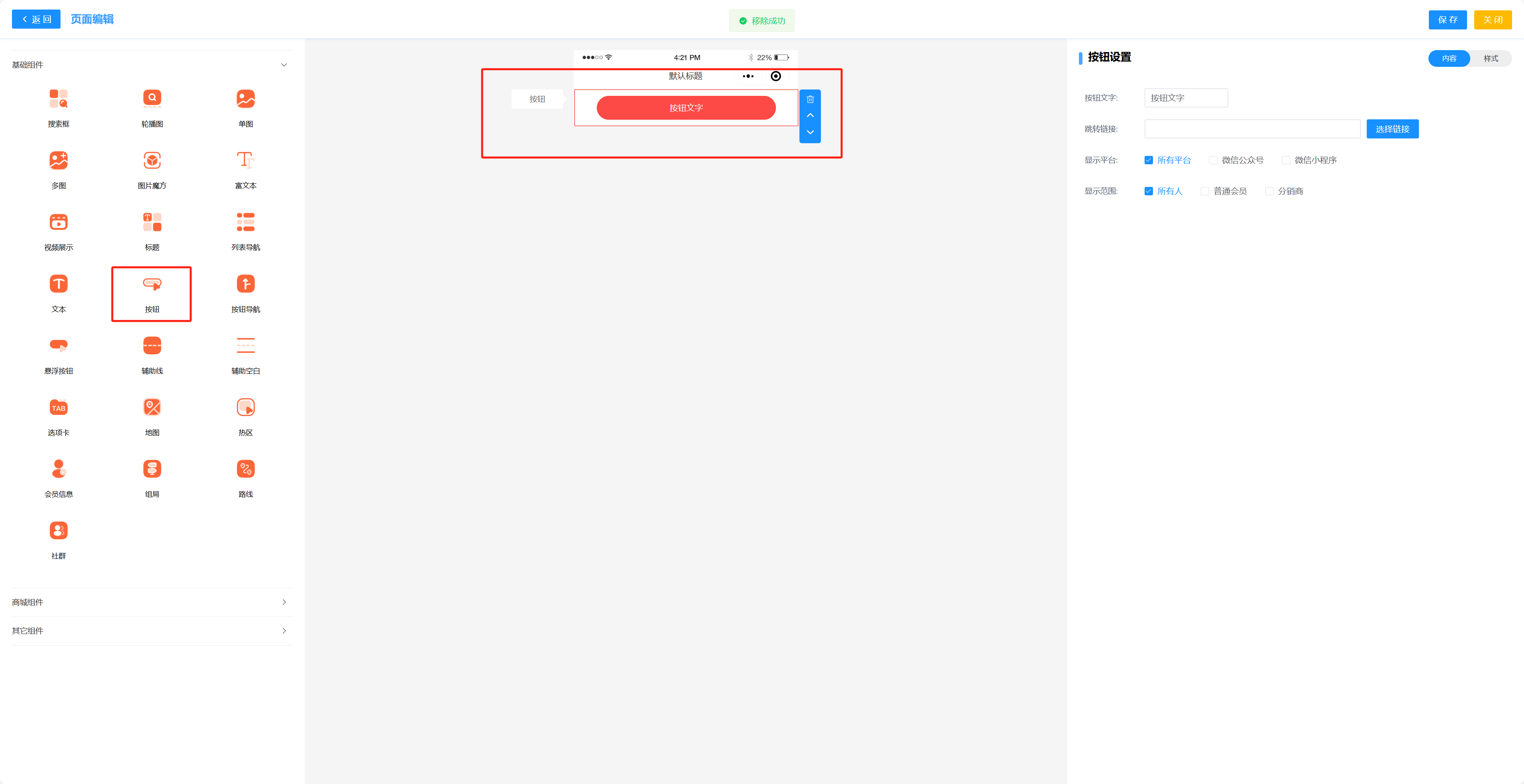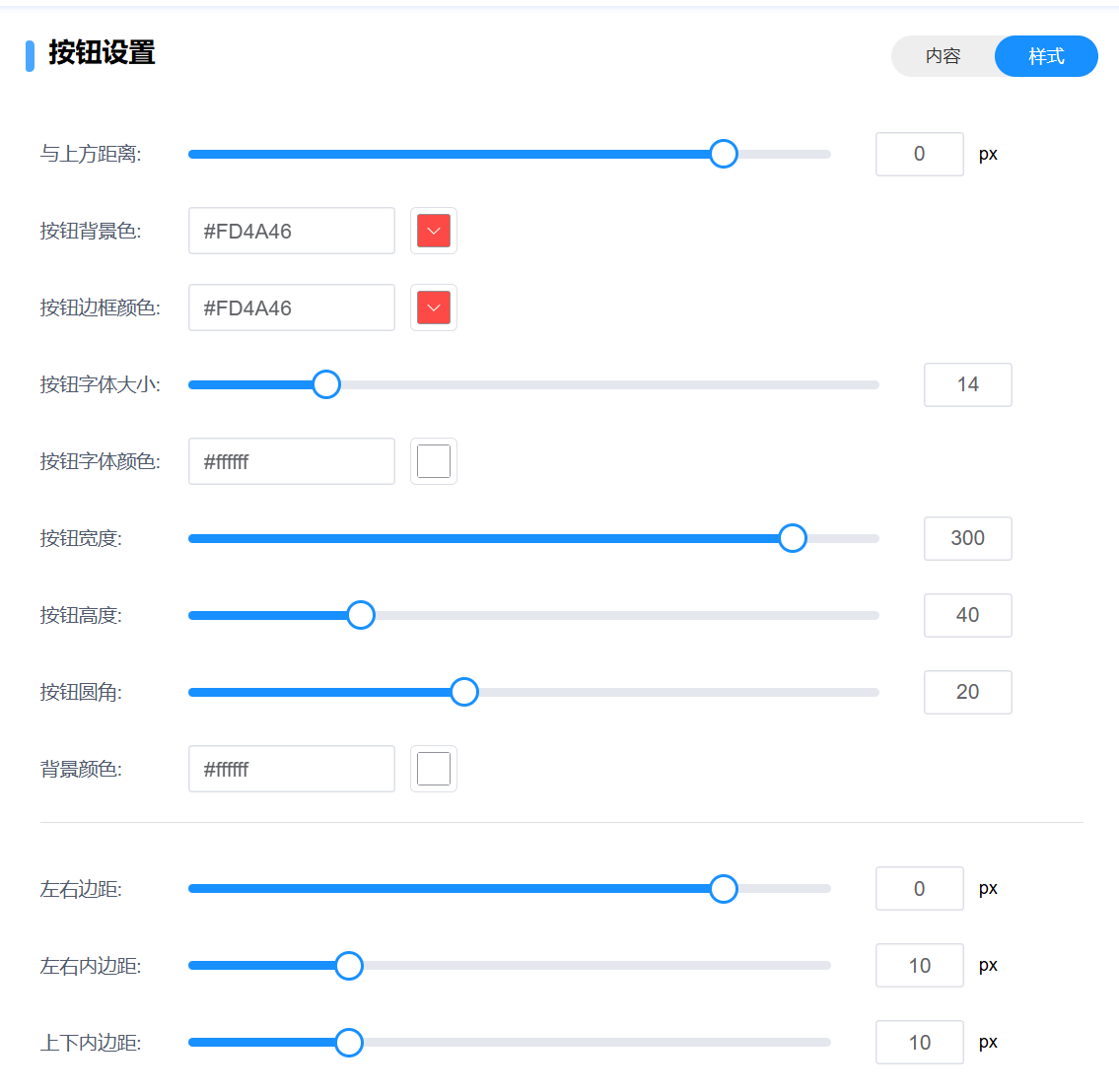 按钮组件可以设置一个按钮并设置点击按钮之后的跳转页面链接,同时可以设置按钮的文字 显示平台和展示人群就是是否展示在对应平台 展示人群就是设置哪些等级的人可以查看该组件  按钮组件样式如上图所示 按钮背景色可以设置按钮的背景颜色 按钮边框颜色可以设置按钮的边框的颜色 按钮字体大小可以设置按钮内的字体大小 按钮字体颜色可以设置按钮内字体颜色 按钮宽度可以设置按钮组件的宽度 按钮高度可以设置按钮组件的高度 按钮圆角可以设置按钮四周的圆角 背景颜色可以设置组件的背景颜色 与上方距离就是设置这个组件和上一个组件的距离 左右外边距的意思就是组件距离页面左右边缘的距离设置 左右内边距就是组件距离边框左右边缘的距离 上下内边距则是组件距离边框上下边缘的距离