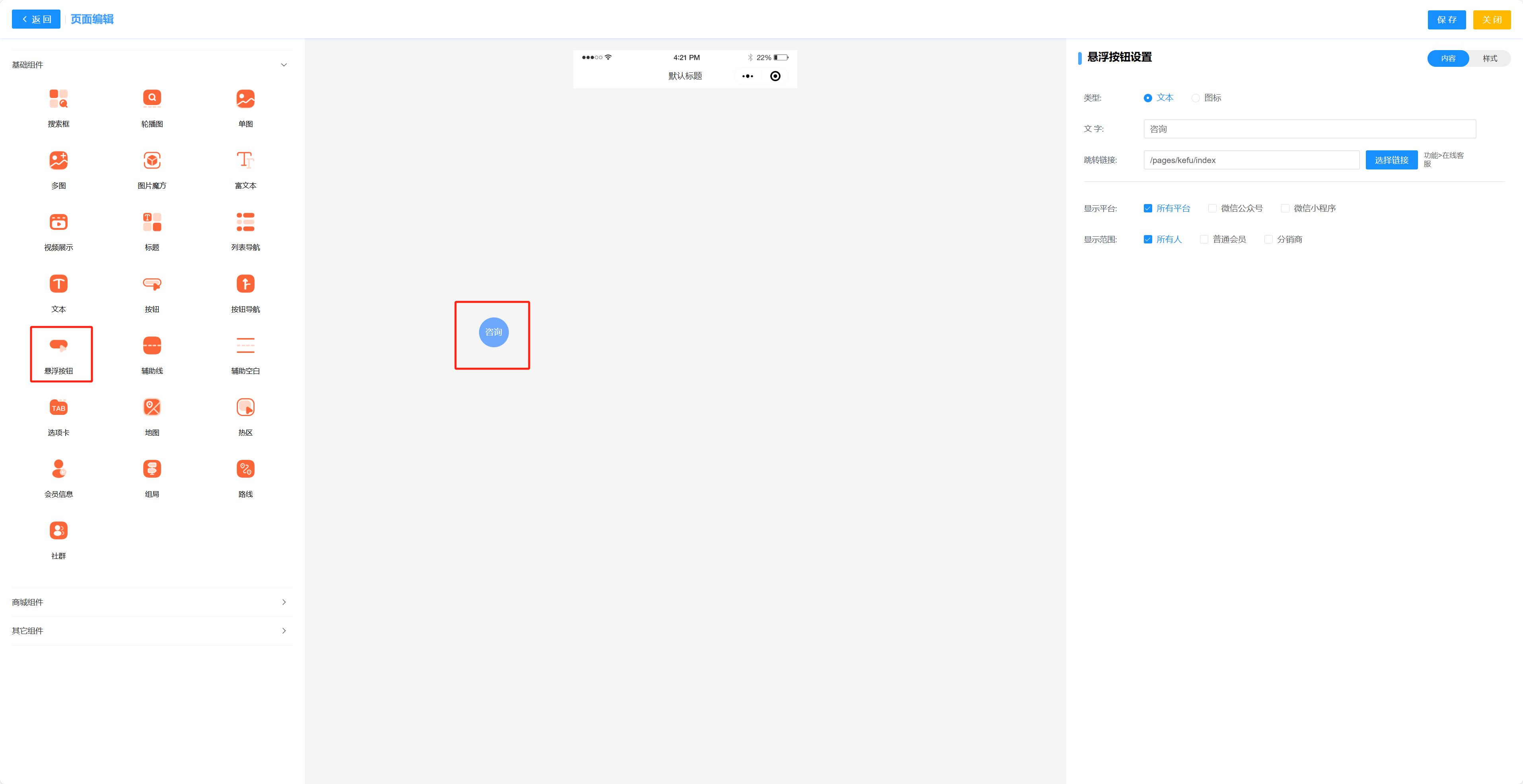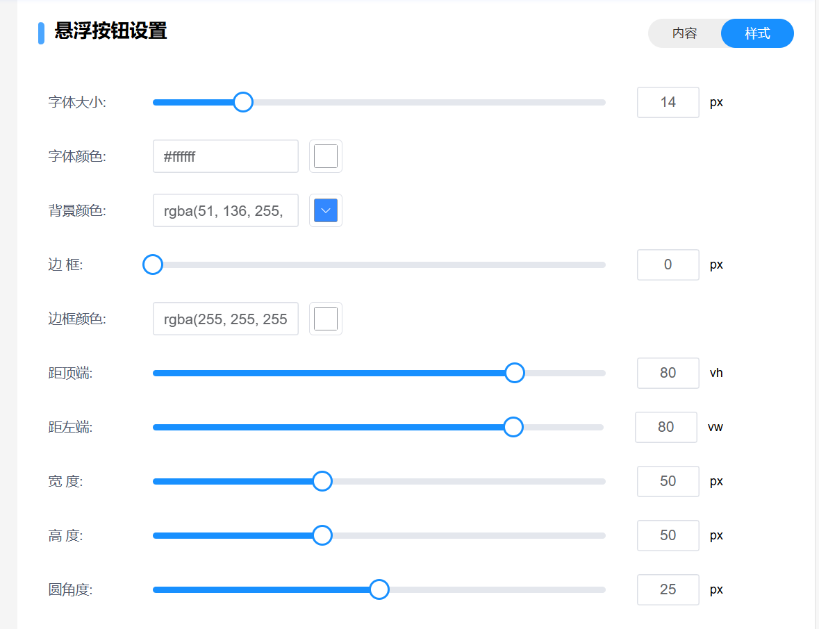 悬浮按钮组件可以设置一个悬浮按钮在页面内,可以设置文字和图标两种格式,并设置其对应的跳转链接 显示平台和展示人群就是是否展示在对应平台 展示人群就是设置哪些等级的人可以查看该组件  字体大小可以设置文本的字体大小 字体颜色可以设置字体的颜色 背景颜色可以设置悬浮按钮组件的背景颜色 边框可以设置组件边框的厚度 边框颜色可以设置组件边框的颜色 距顶端可以设置组件距离顶端的距离大小 距左端可以设置组件距离左端的距离大小 宽度可以设置组件的宽度 高度可以设置组件的高度 圆角度可以设置组件的圆角度