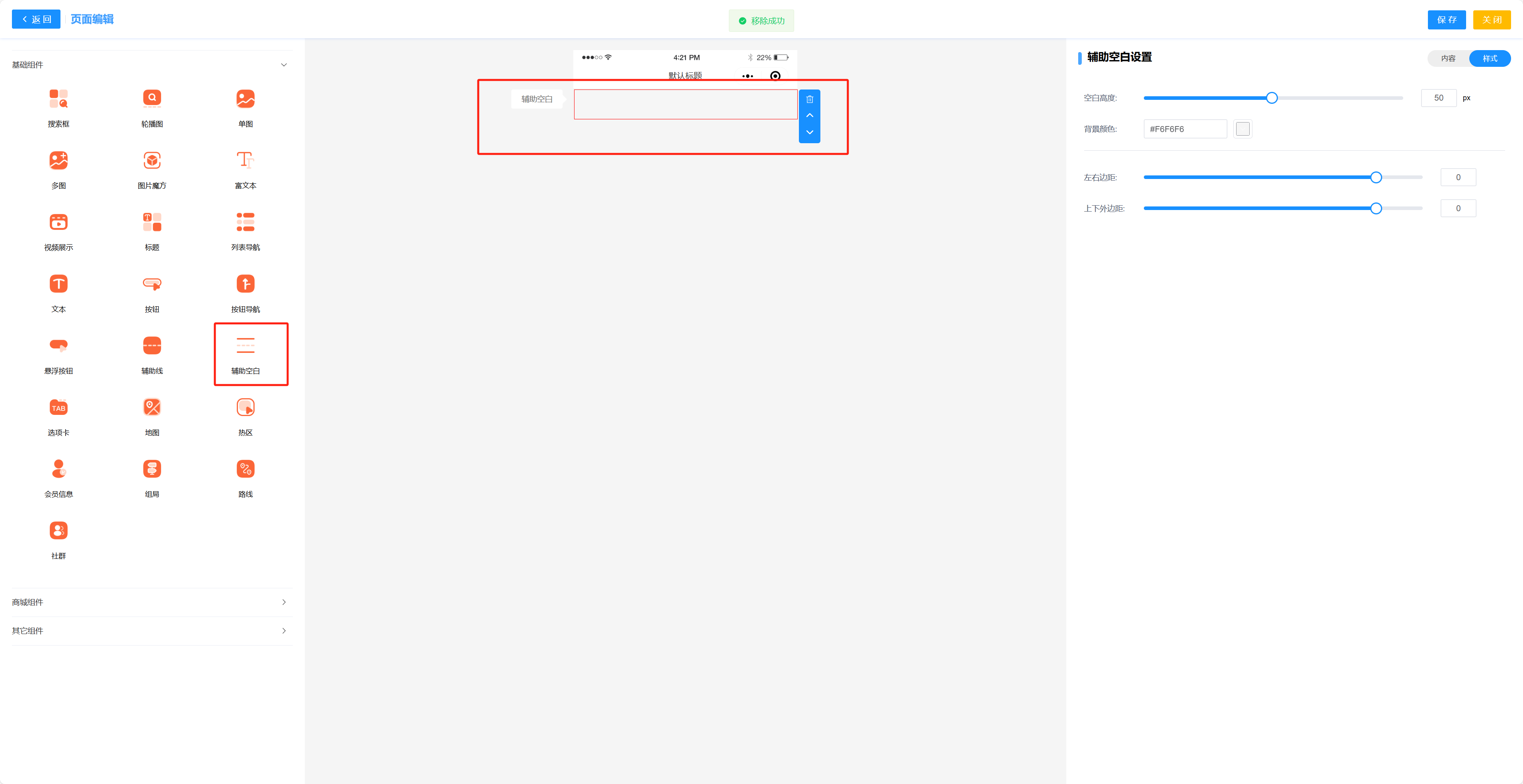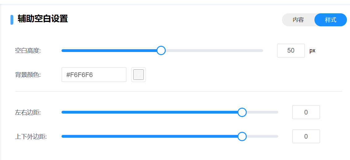 辅助空白组件可以设置一片空白进行样式辅助设计,可以设置空白高度和背景颜色 显示平台和展示人群就是是否展示在对应平台 展示人群就是设置哪些等级的人可以查看该组件  左右边距可以设置组件离页面边缘的距离大小 上下外边距可以设置组件和上下两个组件之间的距离