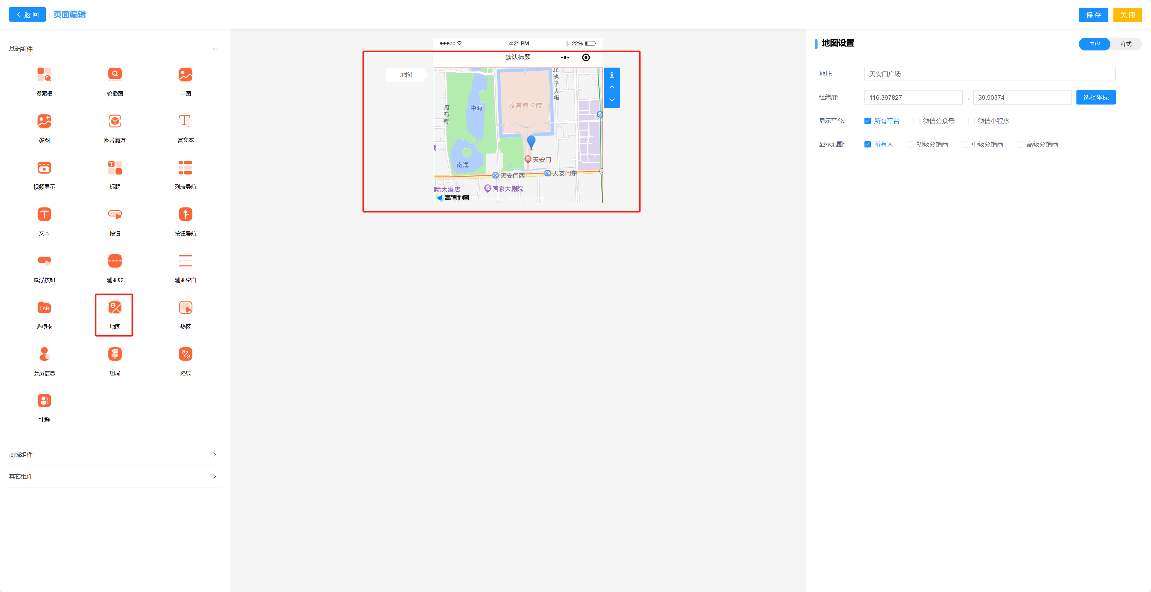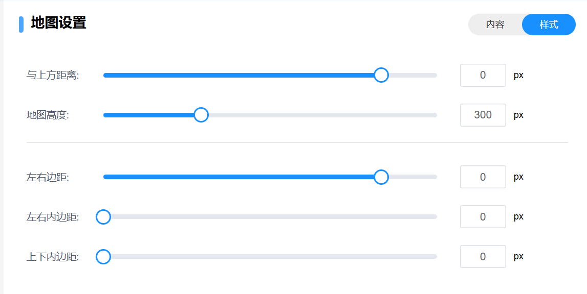 地图组件是显示某个地方地图的组件,可以设置地点以及经纬度 显示平台和展示人群就是是否展示在对应平台 展示人群就是设置哪些等级的人可以查看该组件  地图组件的样式如上图所示 与上方距离就是设置这个组件和上一个组件的距离 左右外边距的意思就是组件距离页面左右边缘的距离设置 左右内边距就是组件距离边框左右边缘的距离 上下内边距则是组件距离边框上下边缘的距离