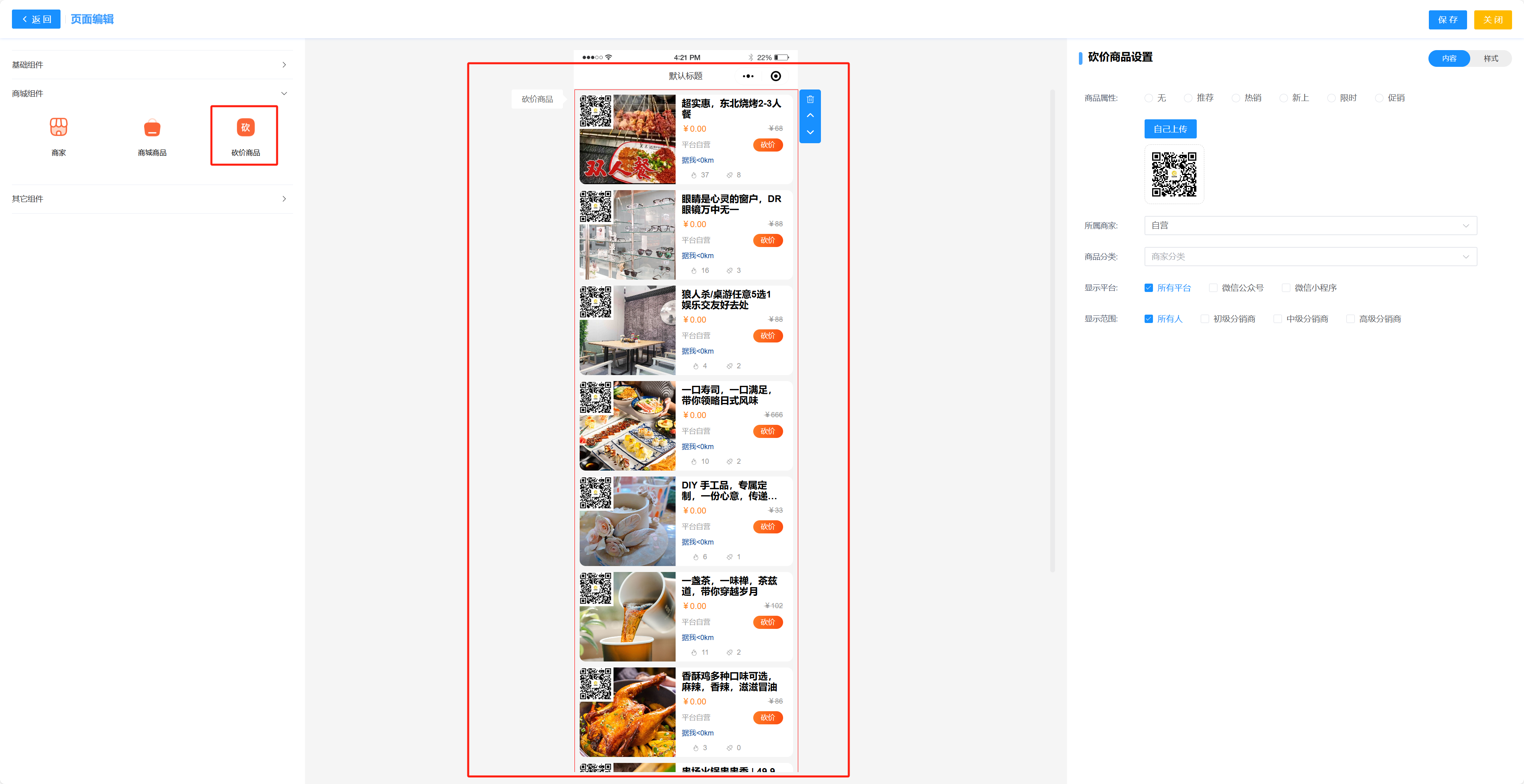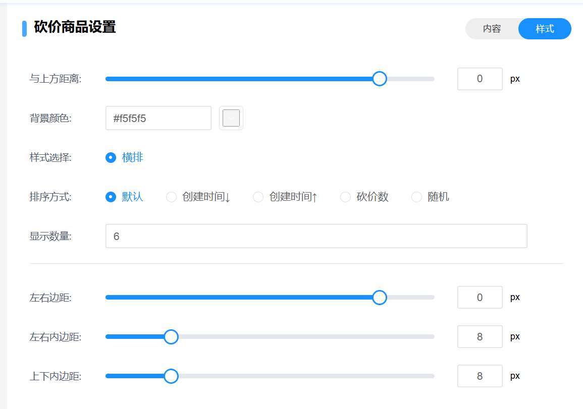 砍价商品组件是显示砍价商品列表的 自己上传可以设置在商品logo左上角显示的图片,可以选择对应商家的商品 显示平台和展示人群就是是否展示在对应平台 展示人群就是设置哪些等级的人可以查看该组件  砍价商品组件样式如上图所示 与上方距离就是设置这个组件和上一个组件的距离 排序方式可以设置商品列表的排序规则 背景颜色可以设置组件的背景颜色 左右外边距的意思就是组件距离页面左右边缘的距离设置 左右内边距就是组件距离边框左右边缘的距离 上下内边距则是组件距离边框上下边缘的距离