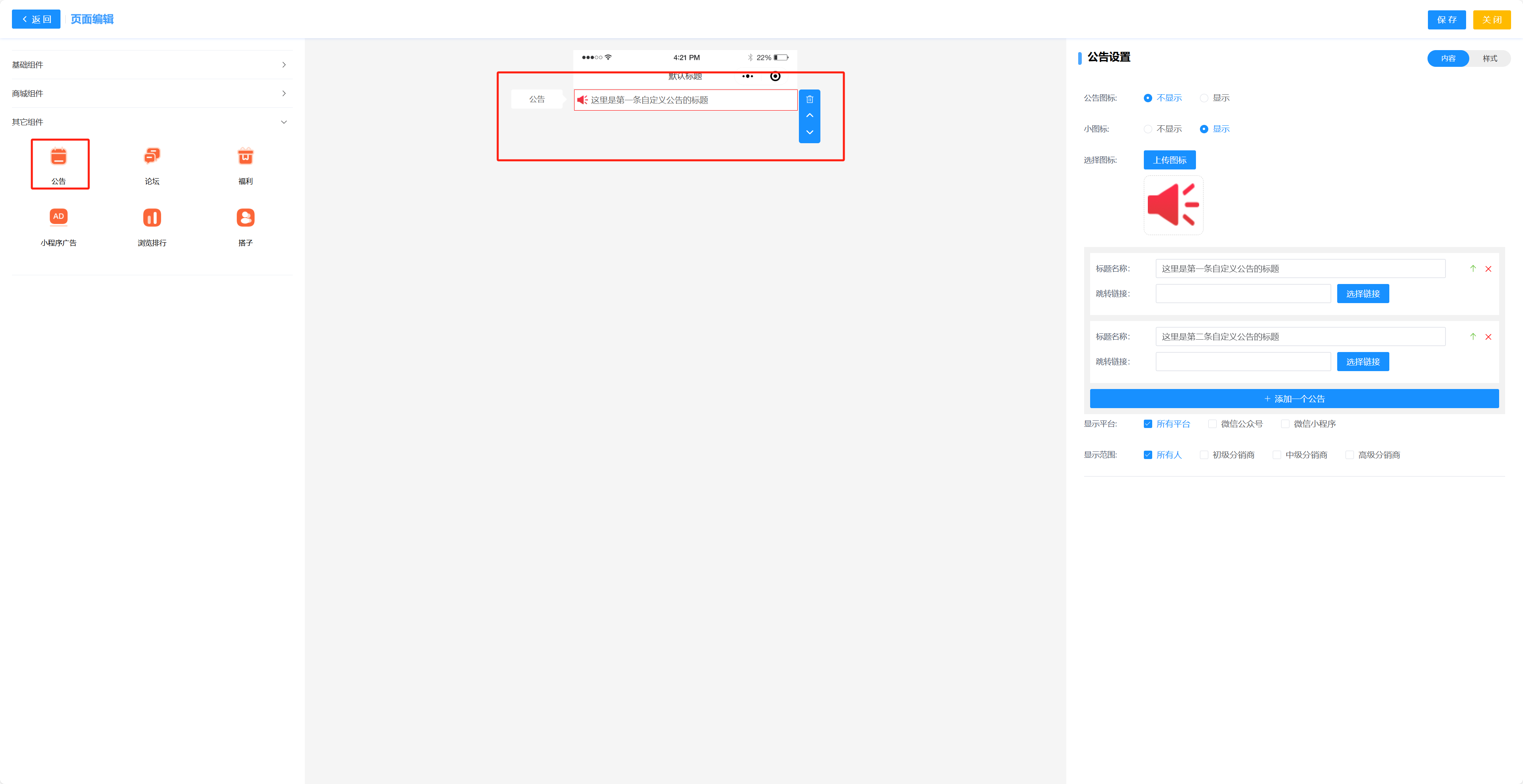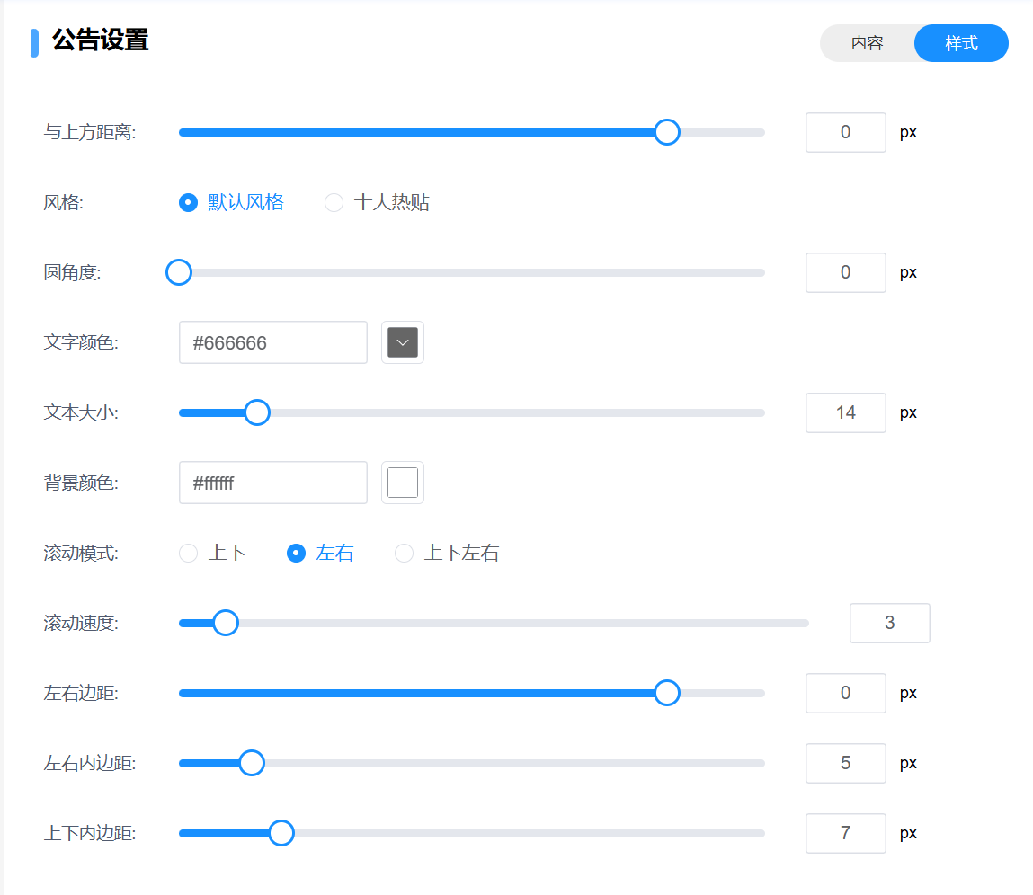 公告组件可以设置一条公告,可以对公告图标,内容,跳转链接进行设置 显示平台和展示人群就是是否展示在对应平台 展示人群就是设置哪些等级的人可以查看该组件  公告组件样式如上图所示 风格可以设置默认的公告和十大热帖风格 文字颜色可以设置公告内的文字颜色 文本大小可以设置组件内文字的大小 滚动模式可以设置公告的滚动方式 滚动速度可以设置公告的滚动速度 与上方距离就是设置这个组件和上一个组件的距离 排序方式可以设置商品列表的排序规则 背景颜色可以设置组件的背景颜色 左右外边距的意思就是组件距离页面左右边缘的距离设置 左右内边距就是组件距离边框左右边缘的距离 上下内边距则是组件距离边框上下边缘的距离