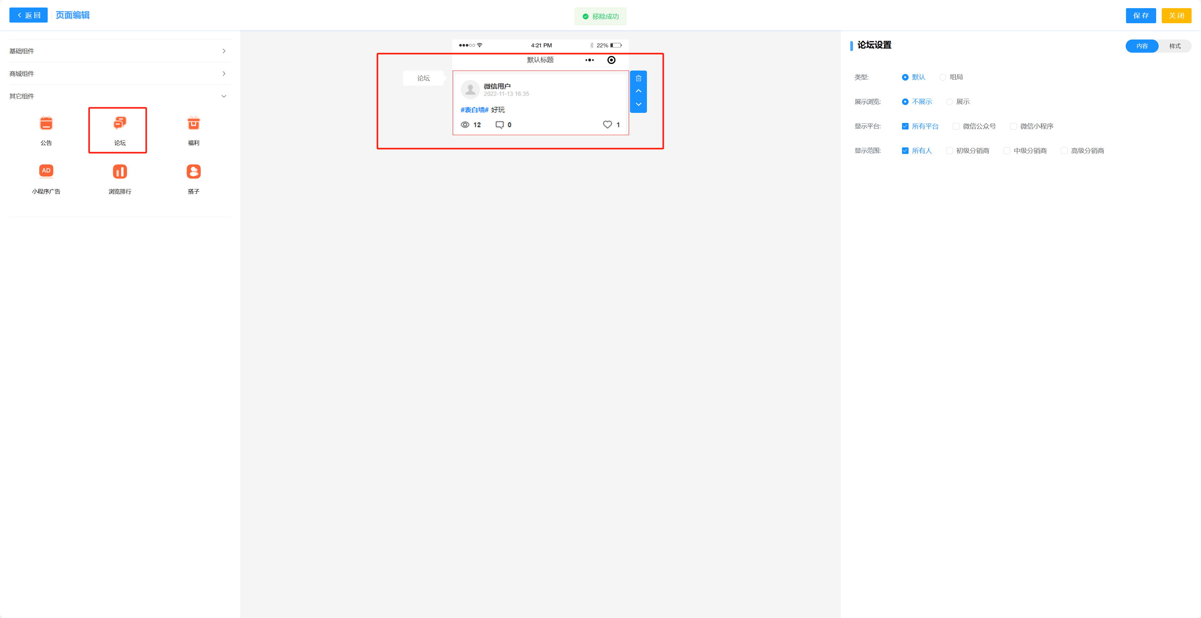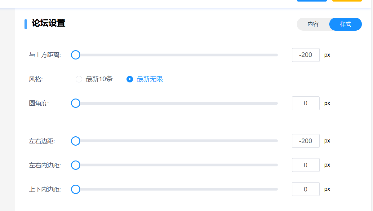 论坛组件可以显示论坛的帖子列表 可以设置是普通论坛还是组局类型,可以设置浏览量是否显示 显示平台和展示人群就是是否展示在对应平台 展示人群就是设置哪些等级的人可以查看该组件  论坛组件样式如上图所示 与上方距离就是设置这个组件和上一个组件的距离 背景颜色可以设置组件的背景颜色 风格可以设置论坛是最新的十条还是无限刷新的 圆角度可以设置帖子的圆角度 左右边距的意思就是组件距离页面左右边缘的距离设置 左右内边距就是组件距离边框左右边缘的距离 上下内边距则是组件距离边框上下边缘的距离