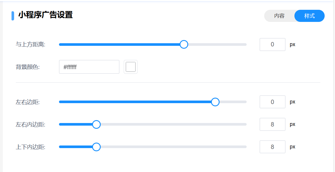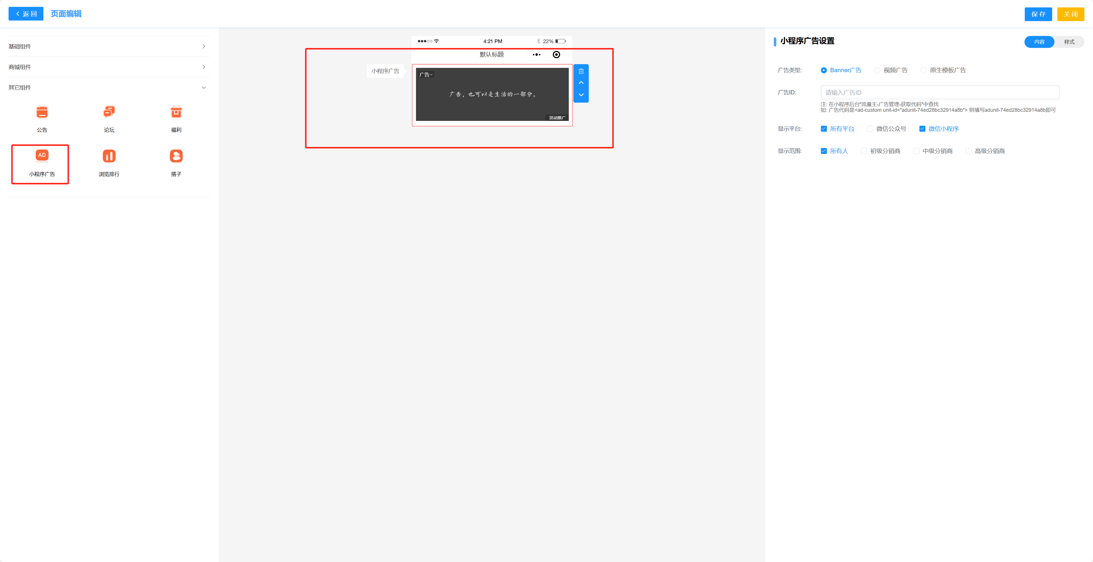 可以设置广告的类型为banner广告,视频广告和原生模板广告,输入广告id即可, 注: 在小程序后台"流量主-广告管理-获取代码"中查找 如: 广告代码是<ad-custom unit-id="adunit-74ed28bc32914a8b"> 则填写adunit-74ed28bc32914a8b即可 显示平台和展示人群就是是否展示在对应平台 展示人群就是设置哪些等级的人可以查看该组件  背景颜色可以设置组件的背景颜色 与上方距离就是设置这个组件和上一个组件的距离 左右外边距的意思就是组件距离页面左右边缘的距离设置 左右内边距就是组件距离边框左右边缘的距离 上下内边距则是组件距离边框上下边缘的距离