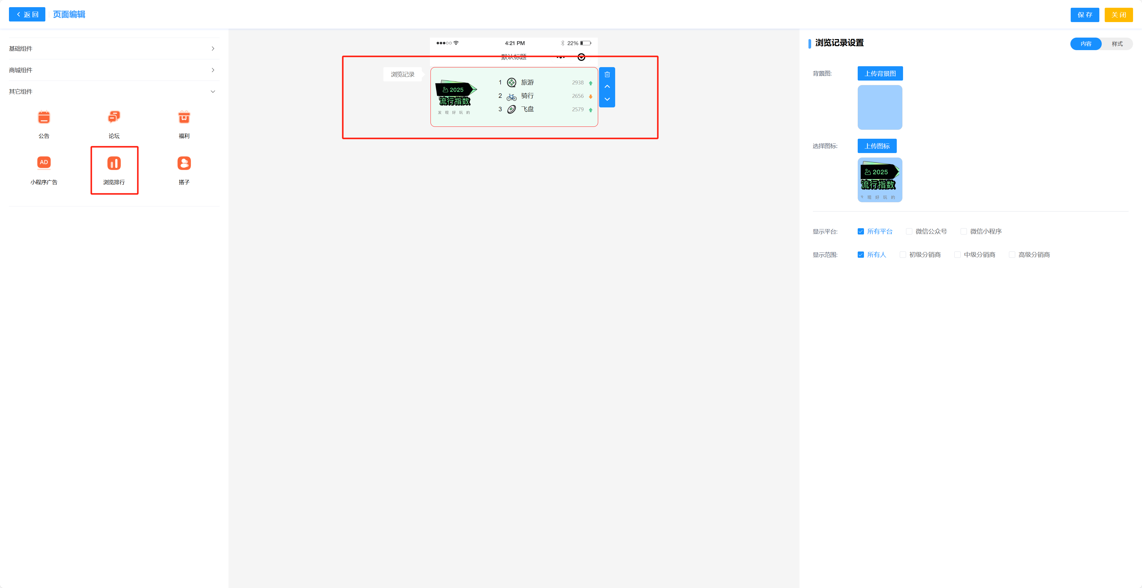 这个组件可以显示浏览量排行前三的三种类型的组局,可以自己设置图标和背景图片 显示平台和展示人群就是是否展示在对应平台 展示人群就是设置哪些等级的人可以查看该组件  背景颜色可以设置组件的背景,优先级低于背景图片 圆角度可以设置组件的圆角度 与上方距离就是设置这个组件和上一个组件的距离 左右外边距的意思就是组件距离页面左右边缘的距离设置 左右内边距就是组件距离边框左右边缘的距离 上下内边距则是组件距离边框上下边缘的距离