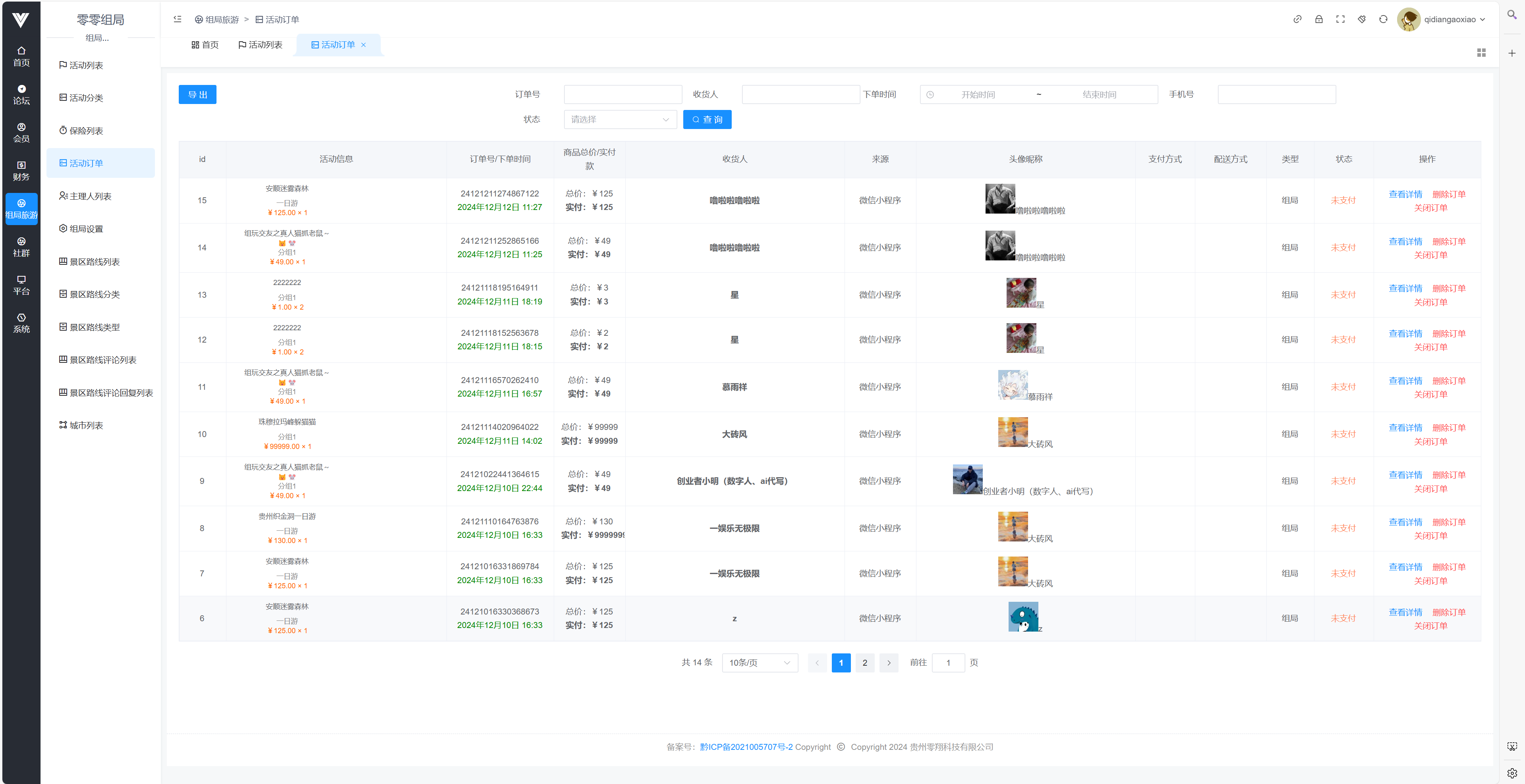在此处可以对产生的订单进行查看和操作,包括删除订单,关闭未完成订单和核销订单