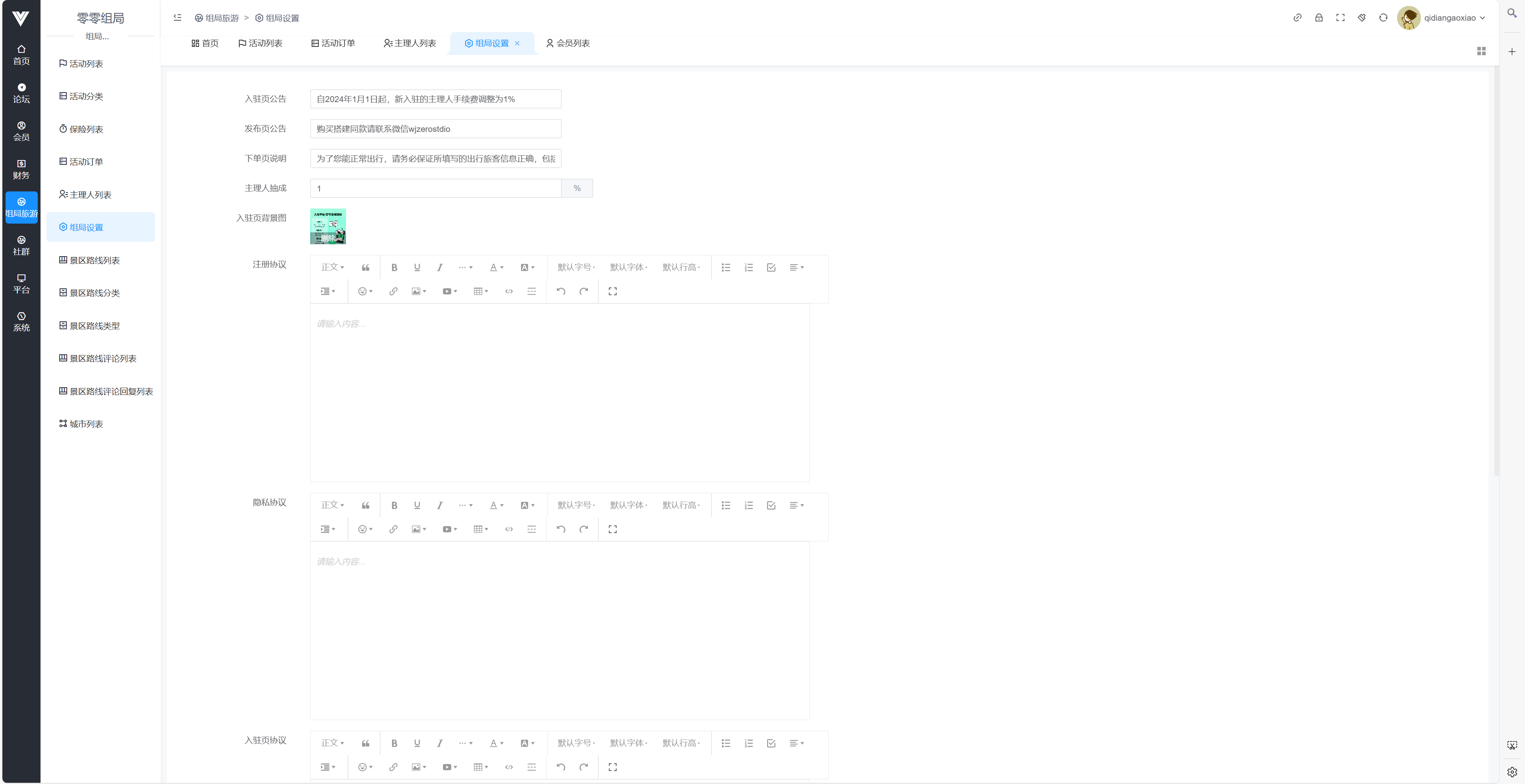 此处可以设置主理人入驻页面的公告,协议和背景图设置,发布页的公告和声明设置,还有下单页说明