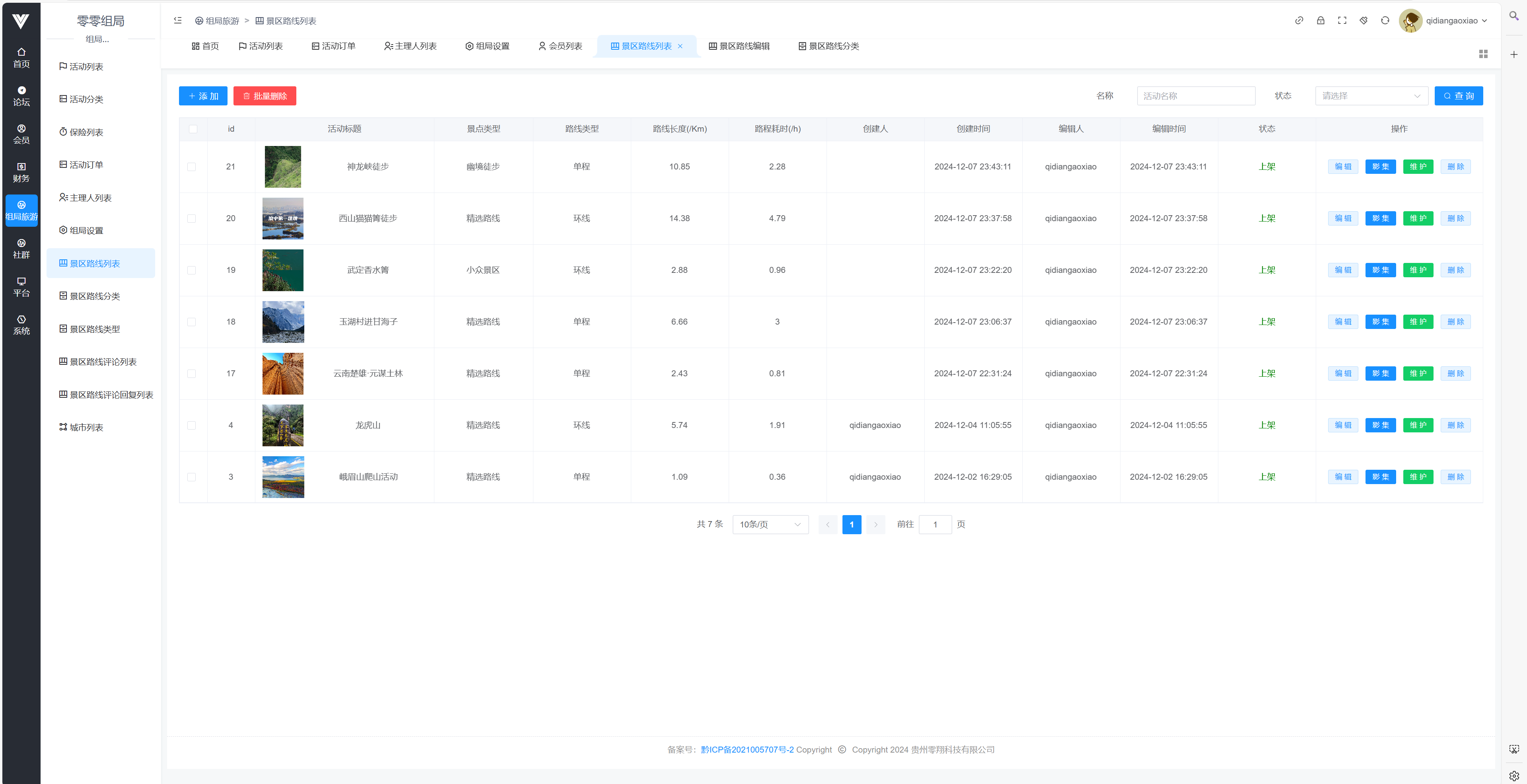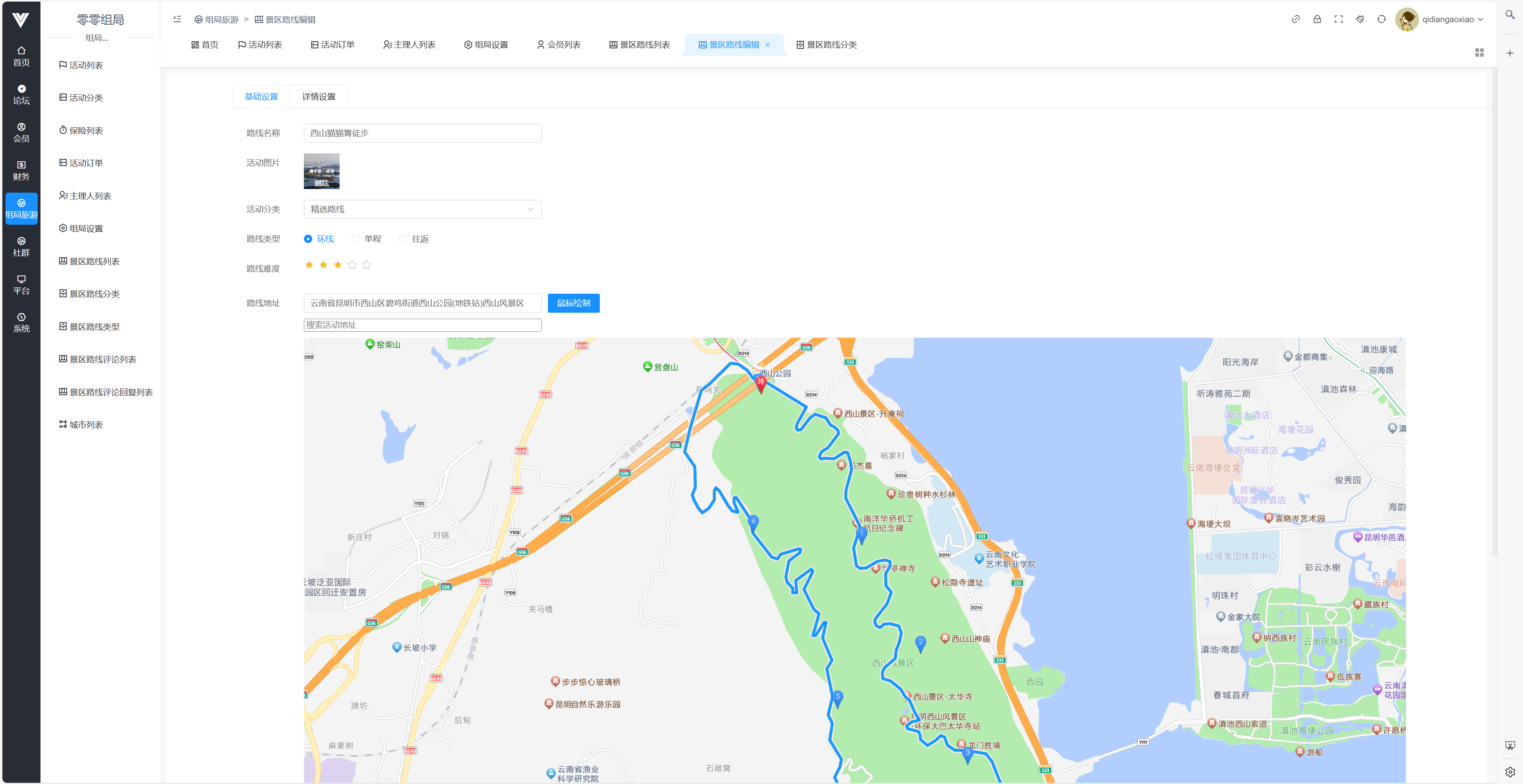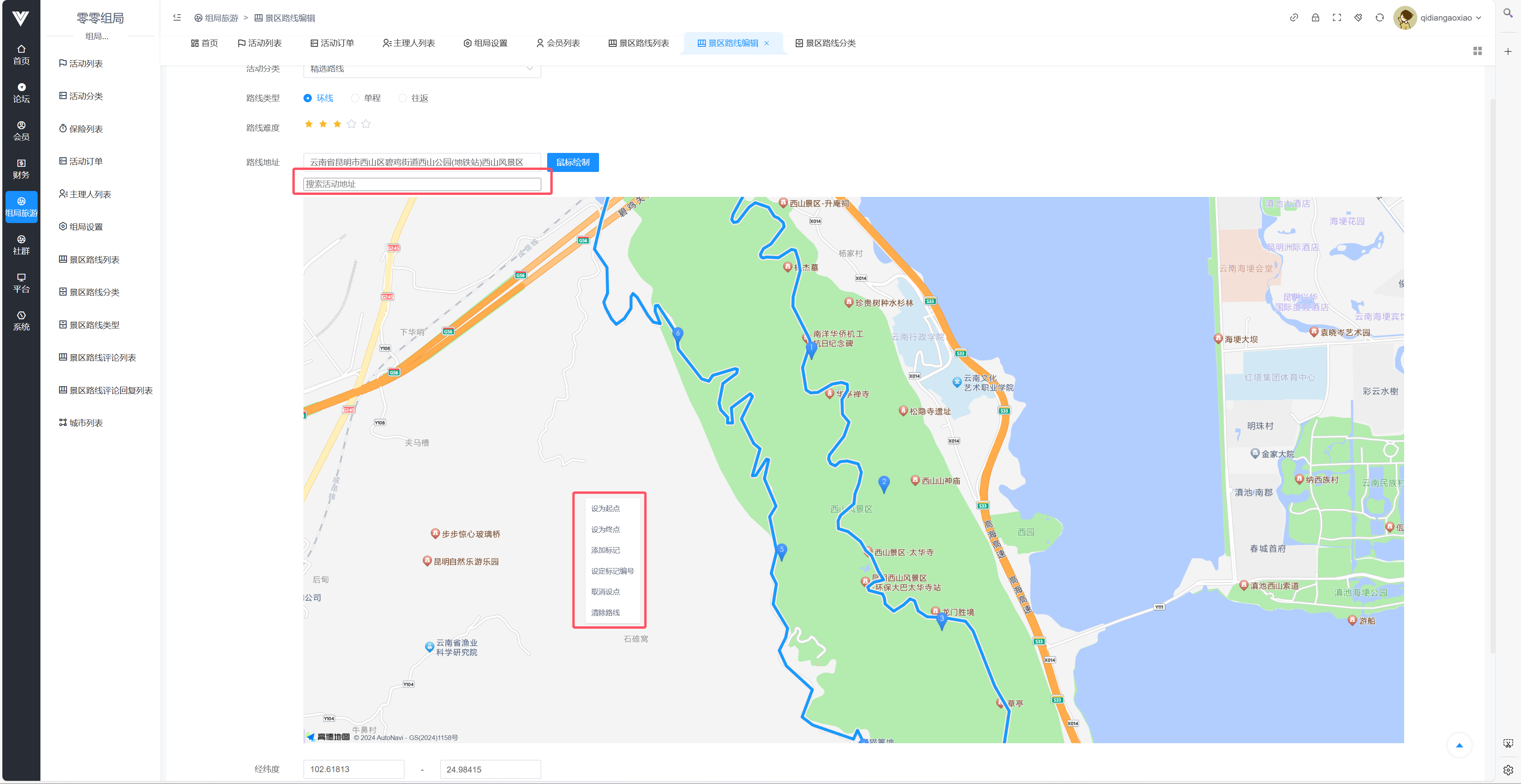 在此处可以查看路线页面的路线列表,包括查看影集和维护特点,也能审核用户上传的影集图片  除了查看之外,这里还可以对路线的内容进行编辑或者新建,如下图所示,可编辑项包括路线名称,活动图片,路线类型,路线难度,路线地址以及路线的长度和耗时,还可以设置此路线是否上架  现在着重介绍一下路线的设置,首先可以在搜索活动地址处先搜索出活动的地址,然后在地图上找到对应的地点右键添加标记,每一个标记都可以设置为起点,终点,或者设只一个带序号的点  设置完标记点之后,点击鼠标绘制按钮,可以在地图上把设置好的点连接起来,由于是手动绘制,所以可以自由定义路线