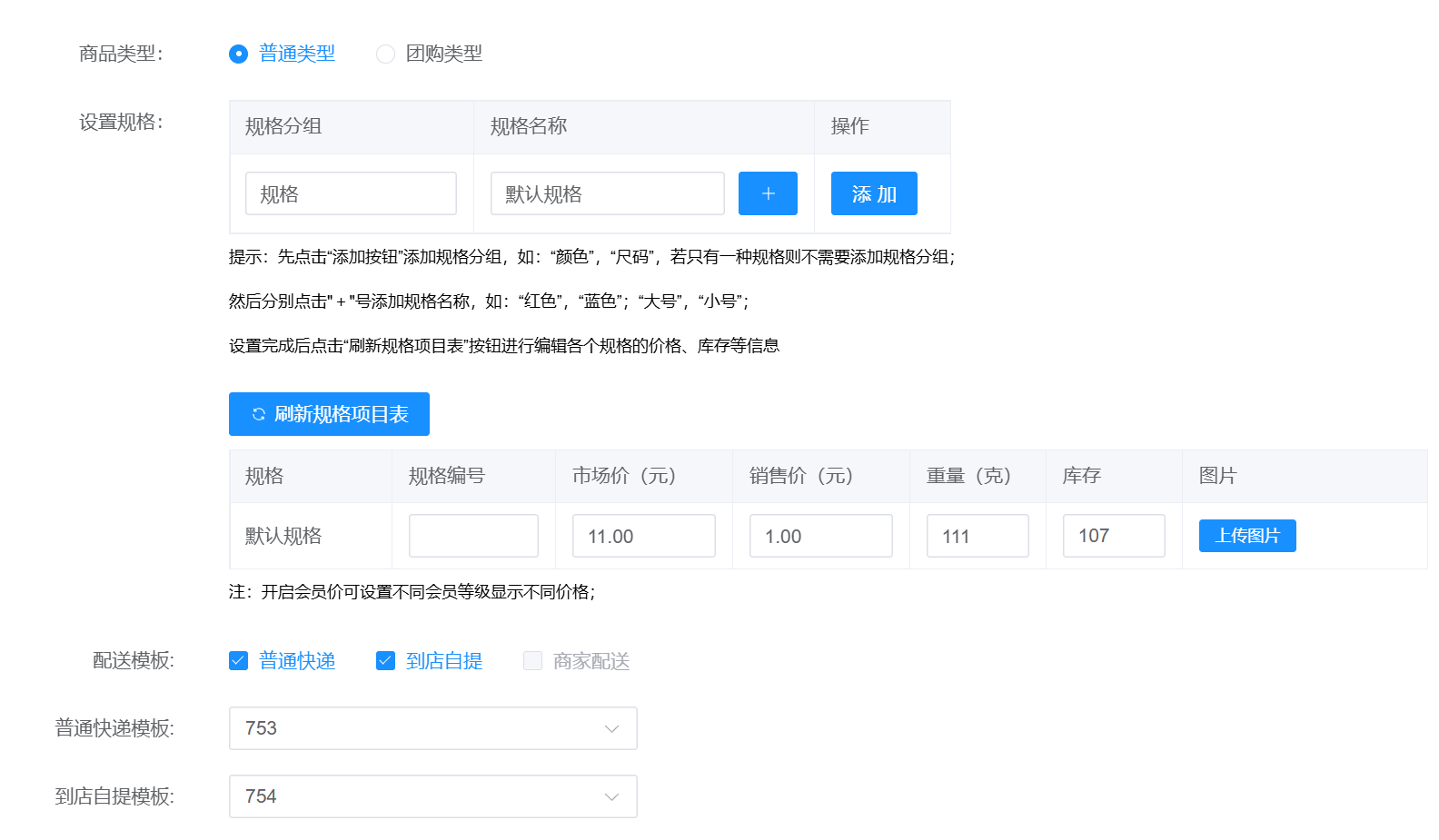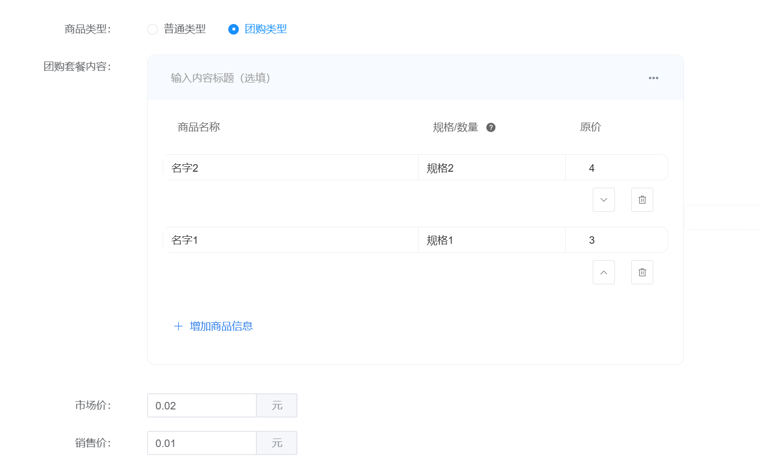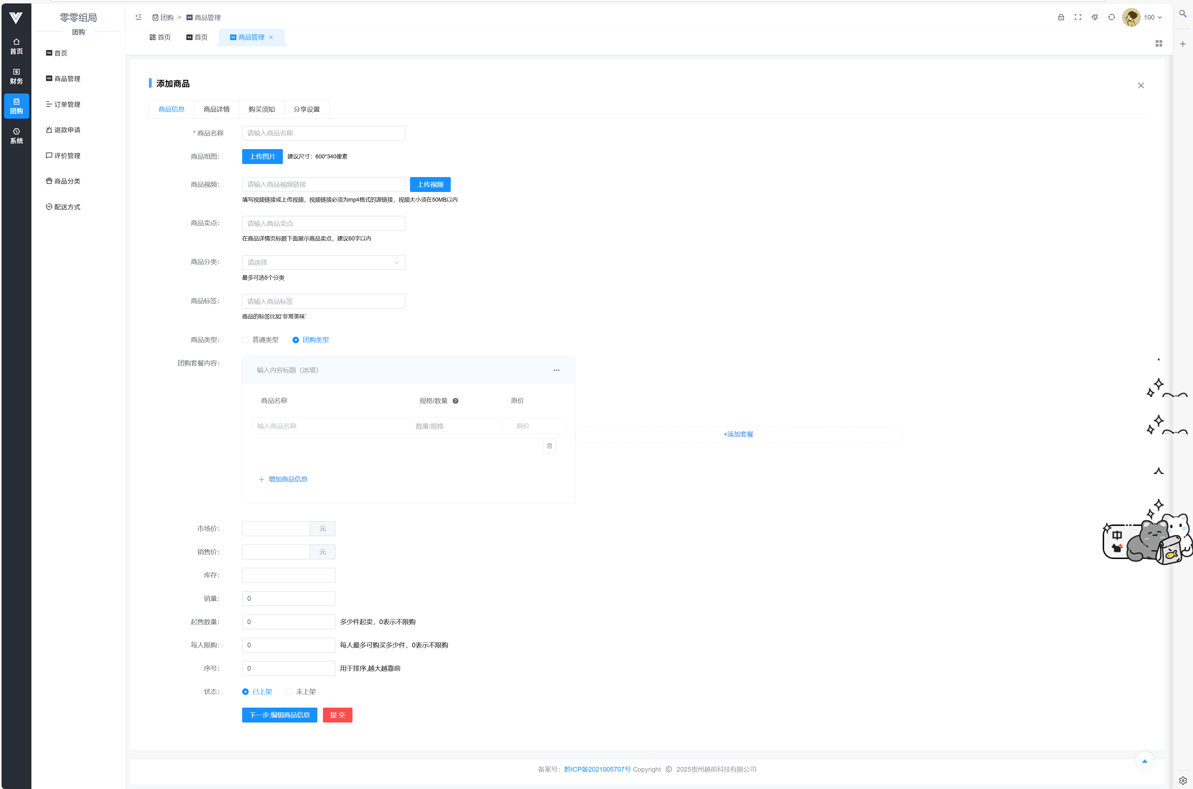 此处显示的团购的商品管理,跟商户的团购功能一致,对商品进行添加,删除,编辑等操作 点击添加时候的设置项如下图所示  在商品信息内设置商品的基础信息,包括名称,商品组图,商品视频,商品分类(需要在左边商品分类内设置之后才可选择),商品卖点(可显示在小程序商品名字下),商品及标签(会显示在商品logo旁),销量,库存,起售数量,限购,还有上架状态 在团购套餐内可以设置套餐内容  普通模式可以设置商品规格  商品类型(有两种,普通和团购,团购类型到店核销,普通可以选择快递方式) 商品详情如下图所示,可以设置富文本和图并对其进行一定编辑  购买须知如下图所示,可以设置有效天数,核销码可用日期以及其他须知