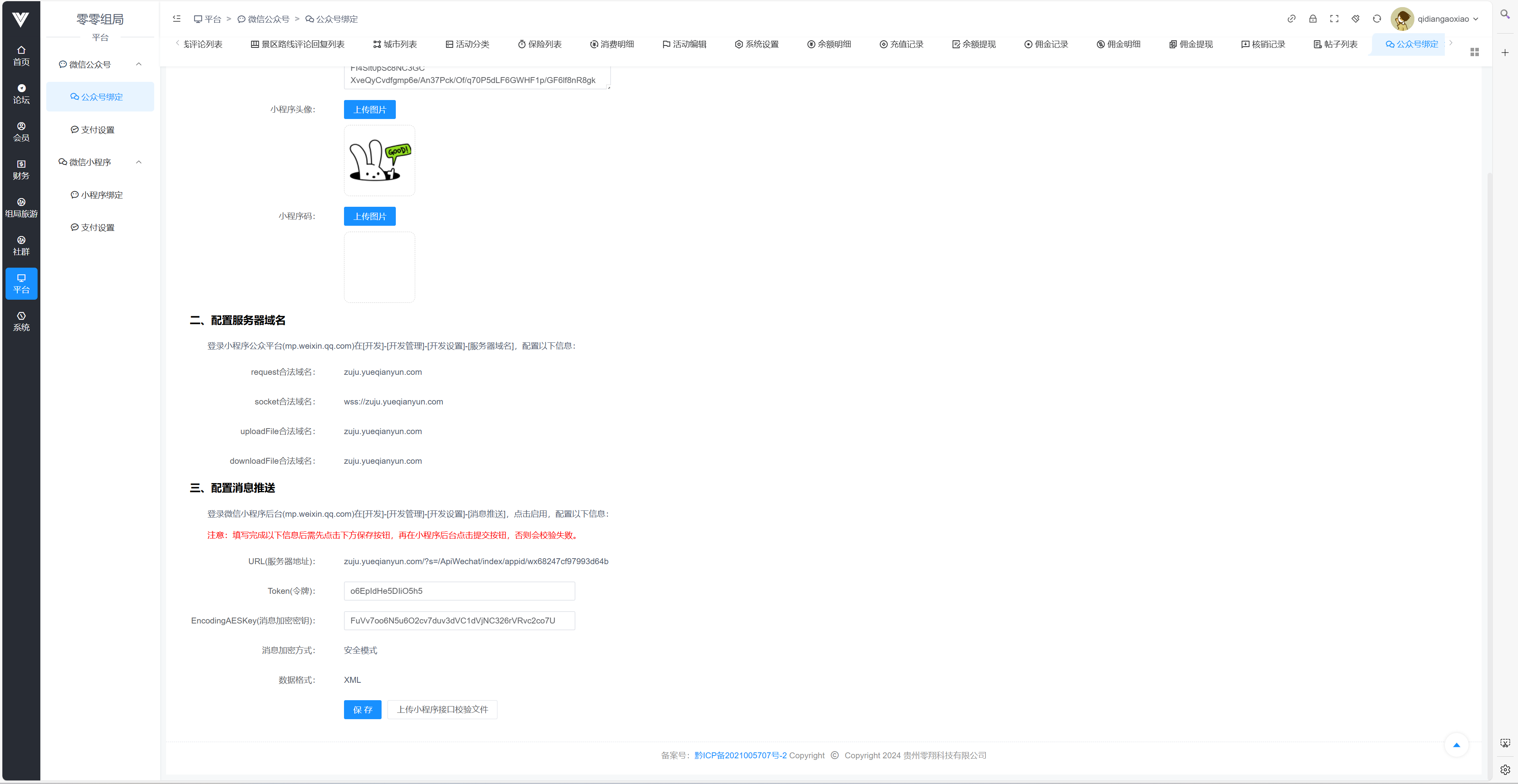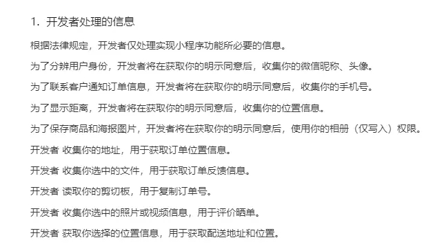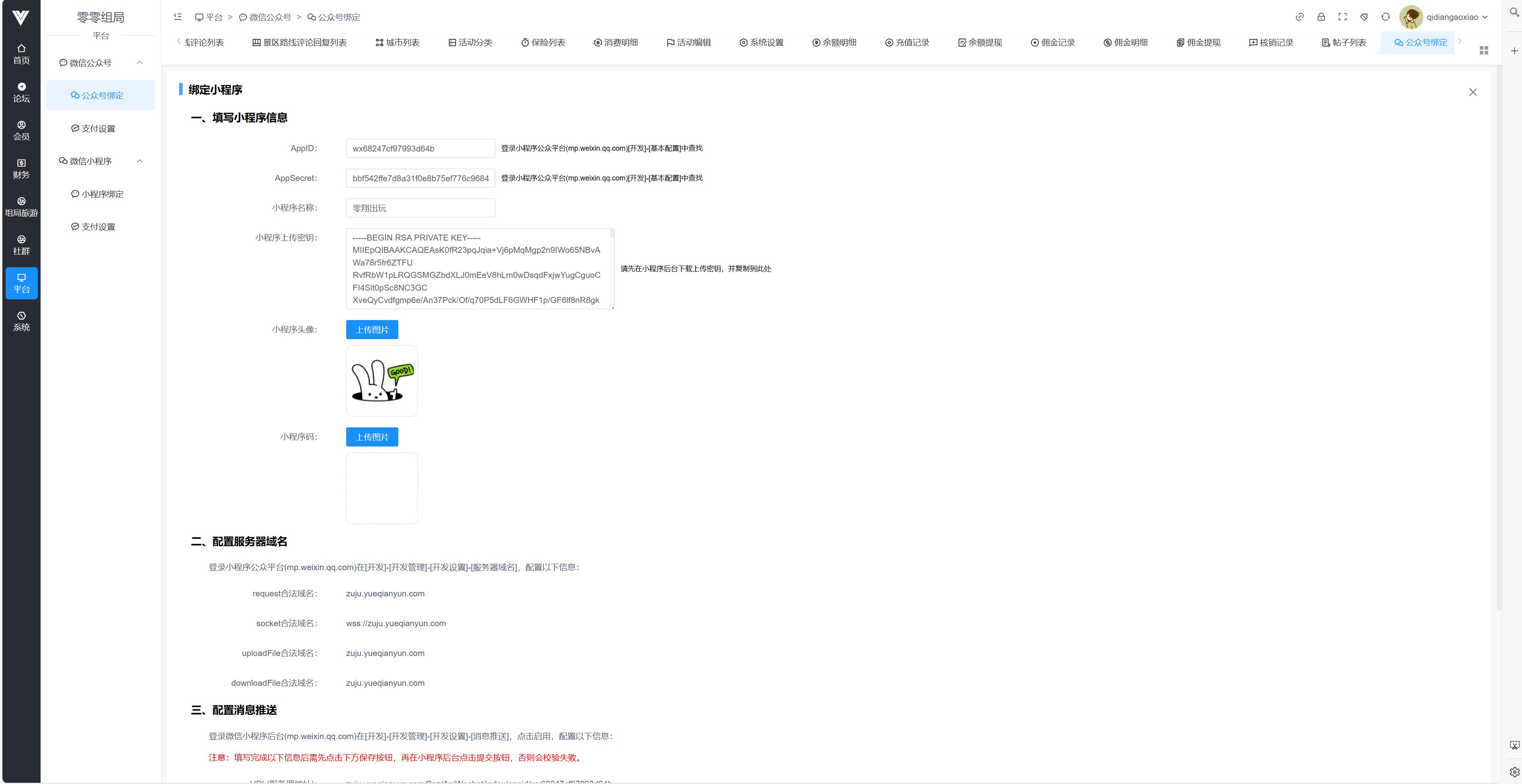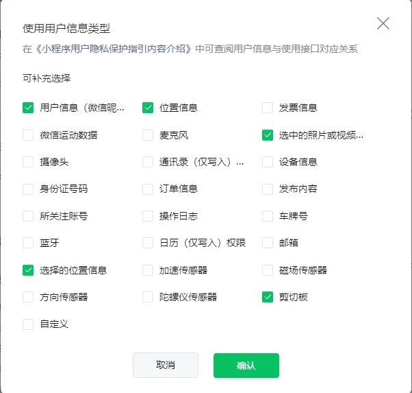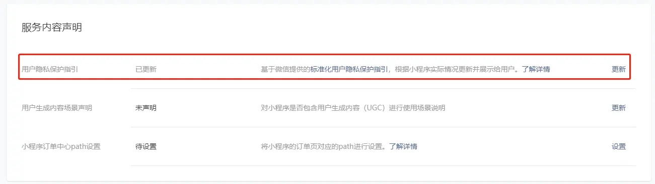 可以在此处进行公众号和小程序绑定,并配置支付设置,如下图所示 小程序绑定在的相关内容在页面内都有详细小字说明,照着说明进行操作即可   公众号绑定也跟小程序绑定类似,照着小字说明操作即可   注:提交审核时候需要更新用户隐私 登录小程序后台:设置——用户隐私保护指引——更新/新建(需要审核)——增加信息类型——下图中的权限都需勾选并设置   注:小红书上传小程序代码需要300秒左右