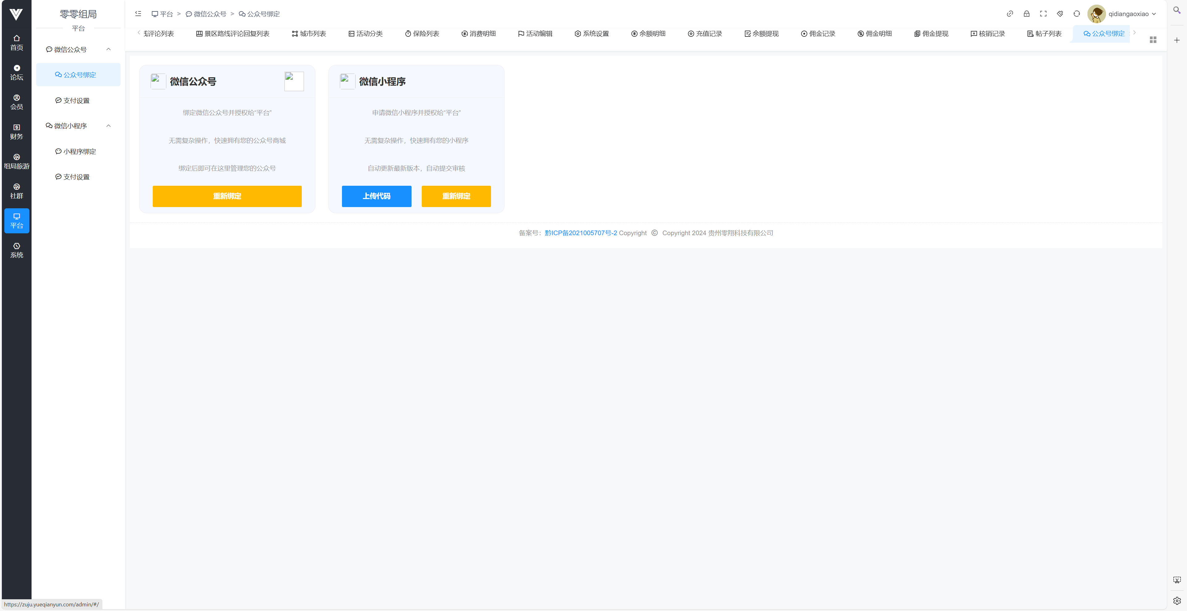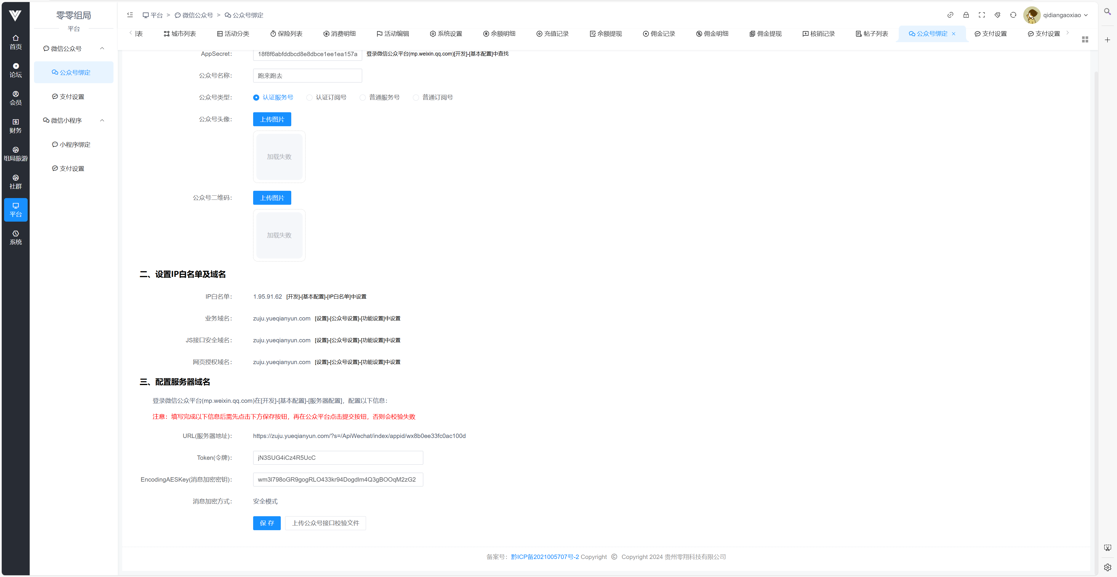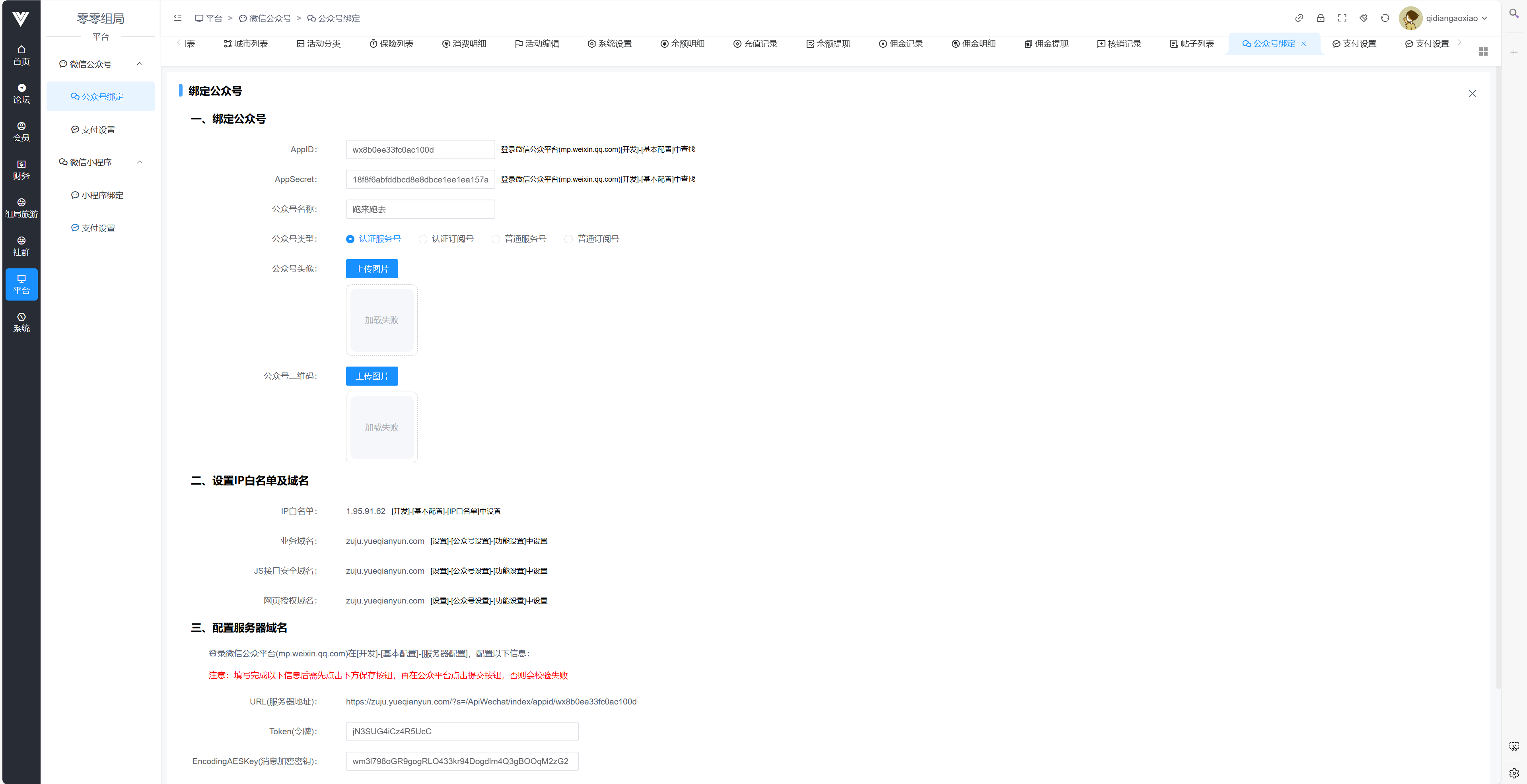 可以在此处进行公众号和小程序绑定,并配置支付设置,如下图所示 小程序绑定在的相关内容在页面内都有详细小字说明,照着说明进行操作即可   公众号绑定也跟小程序绑定类似,照着小字说明操作即可   注:提交审核时候需要更新用户隐私 登录小程序后台:设置——用户隐私保护指引——更新/新建(需要审核)——增加信息类型——下图中的权限都需勾选并设置   注:小红书上传小程序代码需要300秒左右