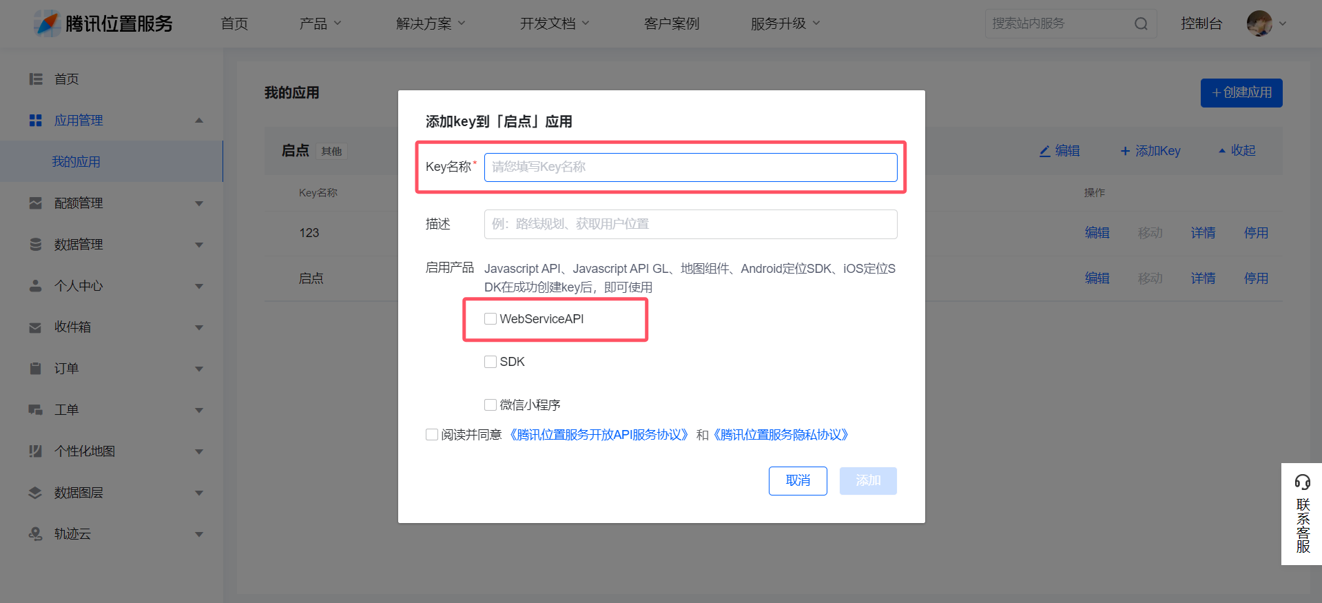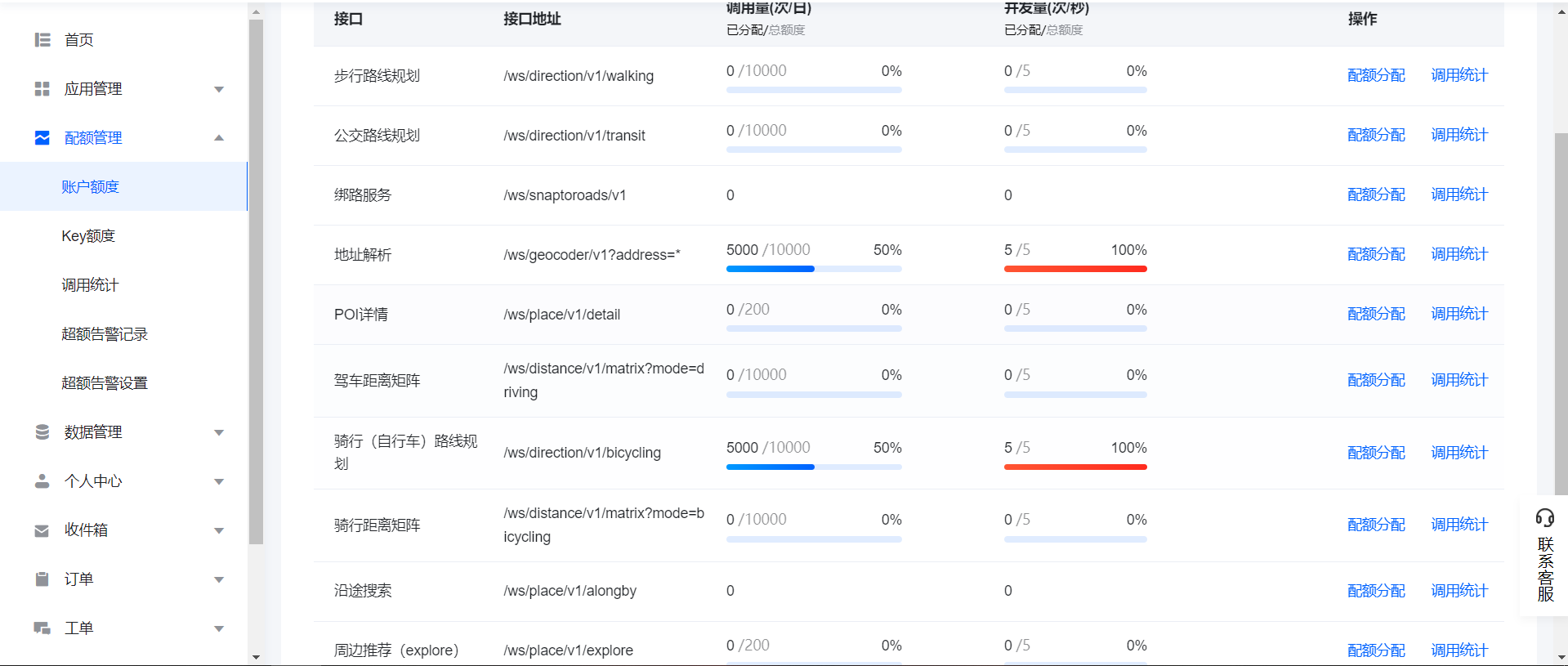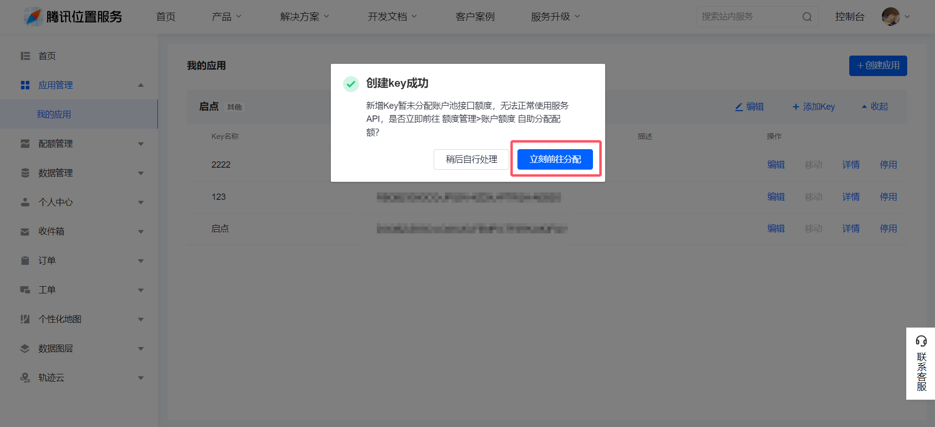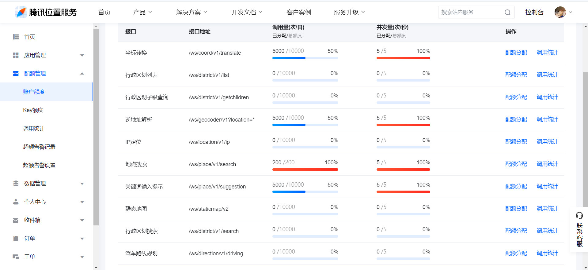 首先去腾讯位置服务注册一个账号网址如下 https://lbs.qq.com/ 登录之后点击头像旁边的控制台  然后点击应用管理→我的应用,然后点击添加key  然后输入名称,选择WebServiceApi,勾选已阅读并同意协议  点击保存之后会提示你未分配额度,点击立即前往分配  接下来按照需求分配即可,下面是推荐的分配额度   申请成功之后复制对应的key到后台的首页→控制台→腾讯key