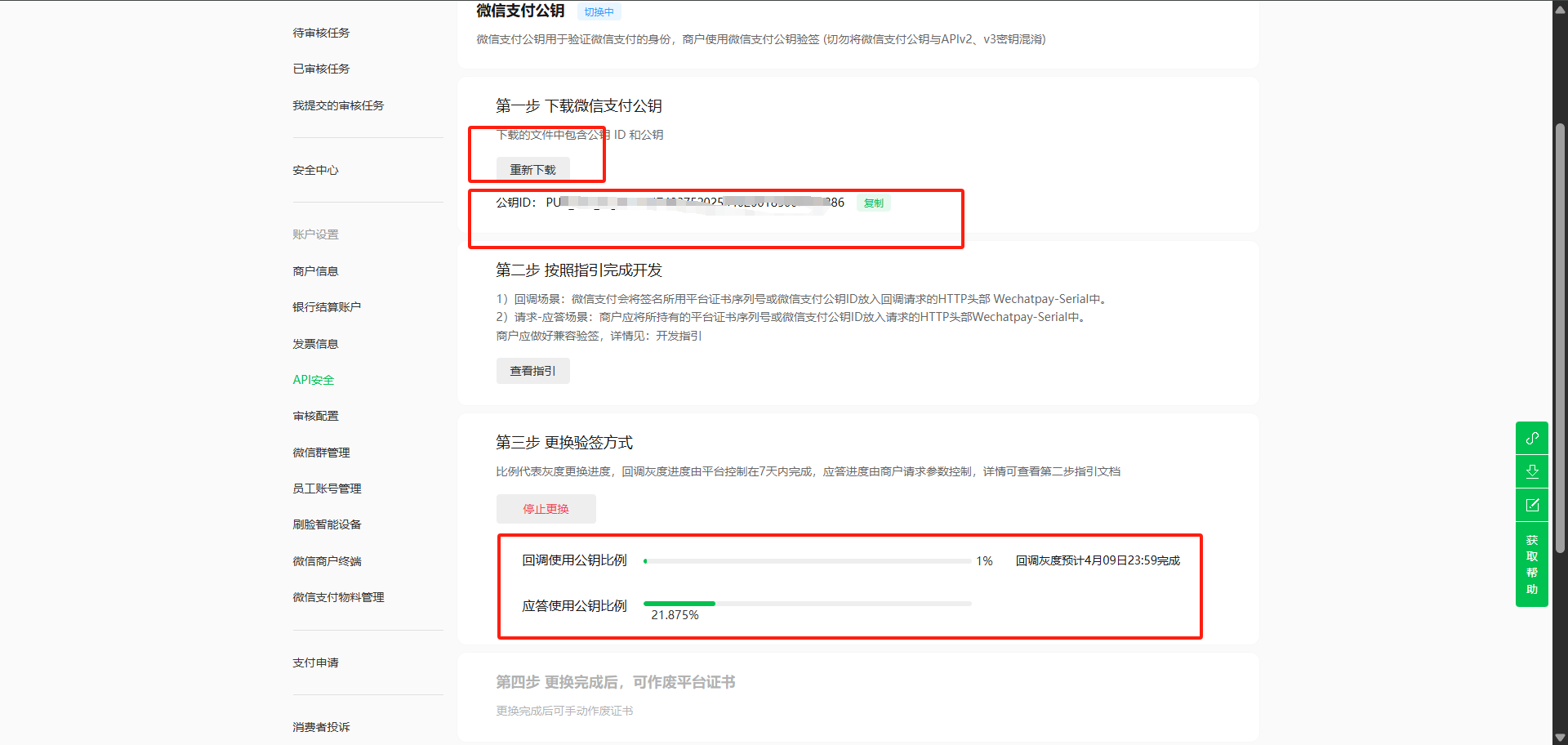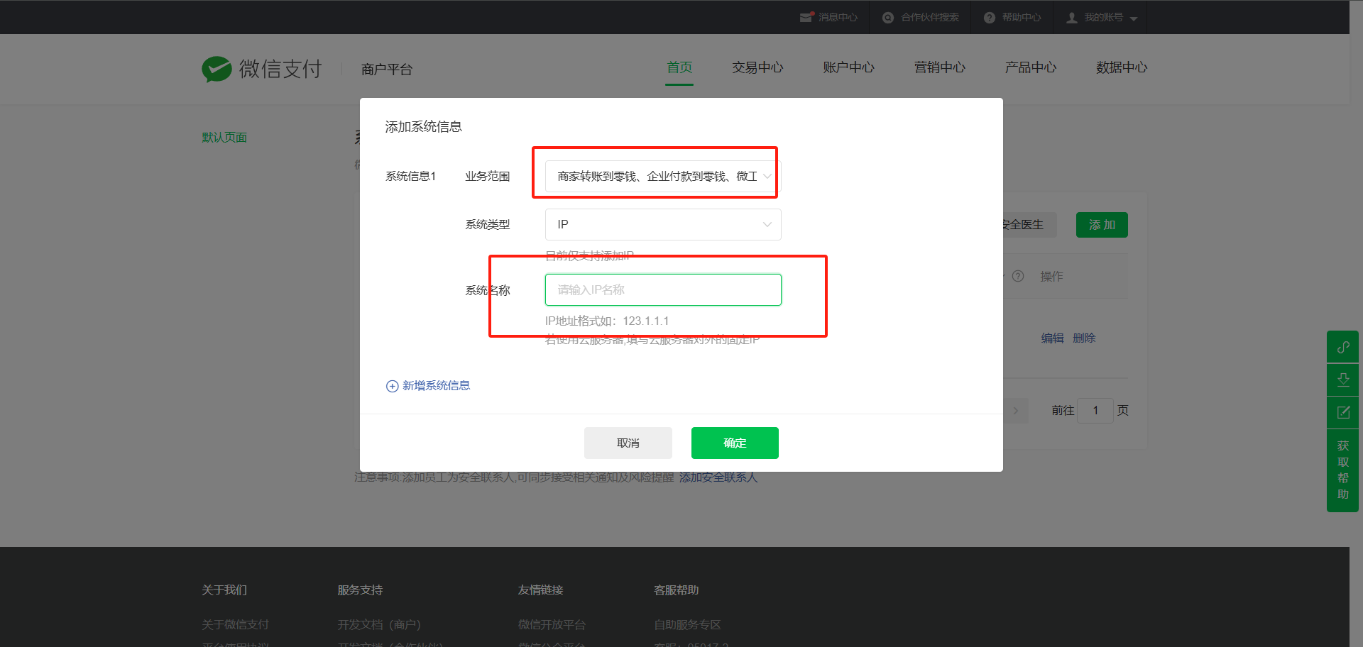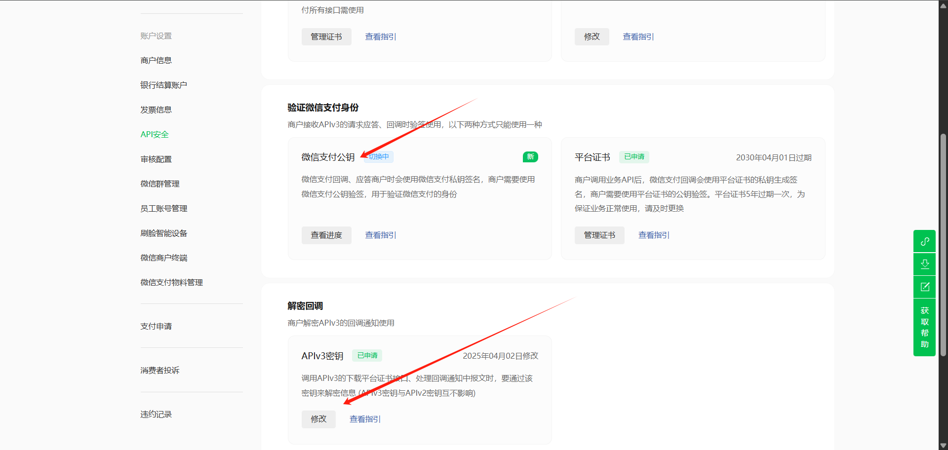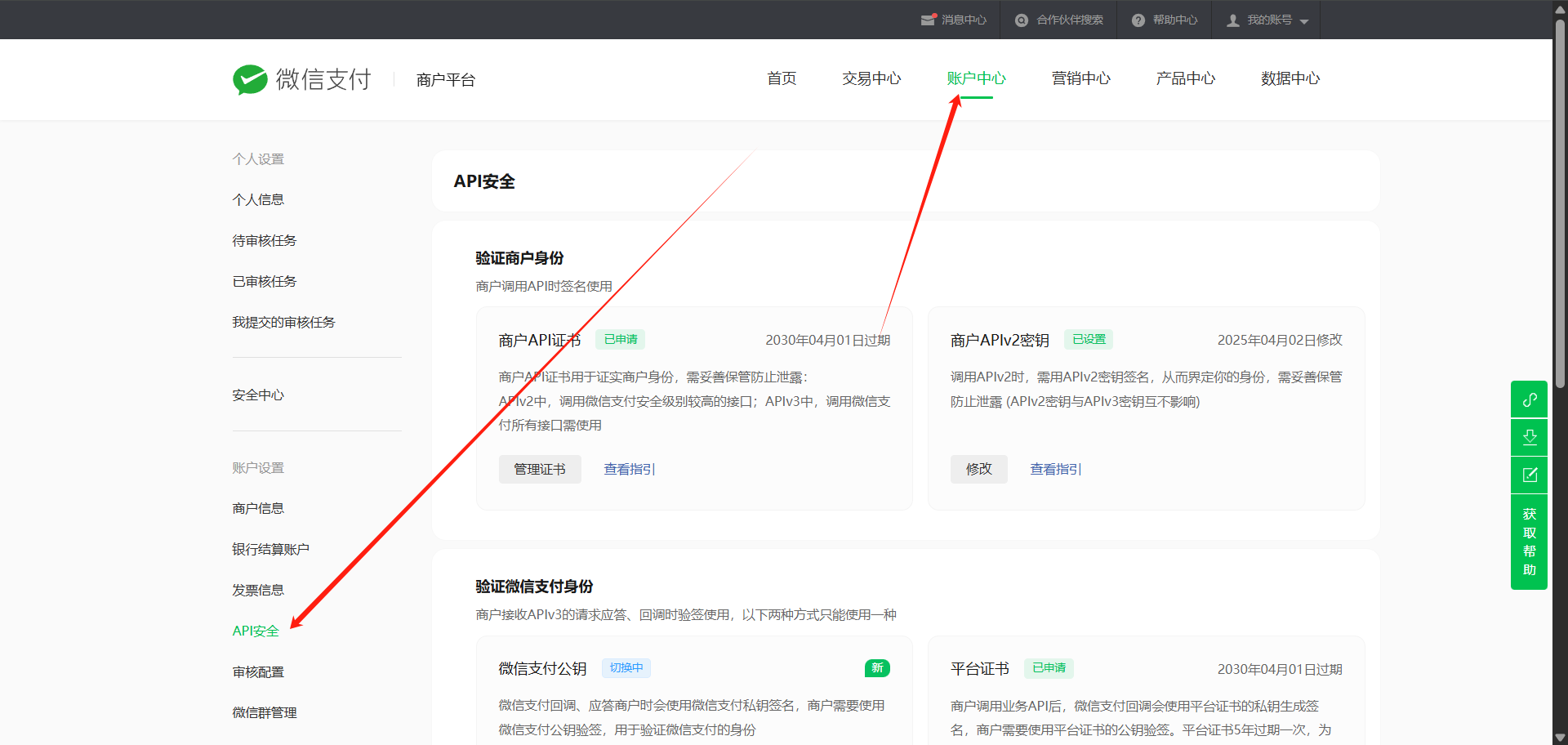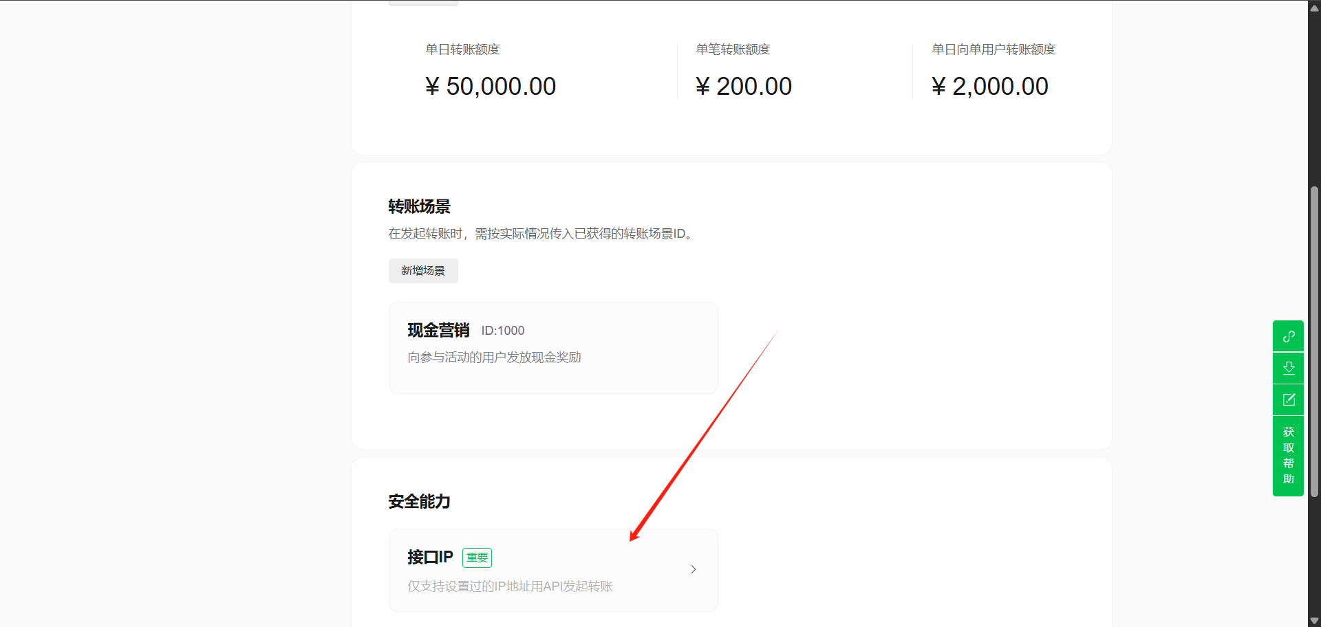 注意!!个体工商户以下功能是无法开通的 新版商家转账到零钱功能需要设置APIv3信息,具体信息去后台支付配置查看  登录微信支付平台https://pay.weixin.qq.com/,账户中心,API安全,设置对应信息,设置APiv3密钥和证书   支付公钥做到第三步就可以了,注意!!!不需要第四步作废证书,然后把对应信息填到后台支付配置,接下来的步骤去开通商转零功能。  登录商户号平台https://pay.weixin.qq.com/ 找到产品中心,往下滑,点击商家转账到零钱   新版本选择场景为《现金营销》,设置接口IP,这里的IP为服务器外网ip地址    之后后台审核打款后,去小程序确认收款   个体工商户可使用支付宝批量打款或者银行卡转账 个体户开通不了微信打款,让用户选择银行卡,支付宝,这样用户提现就必须填写支付宝账号或者银行卡信息了 然后在系统后台审核,导出支付宝账号,使用支付宝的批量打款功能打款  当然如果能找到企业注册的商户号也可以,设置到后台就行