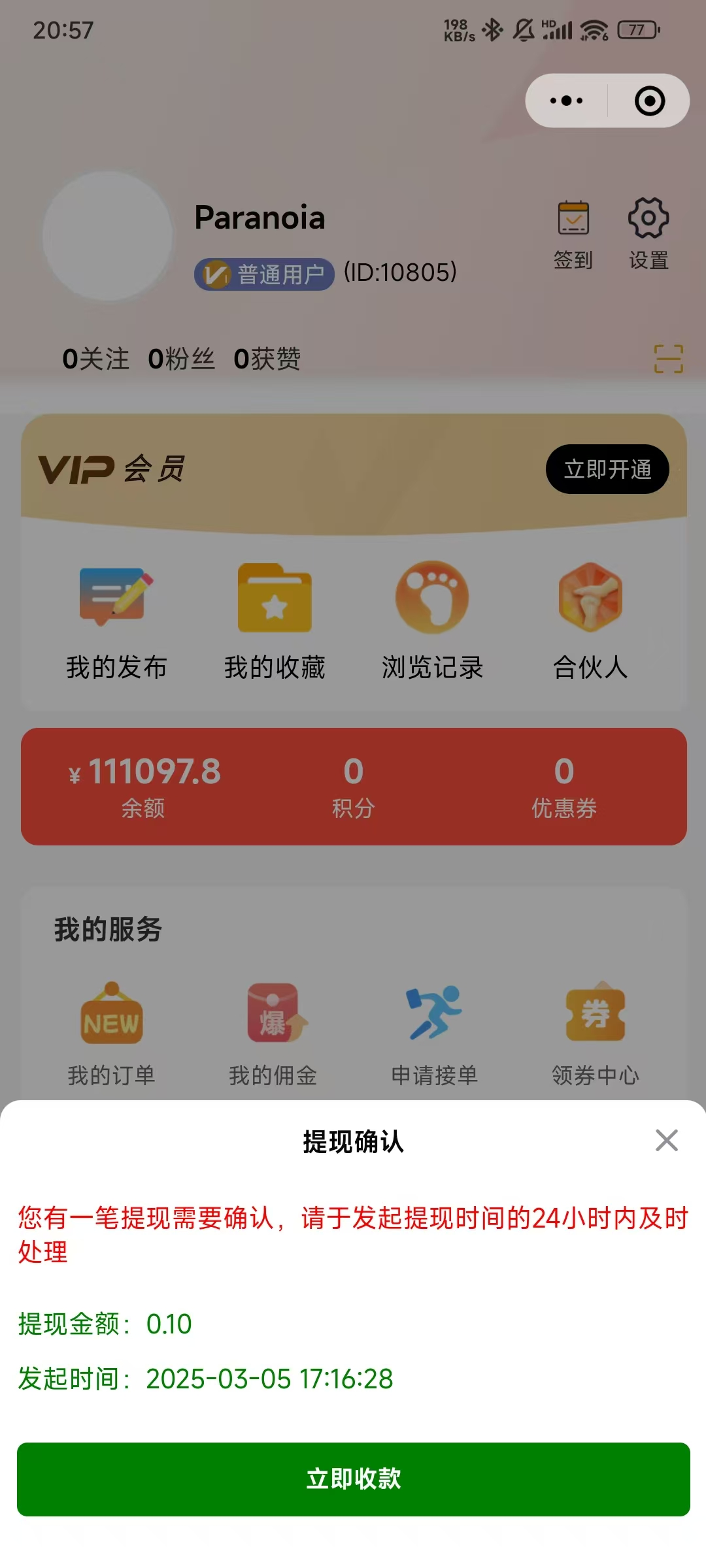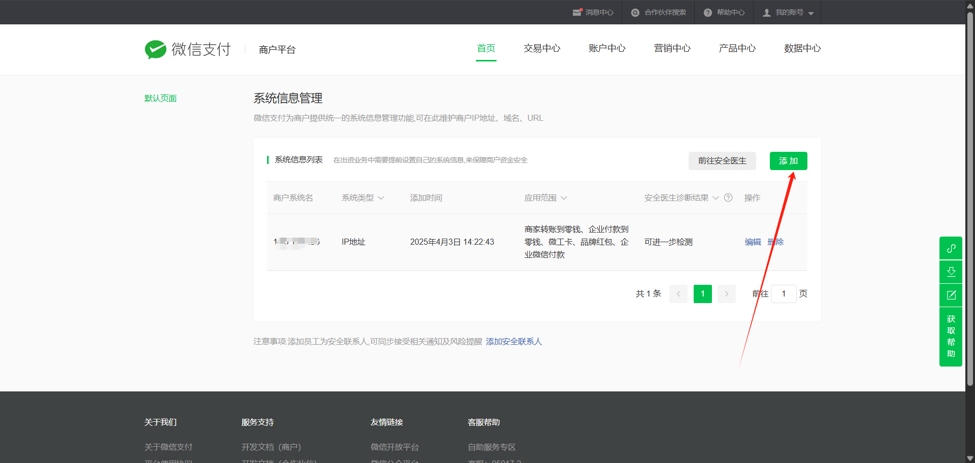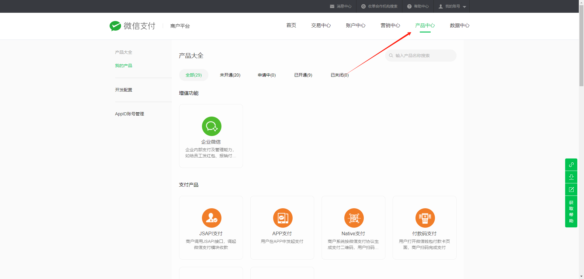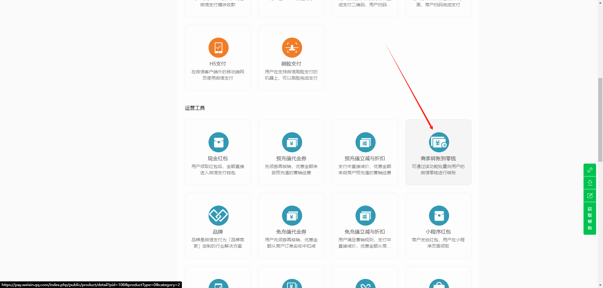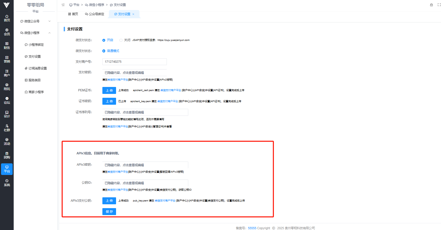 注意!!个体工商户以下功能是无法开通的 新版商家转账到零钱功能需要设置APIv3信息,具体信息去后台支付配置查看  登录微信支付平台https://pay.weixin.qq.com/,账户中心,API安全,设置对应信息,设置APiv3密钥和证书   支付公钥做到第三步就可以了,注意!!!不需要第四步作废证书,然后把对应信息填到后台支付配置,接下来的步骤去开通商转零功能。  登录商户号平台https://pay.weixin.qq.com/ 找到产品中心,往下滑,点击商家转账到零钱   新版本选择场景为《现金营销》,设置接口IP,这里的IP为服务器外网ip地址    之后后台审核打款后,去小程序确认收款   个体工商户可使用支付宝批量打款或者银行卡转账 个体户开通不了微信打款,让用户选择银行卡,支付宝,这样用户提现就必须填写支付宝账号或者银行卡信息了 然后在系统后台审核,导出支付宝账号,使用支付宝的批量打款功能打款  当然如果能找到企业注册的商户号也可以,设置到后台就行