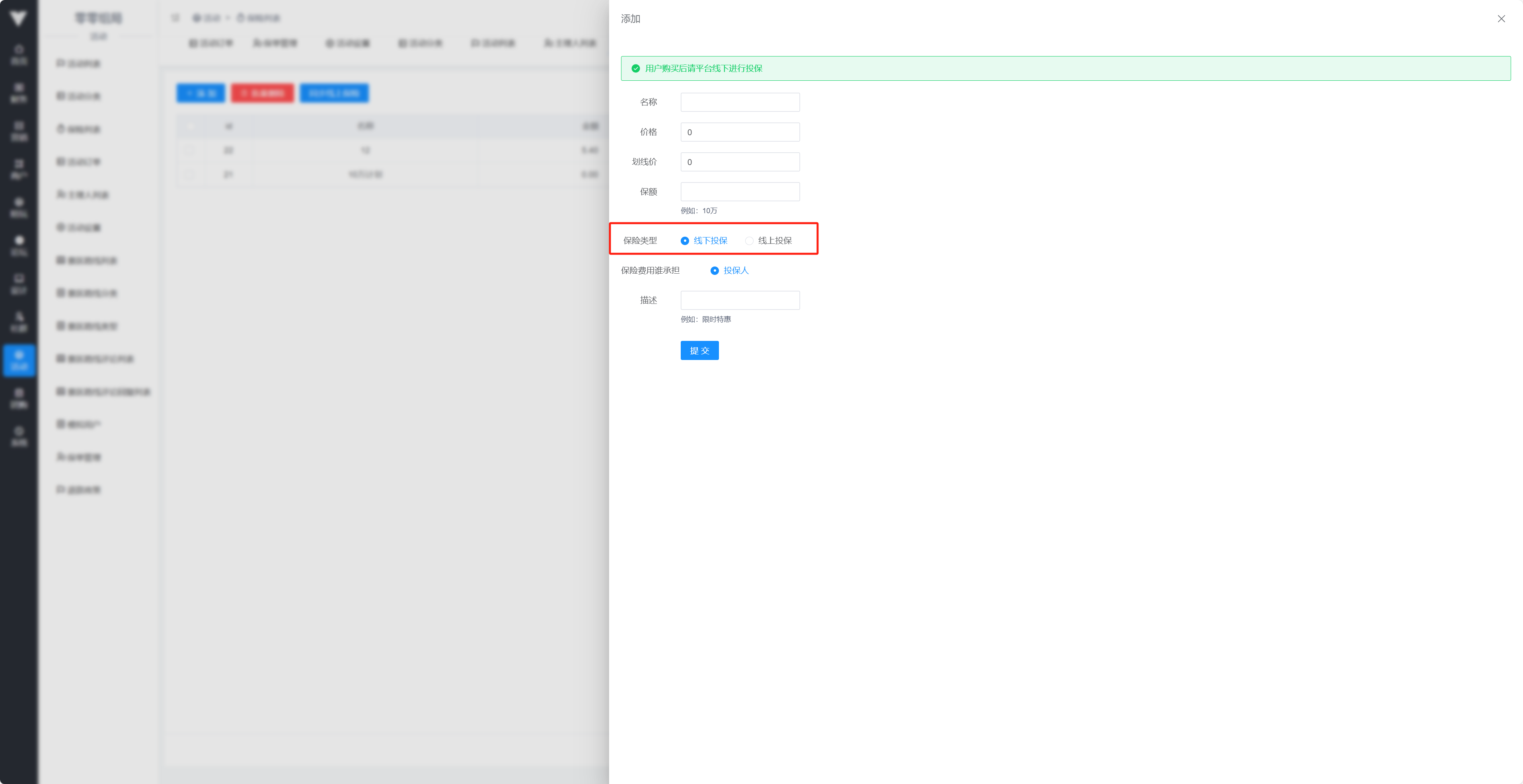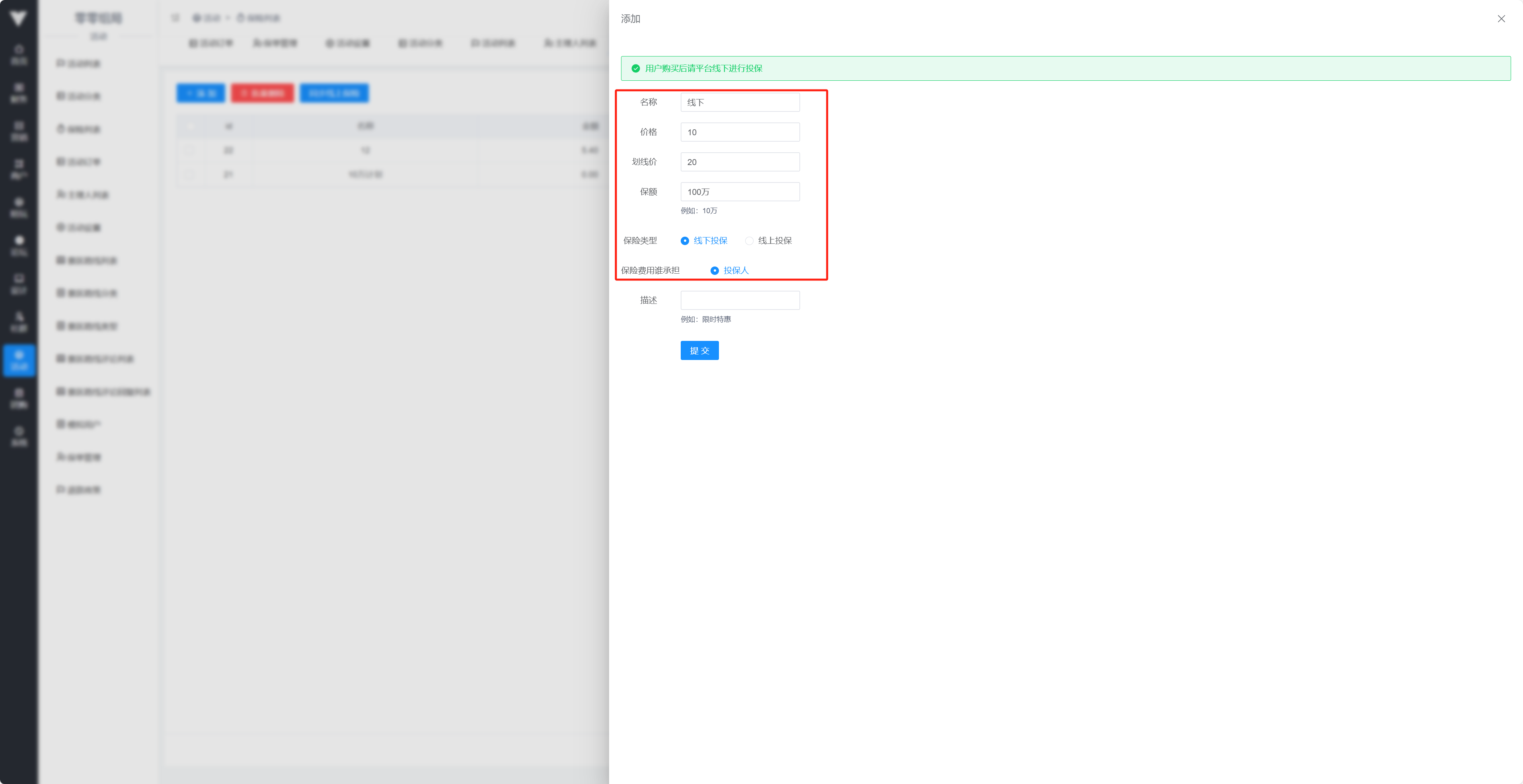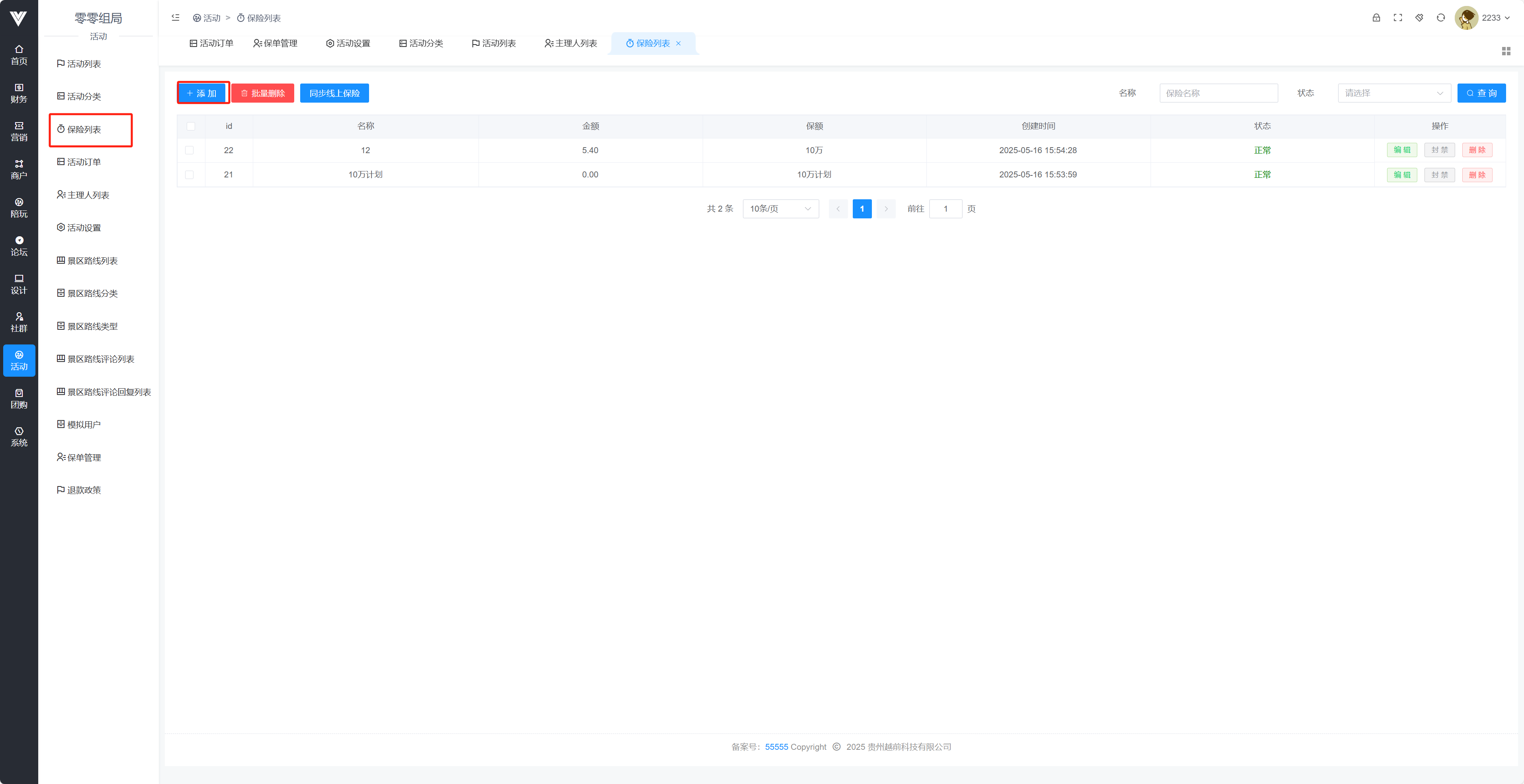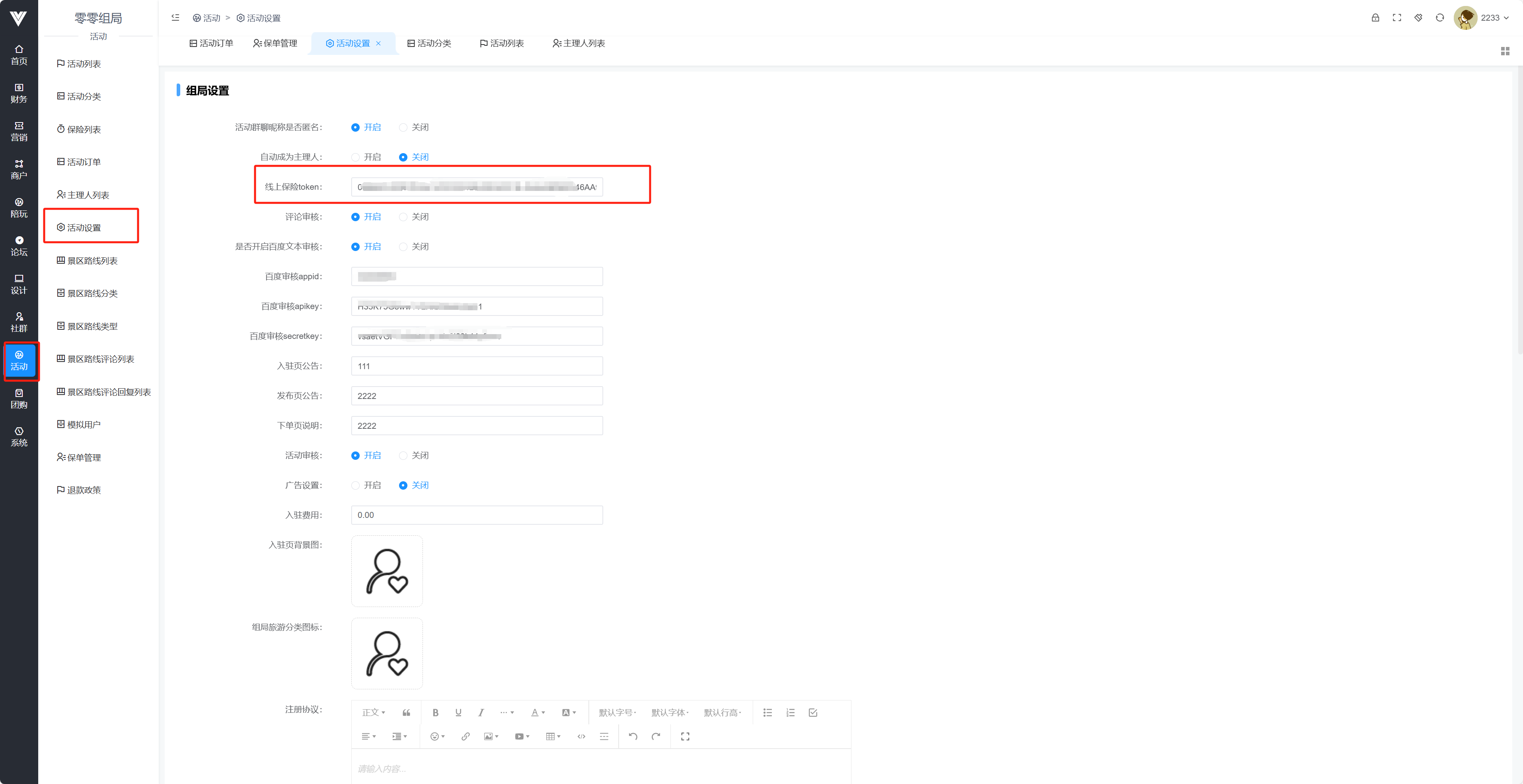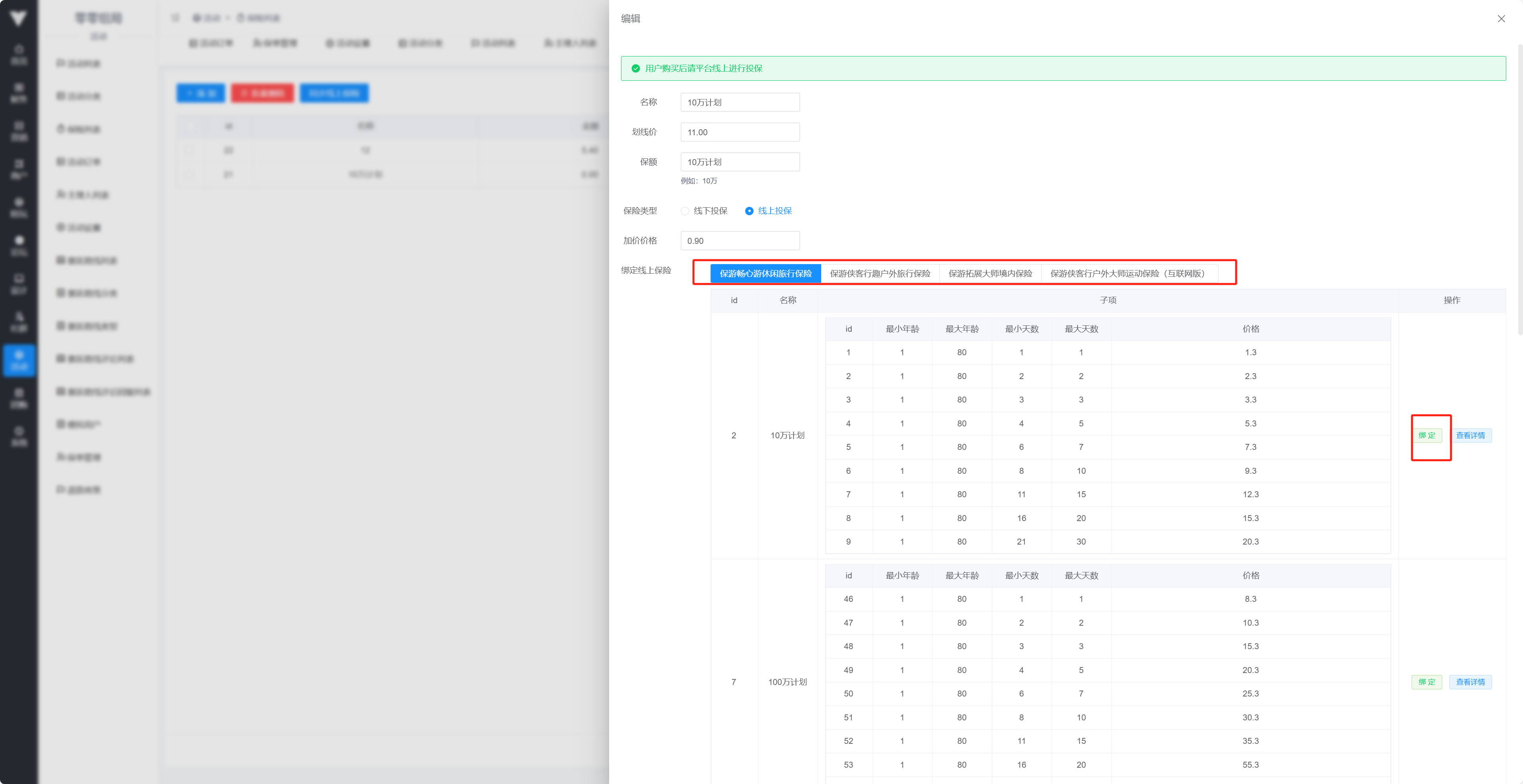 首先去开放平台注册一个账号,填写好对应信息之后登录 https://open.yueqianyun.com   登录之后点击应用→旅游保险服务,再点击立即使用    使用之后点击密钥,创建密钥,再设置一个过期时间和名称,应用到上面使用的应用,点击提交之后获得一个密钥    注意使用线上保险自动投保需要保证账户内积分足够,点击右上角的积分即可对积分进行充值,在投保对应保险时会按照保费进行比例扣除积分,若无积分则会投保失败  复制该密钥,填到对应城市的活动→活动设置内的线上保险token内  然后去保险列表内添加保险,可以添加线上保险和线下保险两种,   如果是线下保险,则设置名称,价格,划线价,保额和描述即可,线下投保的保险费用承担者只能是投保人  若是线上保险,则只需要选择对应的保险列表进行绑定即可  现在提供四大类保险,每个大类下面有不同保额的保险计划,子项内会对保险进行说明,包括投保的最小最大年龄,投保对应的天数和需要的费用,注意这是一个人的费用,自动投保时候会按照订单内的上车人数进行投保 设置好保险列表之后需要去活动分类里面给活动分类绑定对应保险,一个分类可以设置多个保险,主理人在发布活动时候可以选择后台绑定好的多个保险中的一个,用户在上车时候可以看见保险的保额和保险基本内容说明 注: 1.如果用户在同一险种的不同时间内投保是可以投保成功,但是如果两次投保时间有交叉,那么第二次投保会失败 2.投保时间计算是按照开始时间当天00:00:00到结束时间当天23:59:59 3.保险下单之后会有十秒钟左右延迟才能生成保单,请下单之后耐心等待 4.积分的扣除需要刷新页面,以消耗之后的积分显示为准 5、坑位开城市代理的,代理需要提现的,必须让代理去注册自己的开放平台账号,填自己的token!!!因为现在保险的钱都是会加给城市(如果是自己运营的不需要城市提现的可以忽略) 6、选择保险费承担对象为 投保人的话,由用户支付保险费用,城市增加余额(如果是平台运营就不用管),保险承担对象为 主理人的话 ,投保成功后会去扣主理人的余额,城市余额会增加,选择承担对象 '平台'的话,城市余额不会增加 注:参加保险的活动必须提前发活动,不可以发布当天的活动然后当天投保