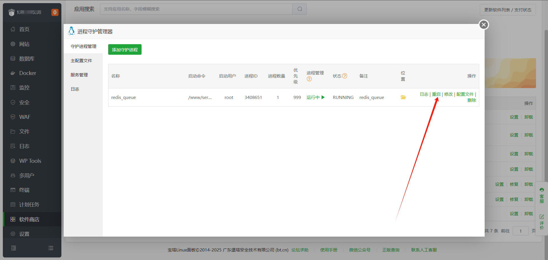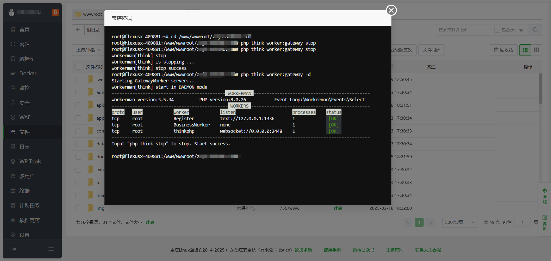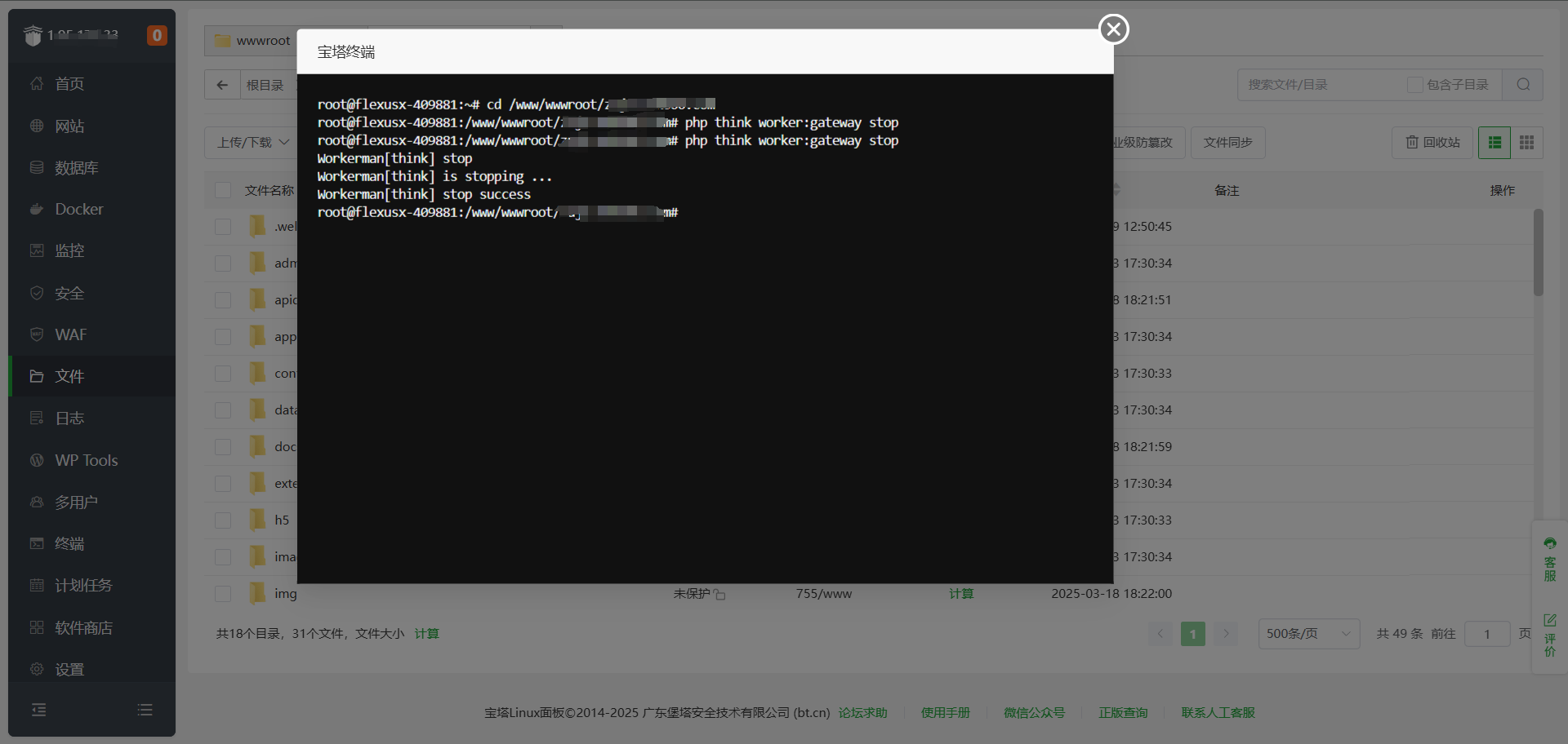 聊天信息发不出去的时候,需要执行命令,然后重启守护进程。注意!!!命令里的冒号改为英文的,不要有空格 首先,去代码更目录的终端,先执行命令: php think worker:gateway stop 注意!!!命令里的冒号改为英文的,冒号后面不要有空格   然后执行命令:php think worker:gateway -d 注意!!!命令里的冒号改为英文的,冒号后面不要有空格  最后去软件商店找到守护进程重启一下(自动发货也是需要重启守护进程)
