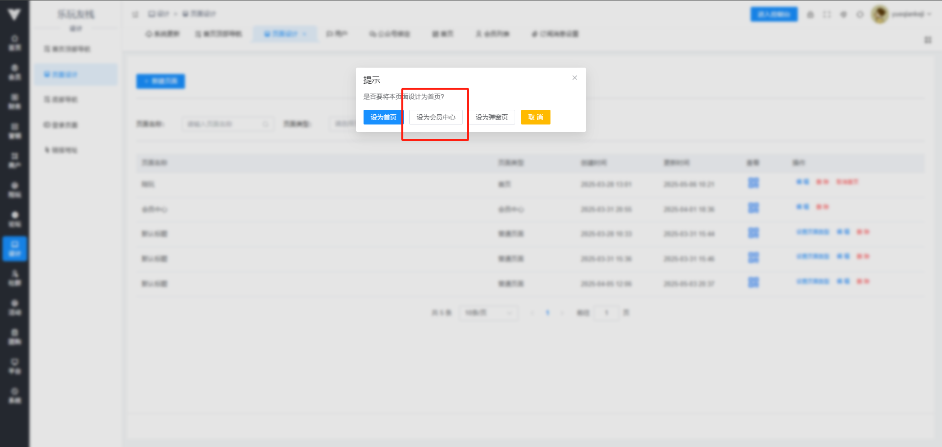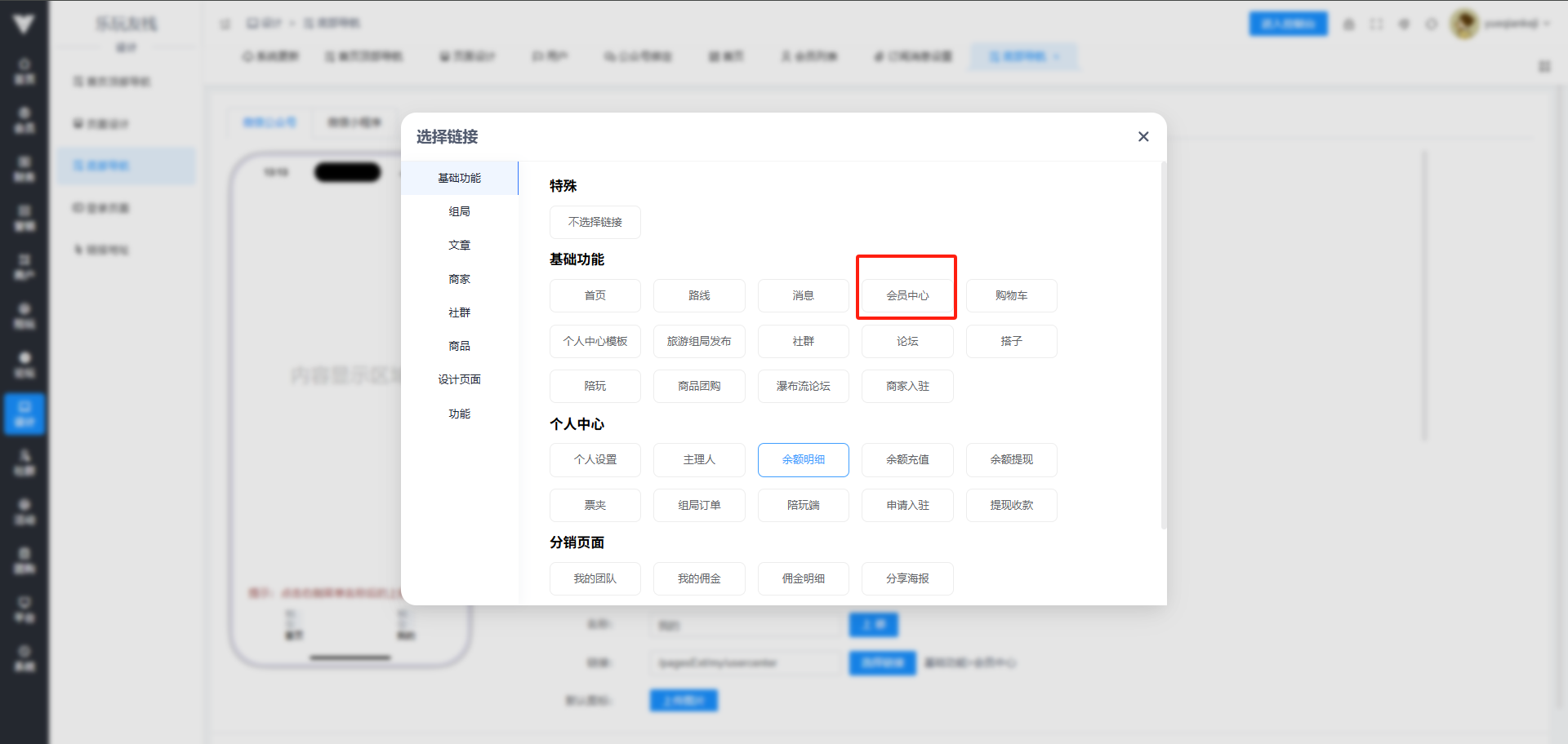 首页,页面设计,添加页面,自己diy或者按照演示后台的会员中心去设计,设计好后,页面类型设置为会员中心。  然后去底部导航选择连接,会员中心