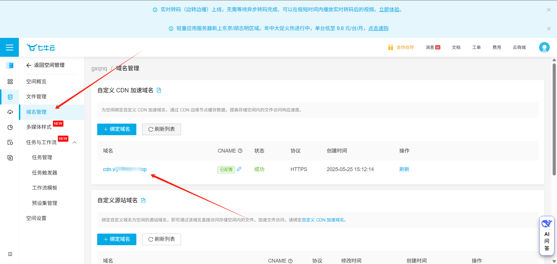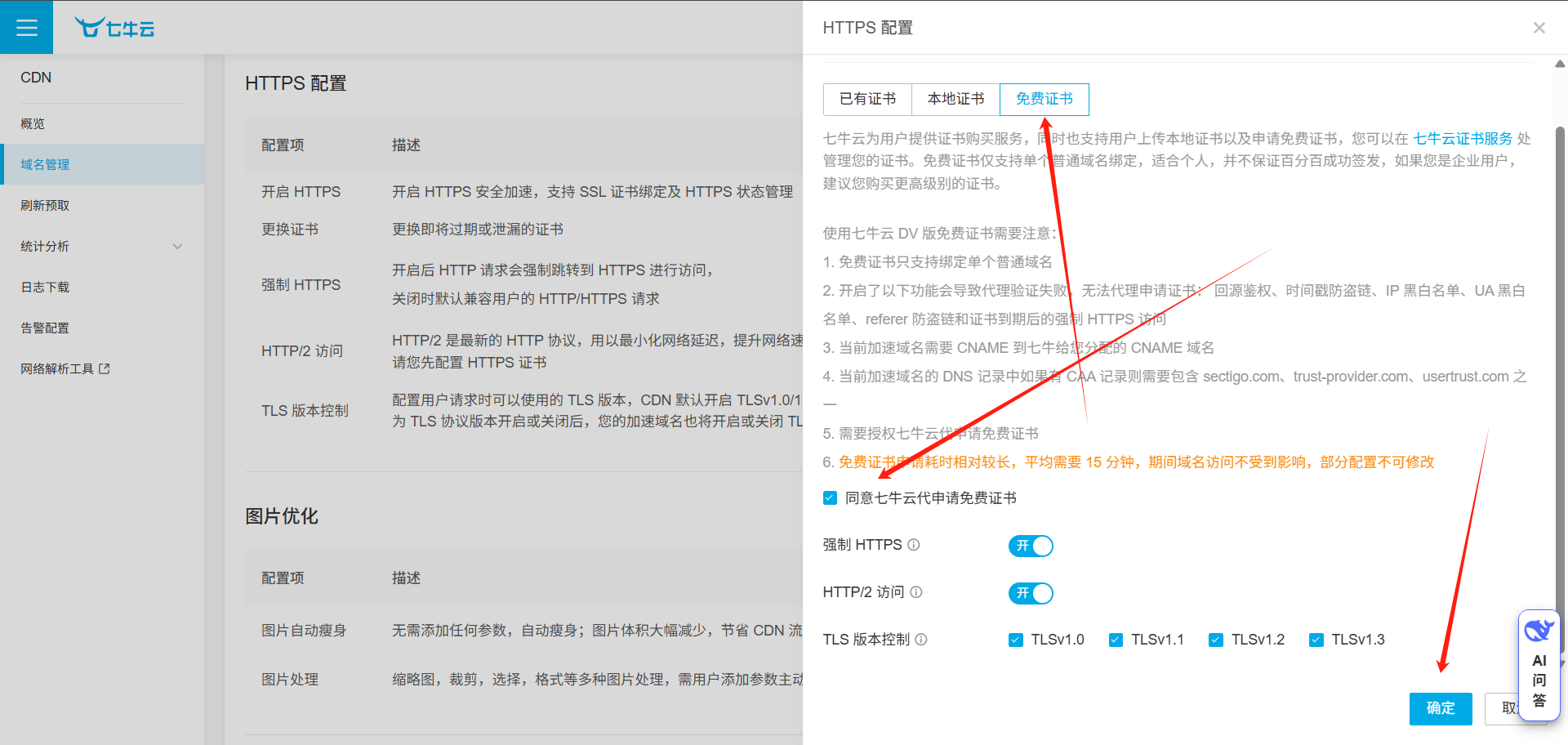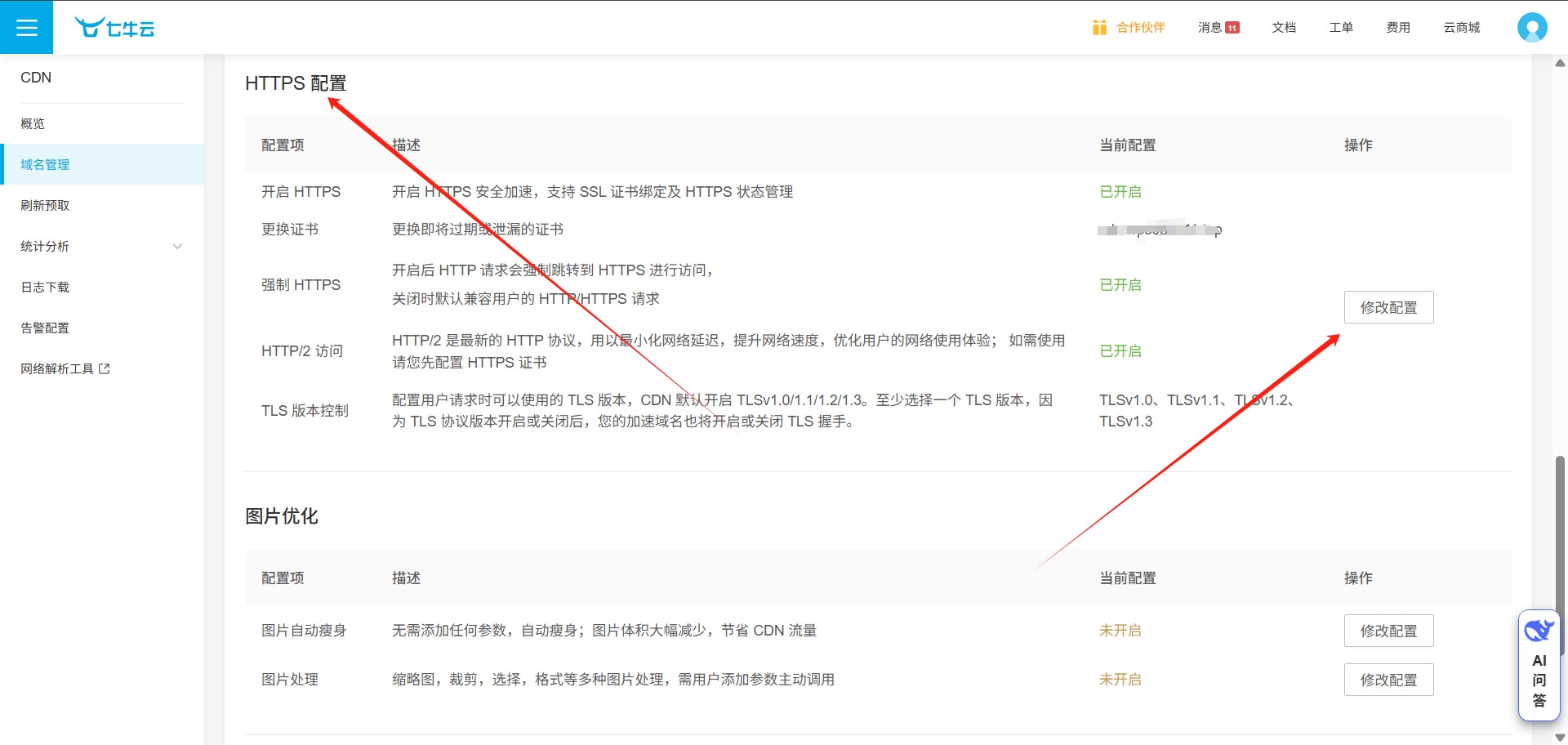 配置对象存储后,如果图片访问不了,要么是欠费了,去充值就行,还有就是cdn域名的ssl正式过期了,去续签 首先登录七牛云,进控制台  选择对象存储  选择空间管理,选中存储桶  选中域名管理,选中域名  找到https配置,修改配置  选择免费证书,申请就行了,申请后等待七牛云配置号,图片就可以访问了