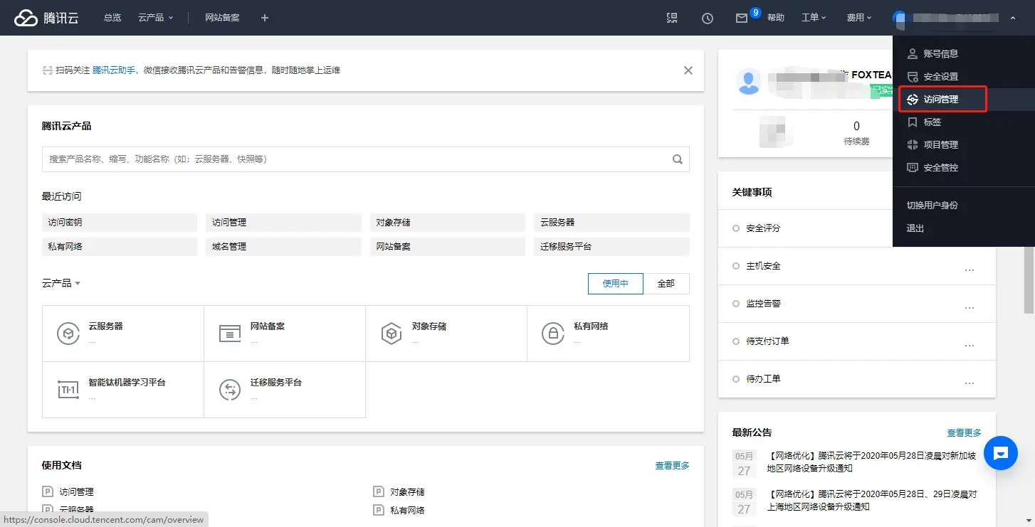 腾讯云存储配置 腾讯云存储配置说明 1、登录腾讯云后台-产品中心-对象存储  2、点击存储桶列表-创建存储桶,所在地跟服务器所在地一致,访问权限选择公有读私有写,其他使用默认设置  3、点击刚才创建的存储桶,找到存储桶名称、bucket所属地域和访问域名,并填写到后台。  4、点击右上角头像个人中心-选择访问管理-访问秘钥-API秘钥管理,将此处的App ID,Secret ID,Secret Key复制到后台。