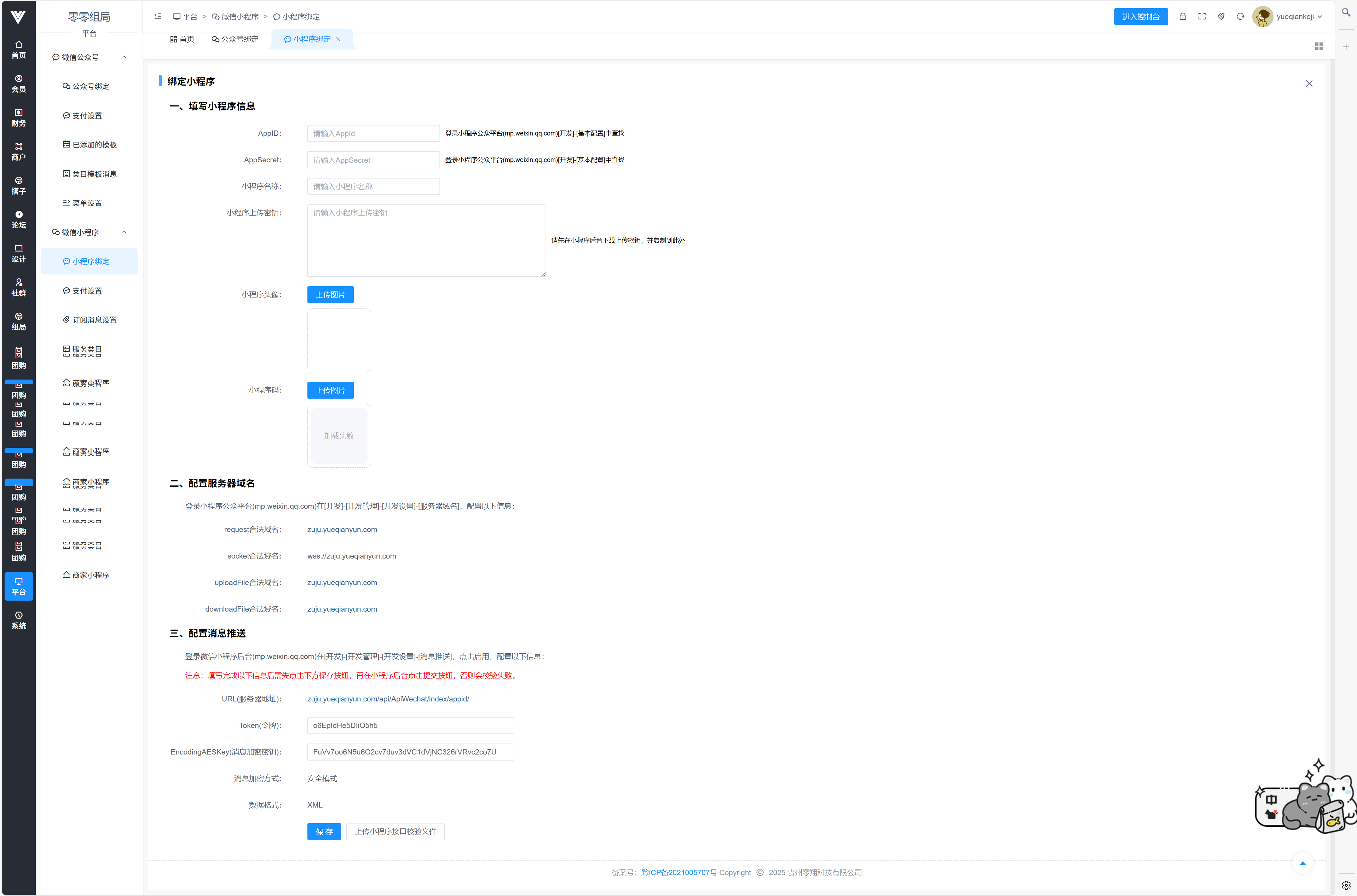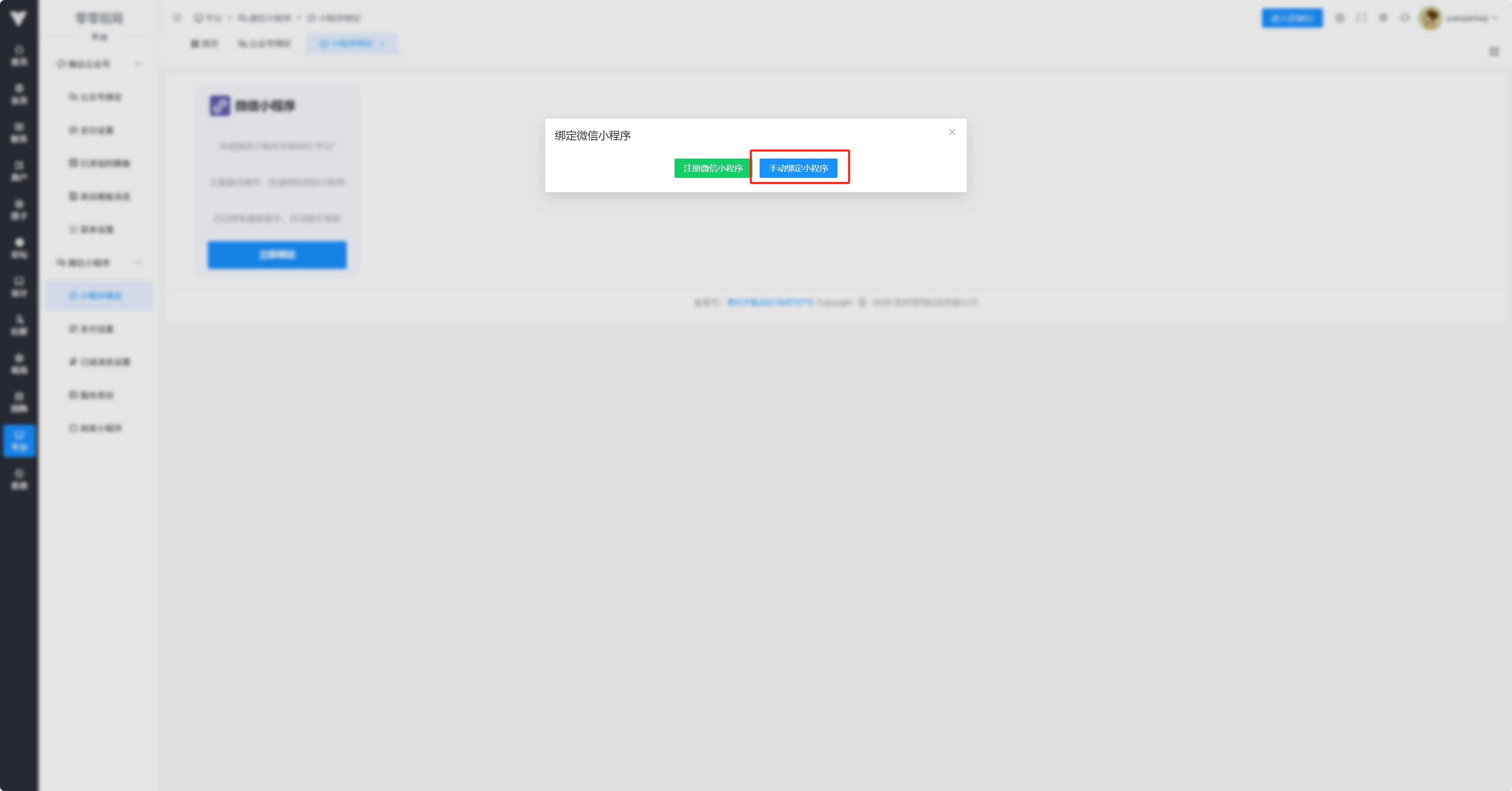1:登录系统后台绑定微信小程序,点击l立即绑定,如果没有小程序就点击注册微信小程序,有的话就点击手动绑定微信小程序,然后填写信息(信息怎么找,看提示小字)    登录微信公众平台,上传白名单必须关闭  2: