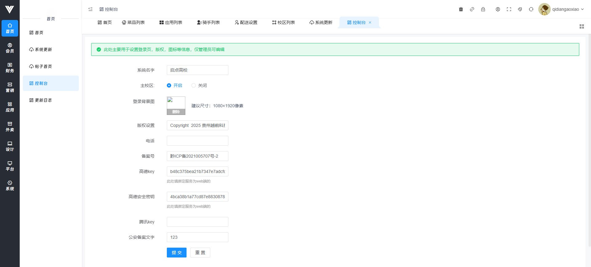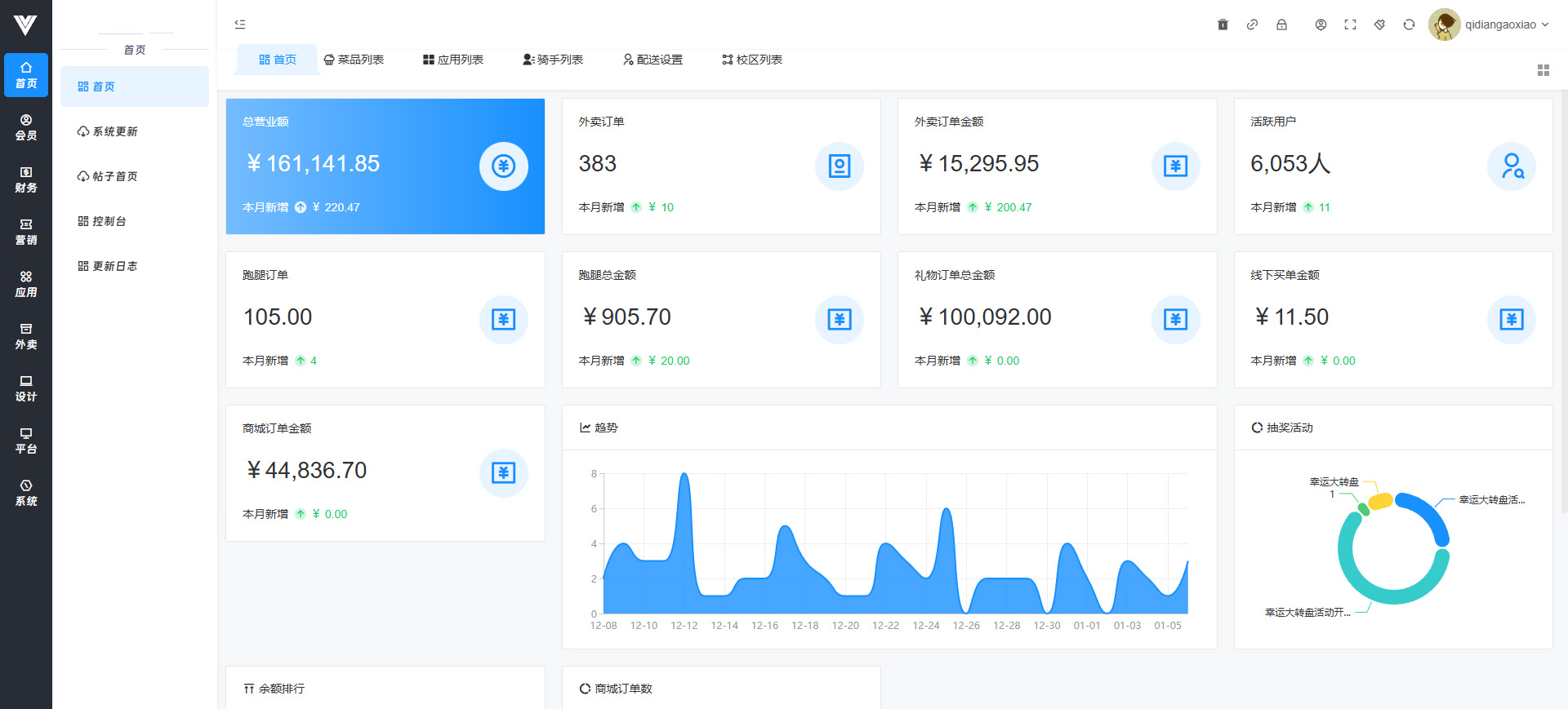 **1.首页** 首页展示了本校区商城或者本商家的订单销量金额等数据,如图所示  **2.系统更新** 每当后台有新版本时在此处更新,可以看到更新内容,可以点击立即升级进行更新,若立即升级失效,可以依次点击下方下载更新包→解压更新包→更新数据库进行更新,注意,现在更新包很大,统一用界面下方的三步进行更新  **3.控制台** 可以设置后台登录页面背景图,页面下方版权名称,高德地图key,高德key在此处设置才可以进行地址选取和查看,主校区设置打开的话就可以在小程序进入主校区,关闭的话则不行  **4.更新日志** 可以查看 系统的历史更新日志详情 **5.帖子首页** 可以查看帖子的统计数据