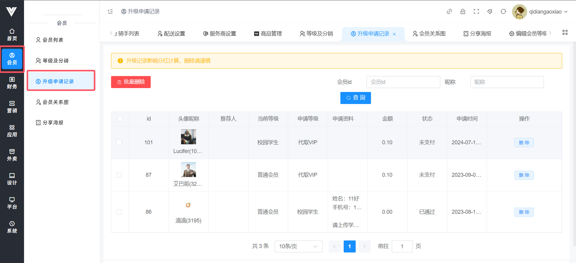查看会员申请等级升级的记录和状态,升级记录影响分红计算,删除请谨慎,可以通过会员ID和会员昵称进行搜索