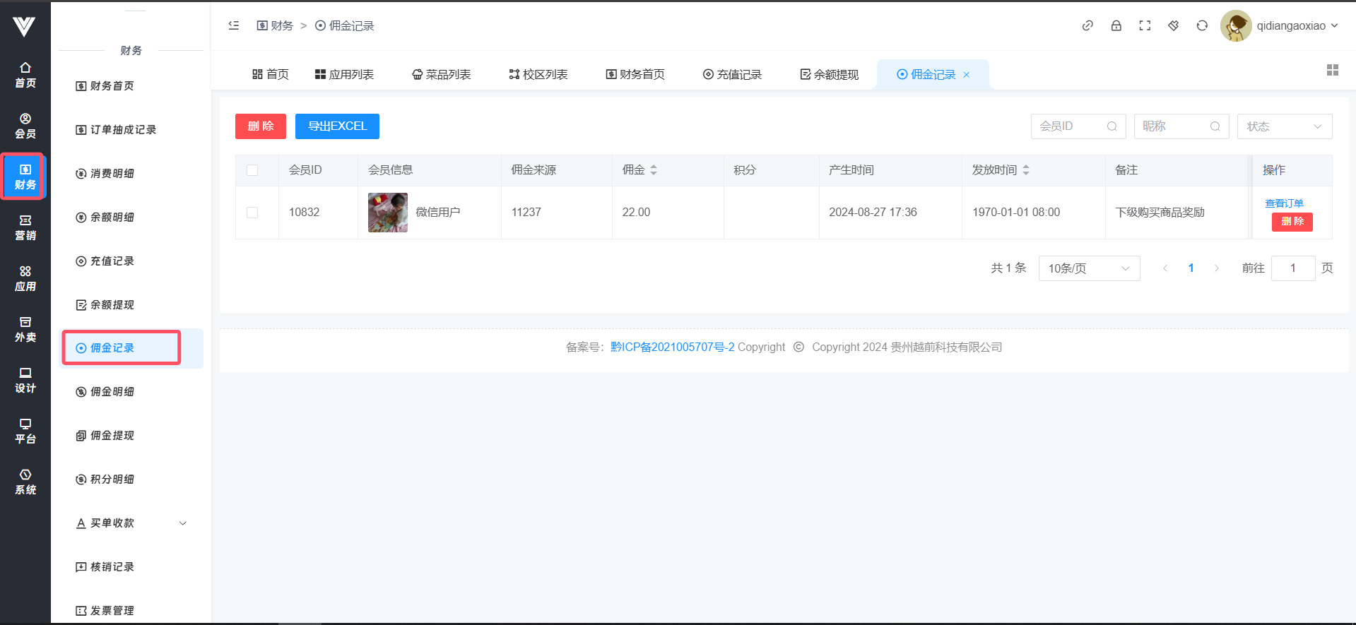 此处显示的是上级会员的佣金明细,包括会员ID,会员信息,佣金来源,佣金数额,产生的积分,佣金产生时间,备注内可以查看佣金来源详细说明,还可以查看订单状态,还有佣金发放的状态,