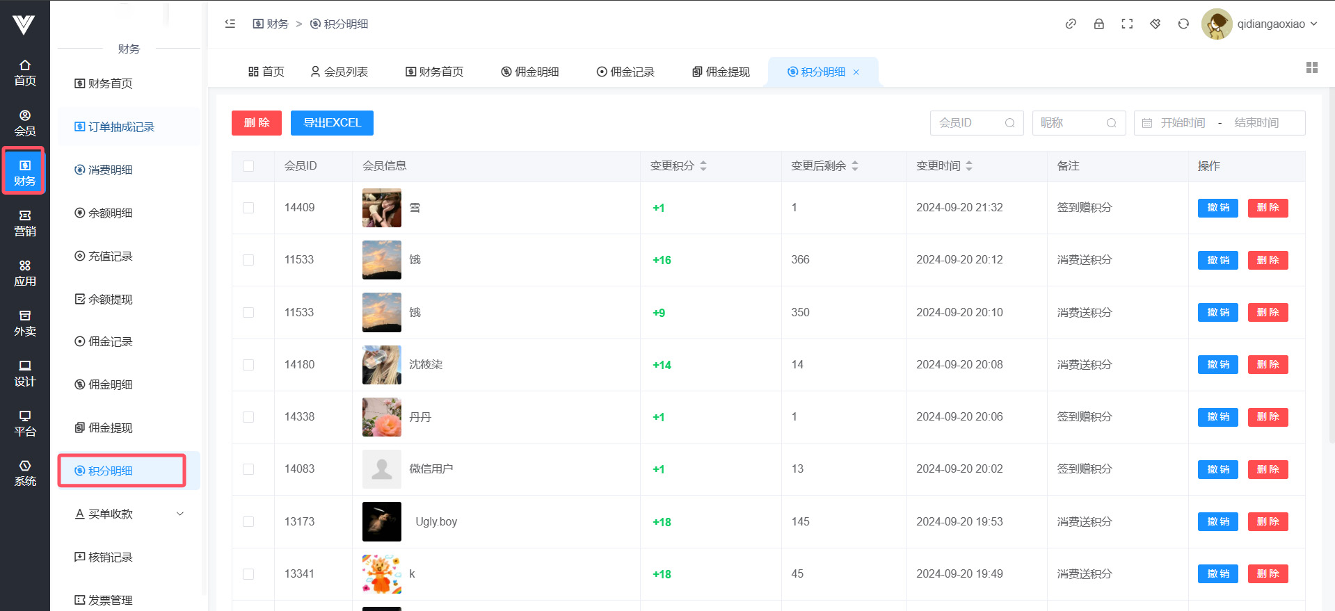 积分明细只有注平台有,记录了本平台所有会员的积分变动情况,如下图所示
