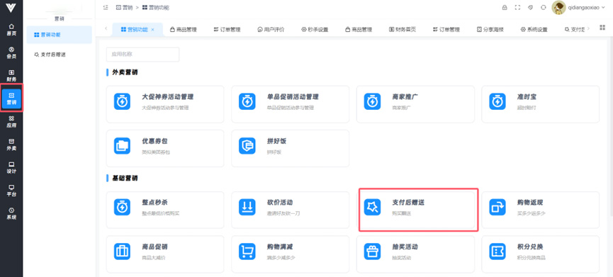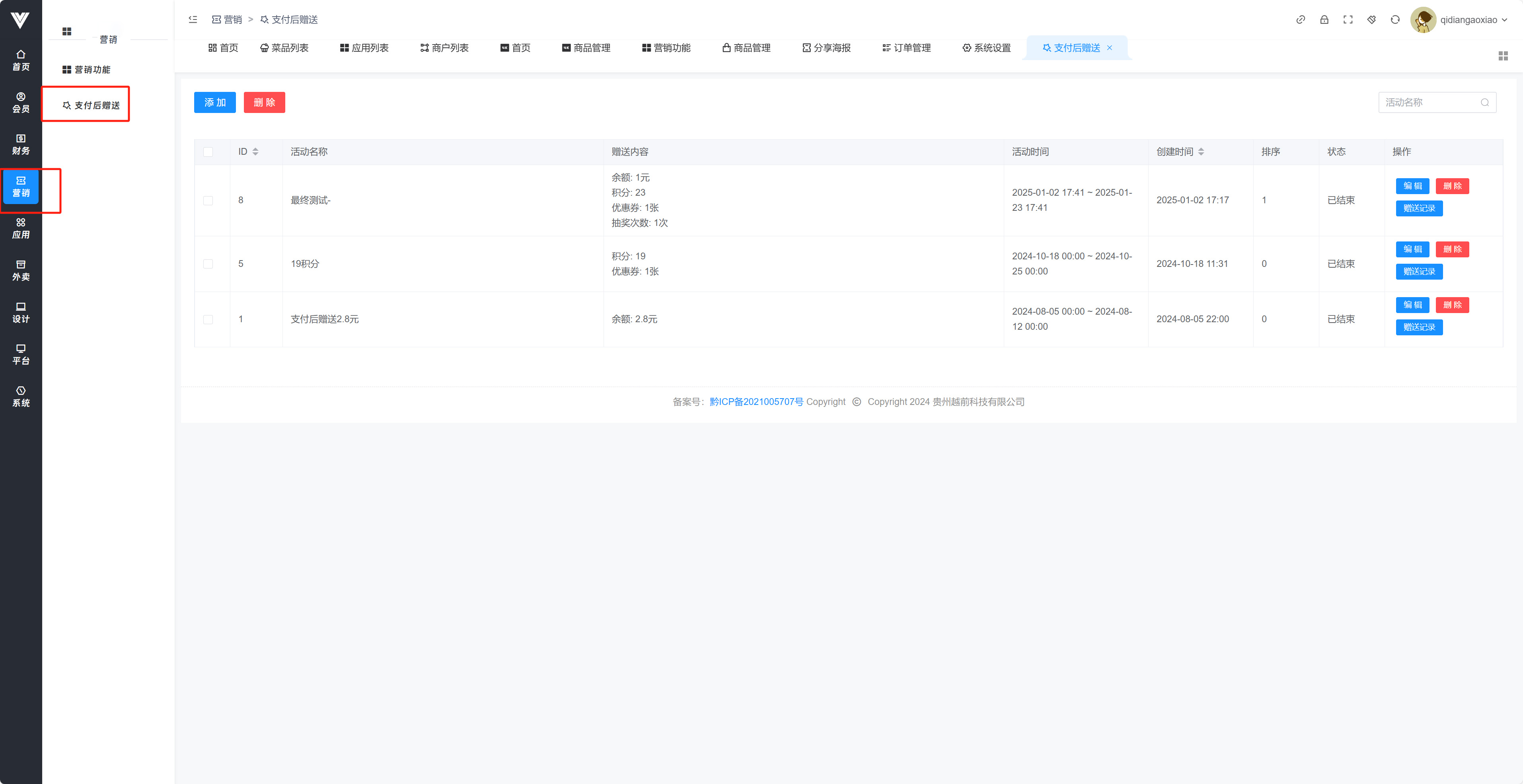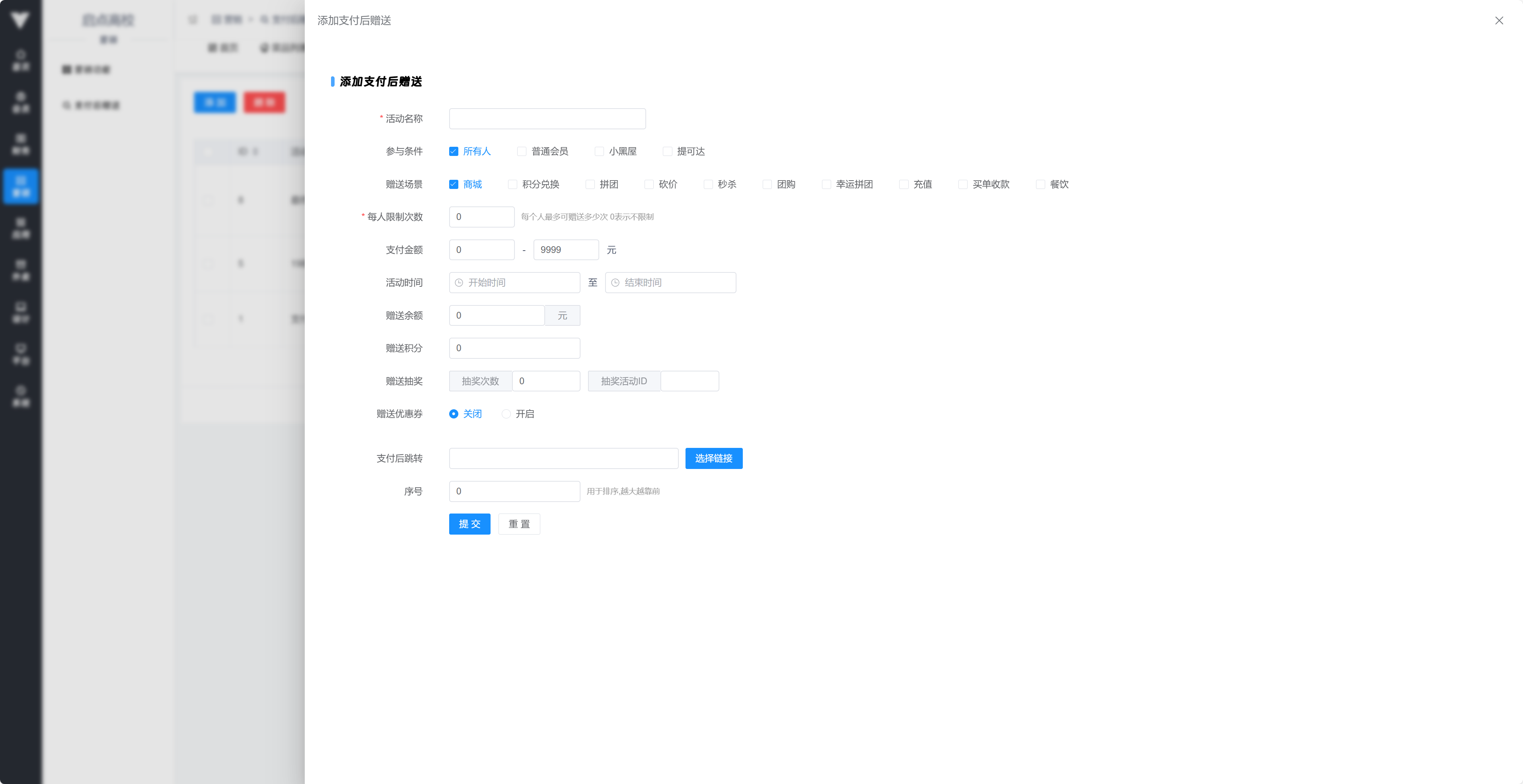 **支付后赠送** 功能:设置用户在支付后赠送礼物  点击添加之后进行设置  可以设置支付赠送活动的名字,参人条件,赠送发生时的场景,设置每人可以触发的次数,支付金额的限制,活动开始和结束时间,赠送余额的大小,赠送积分的大小或者赠送抽奖次数,也可以自定义赠送的优惠券,设置用户在支付后会跳转至什么地方
