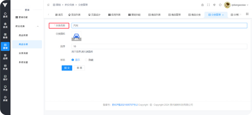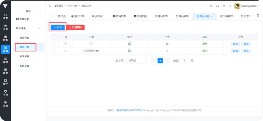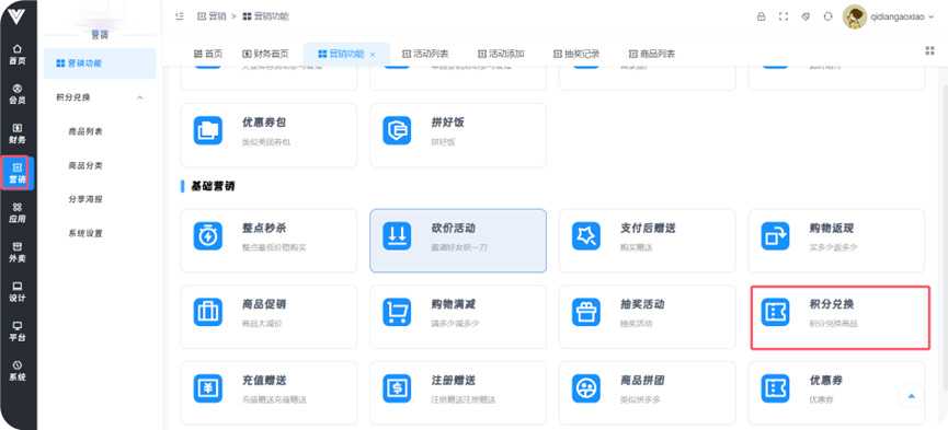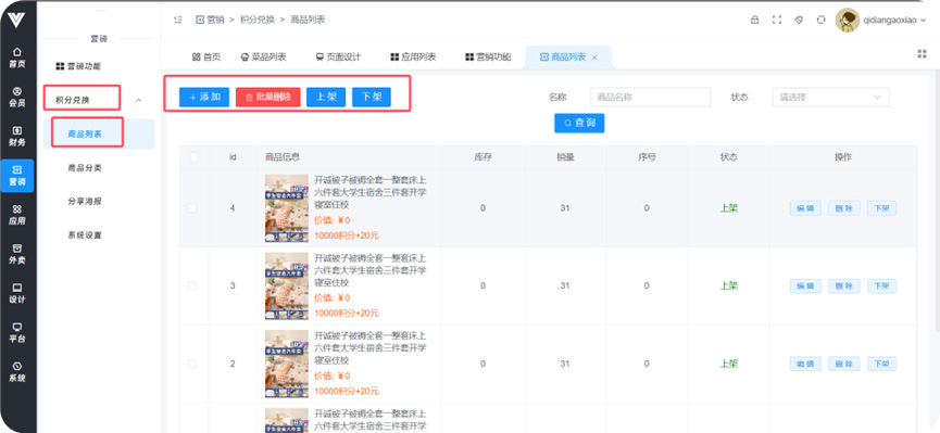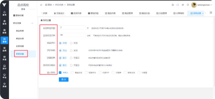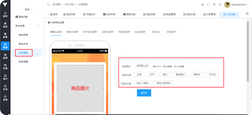 **积分兑换** 功能:使用客户平时积累的积分兑换设定好的商品奖励  **1.商品列表**  **2.商品分类** 给商品设置分类便于管理和查询   **3.分享海报** 进行活动分享海报的页面设置  **4.系统设置** 在此设置兑换商品信息相关信息,包括下单后多久关闭订单,多久自动收货,商家瓶评价是否打开等条件
