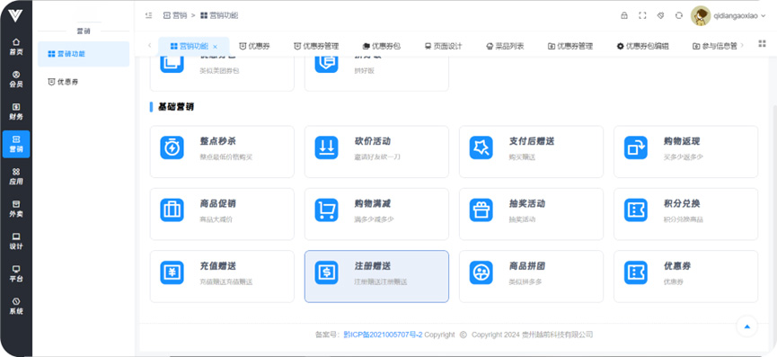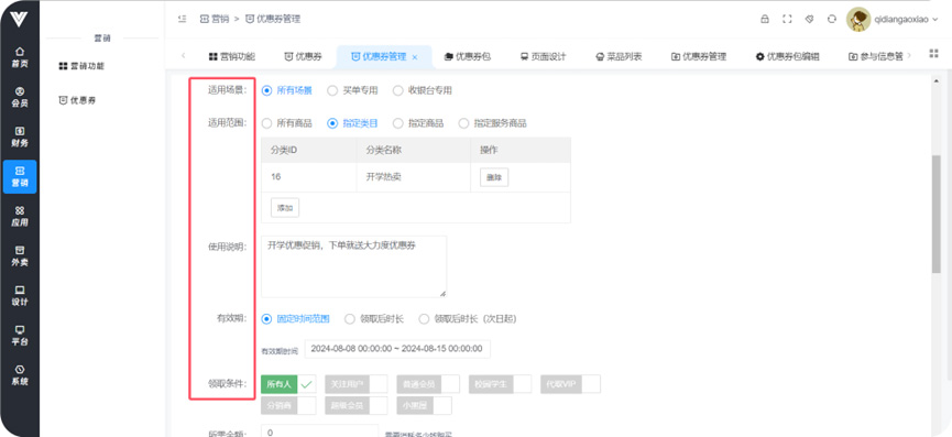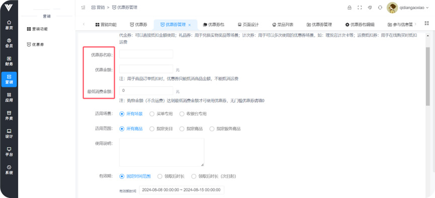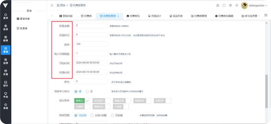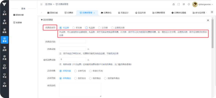 **优惠券** 功能:设置各种类型优惠券产生,使用户可以在领券中心获取到,或者设置优惠券为支付金额满一定数目之后赠送,或者在买指定商品时赠送  设置类型  设置优惠券基础信息  设置优惠券领取条件、使用时效和范围  设置优惠券的购买条件和此优惠券活动的时间  设置优惠券在领券中心的显示条件以及优惠券使用范围和优惠券使用后的效果,还有优惠券的其他获取途径,包括支付满一定金额之后赠送以及购买特定商品之后赠送