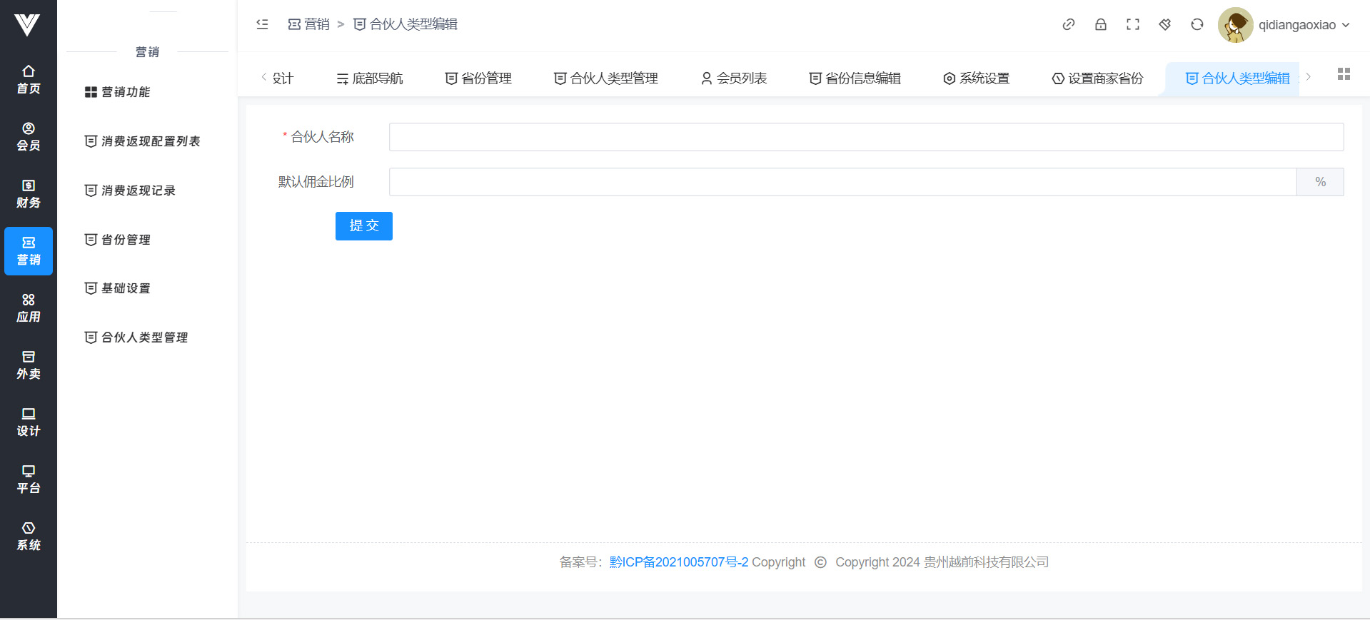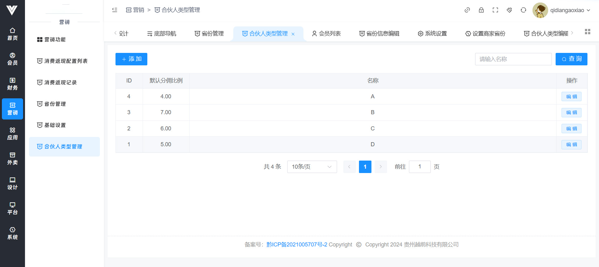 在此处设置好合伙人的类型和分账比例,对应的设置具体合伙人的地方在会员编辑内