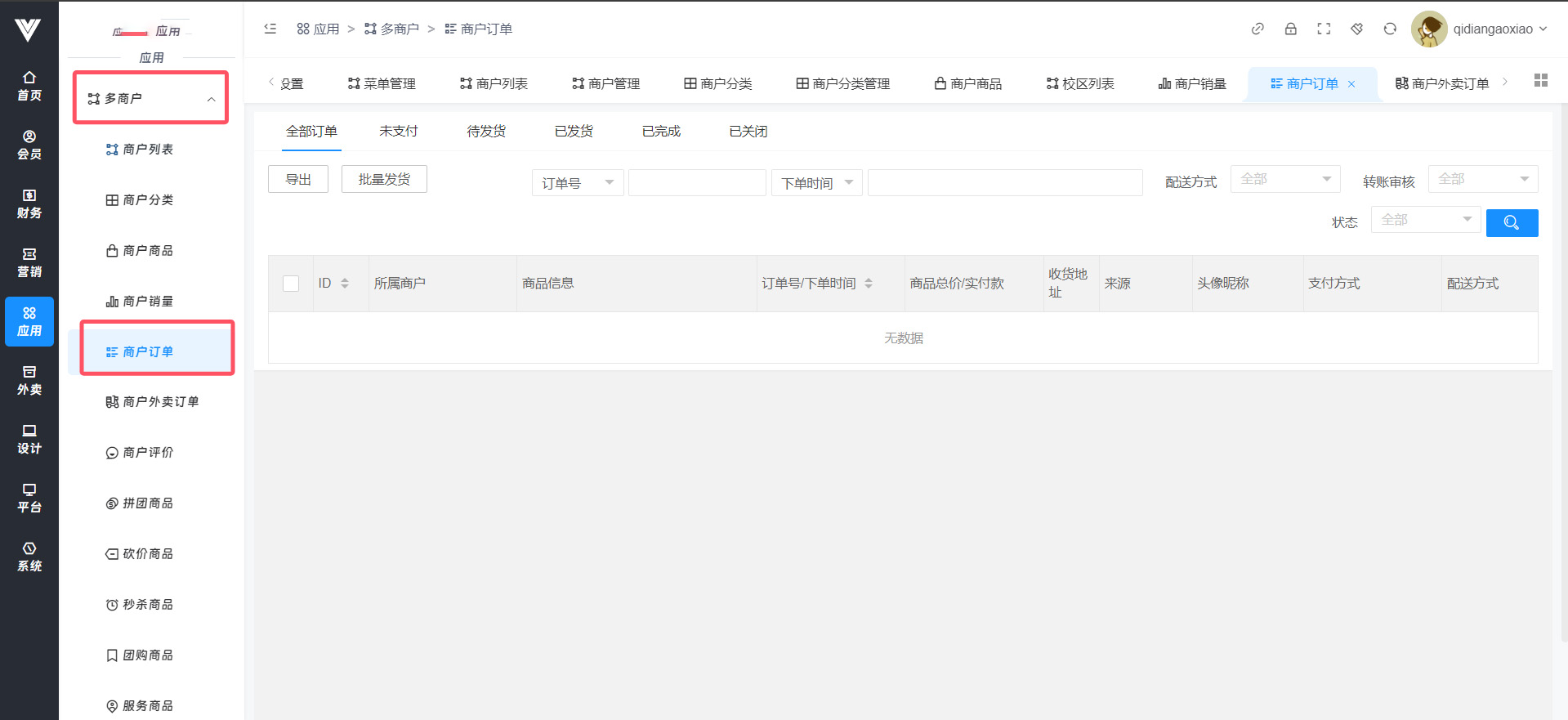 **商户订单** 此处查看的是校区平台商城团购的订单,如图所示