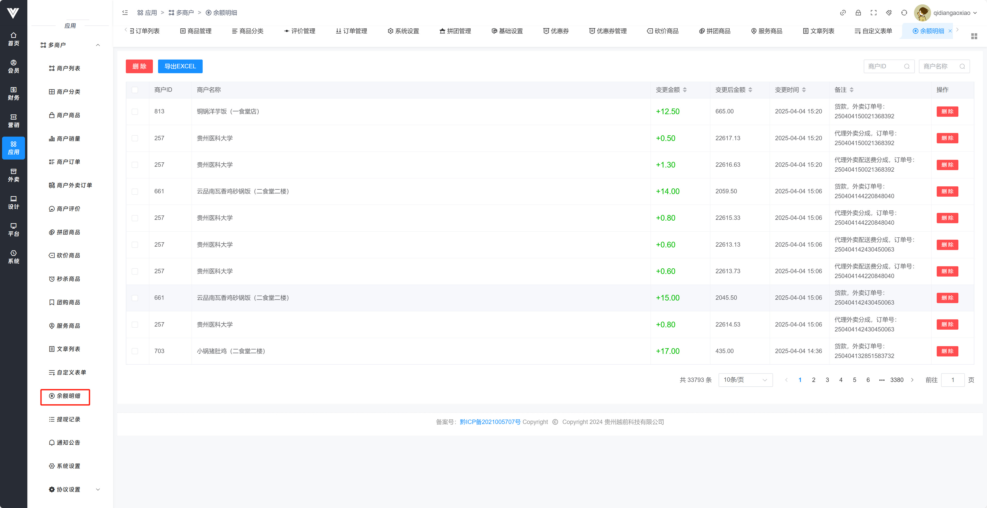 **余额明细** 此处可以看到分校区下商家的明细表,如图所示